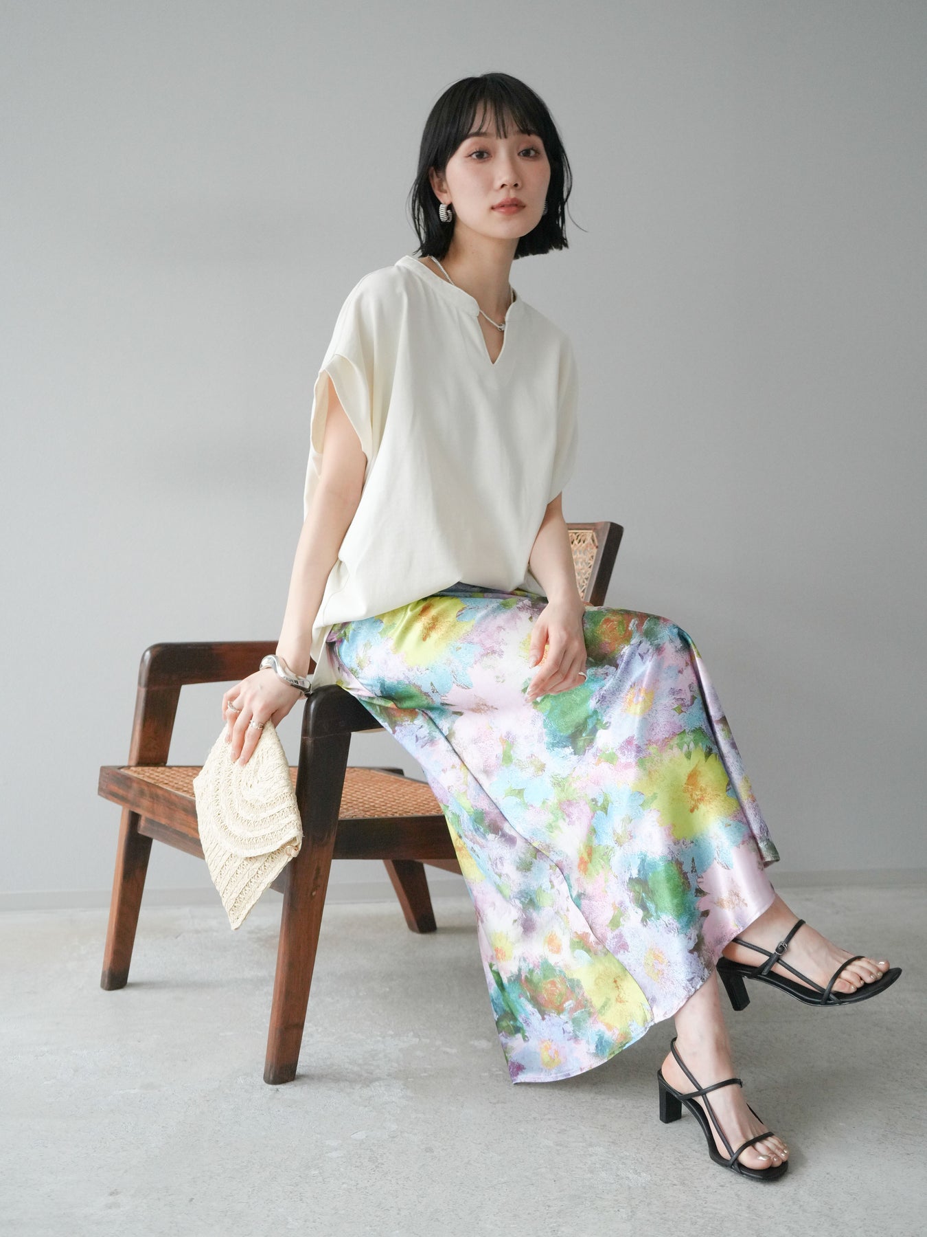 柔らかなコットン素材を使用し、リラックス感たっぷりのルーズシルエットが魅力のTシャツ。キーネックデザインがさりげない抜け感を演出し、顔周りをすっきり見せてくれます。ドルマンスリーブで動きやすく、こなれた大人カジュアルスタイルにぴったりな一枚です。デニムからスカートまで幅広いボトムと好相性。 ※ボトムス、キャミソール(インナー)以外の商品は一律でインナーは付属していません