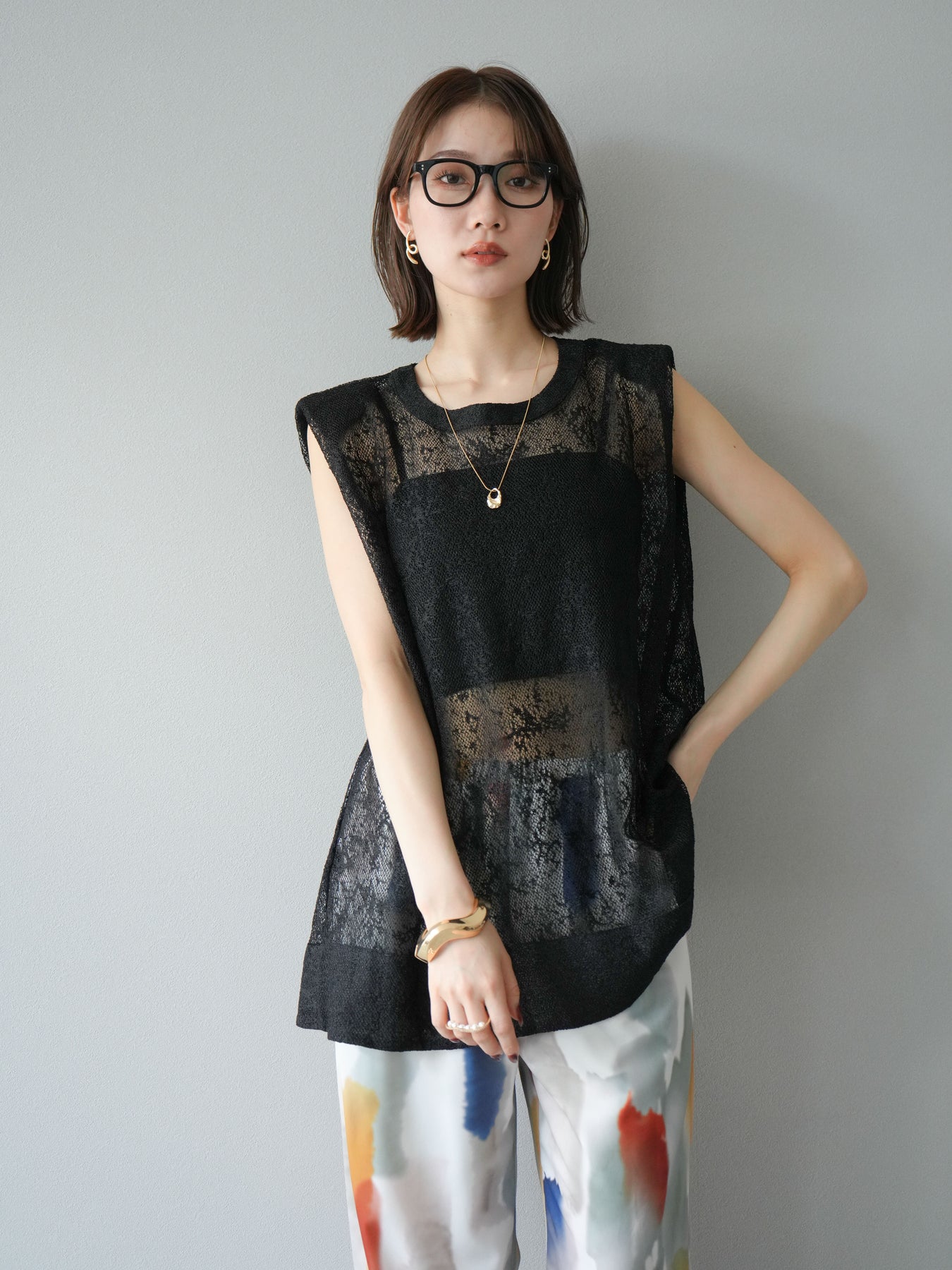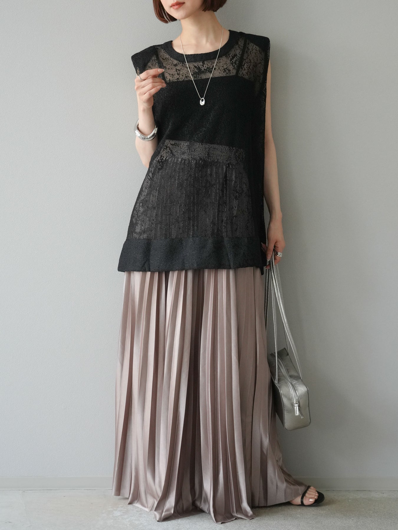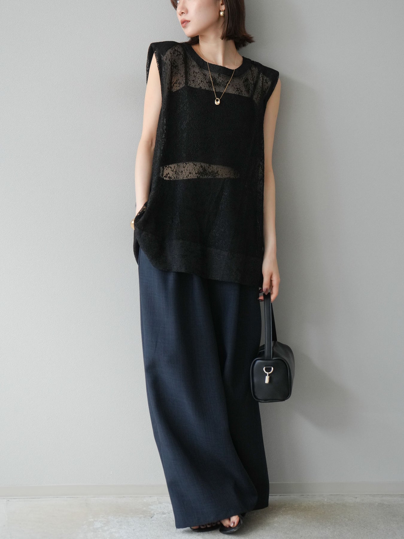 繊細なレースにラメ糸を織り交ぜた、華やかさと上品さを兼ね備えたシャイニープルオーバー。透け感のある軽やかな素材が、レイヤードスタイルに抜け感をプラス。長めの丈感で気になる腰まわりも自然にカバーしてくれます。カジュアルなパンツと合わせても女性らしい印象に仕上がる、着回し力の高い一枚です。 ※ボトムス、キャミソール(インナー)以外の商品は一律でインナーは付属していません。