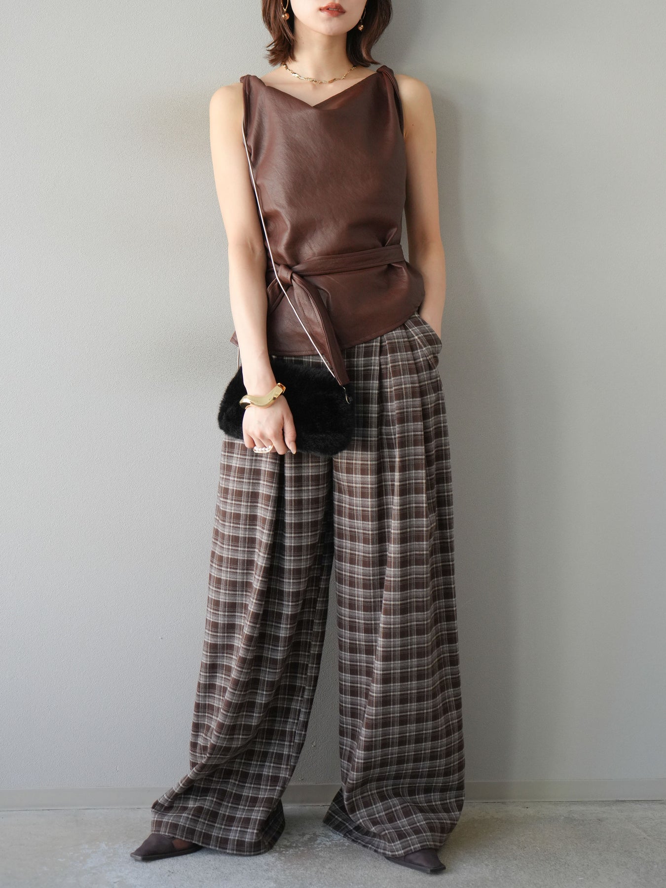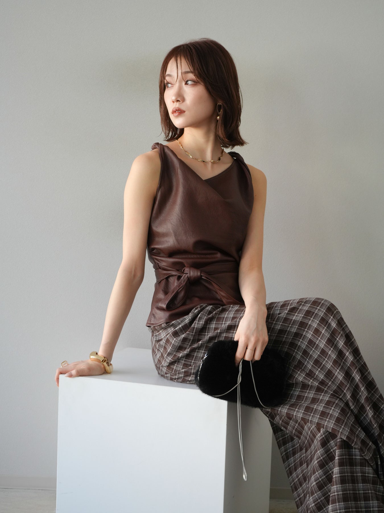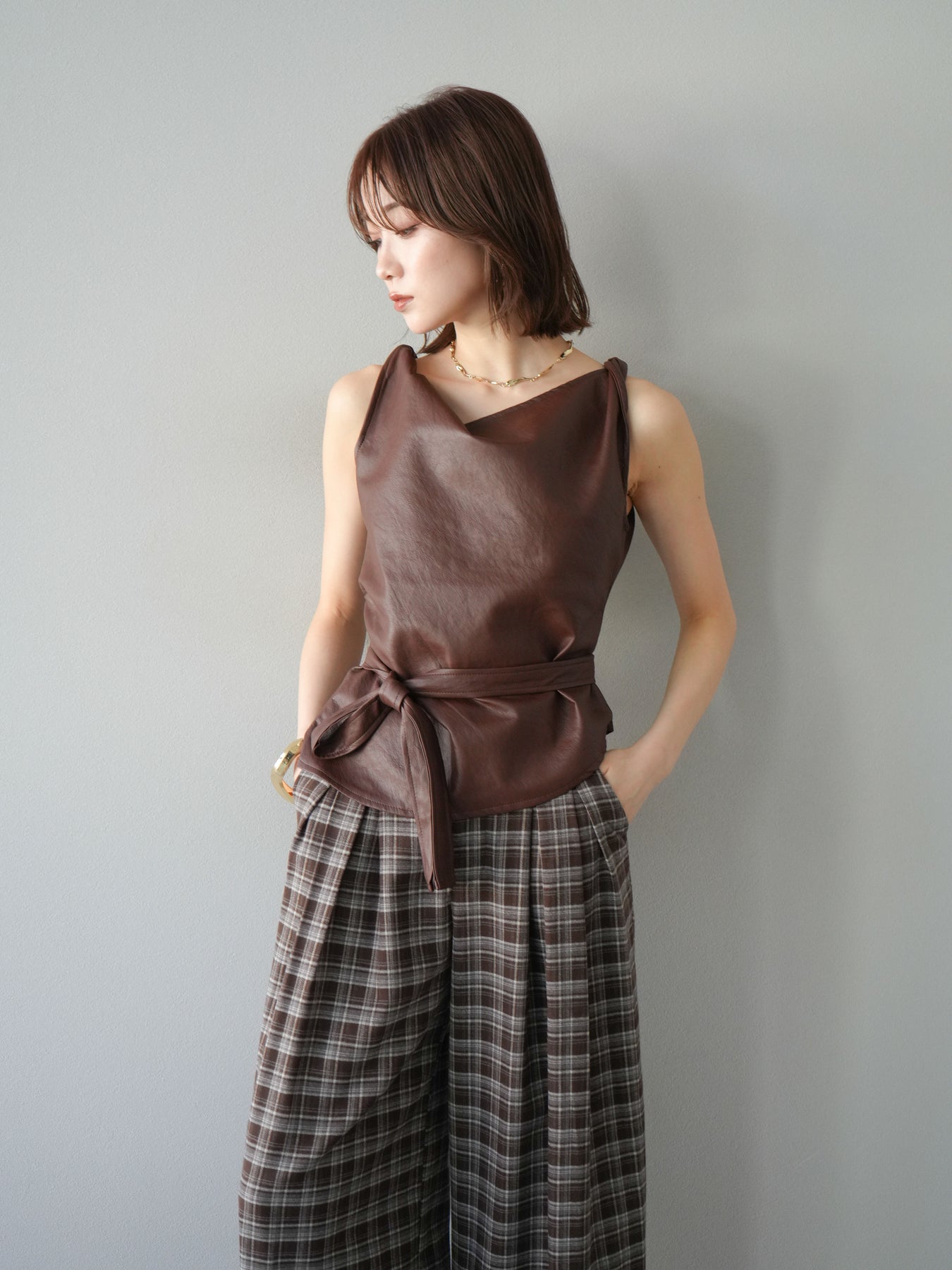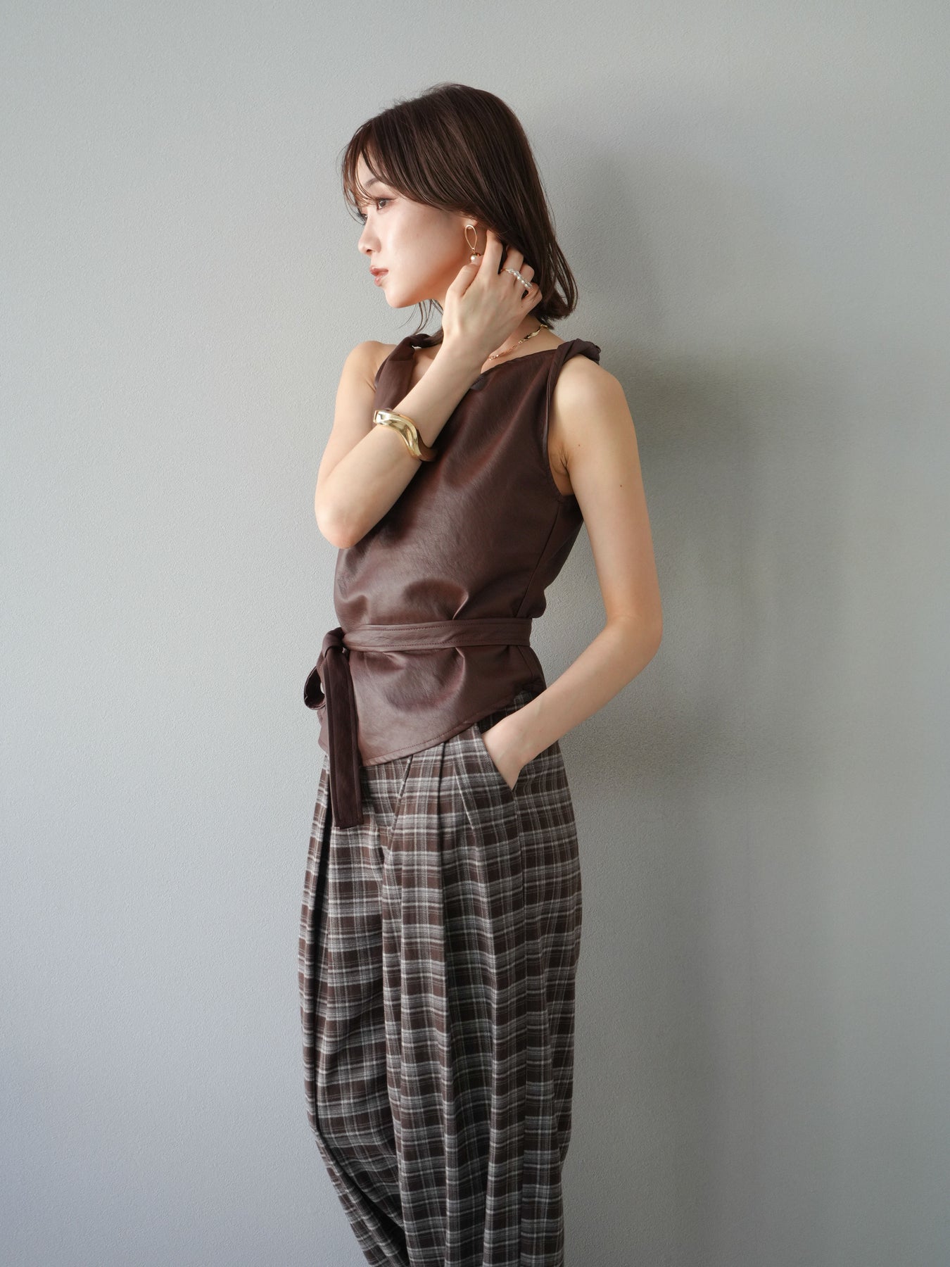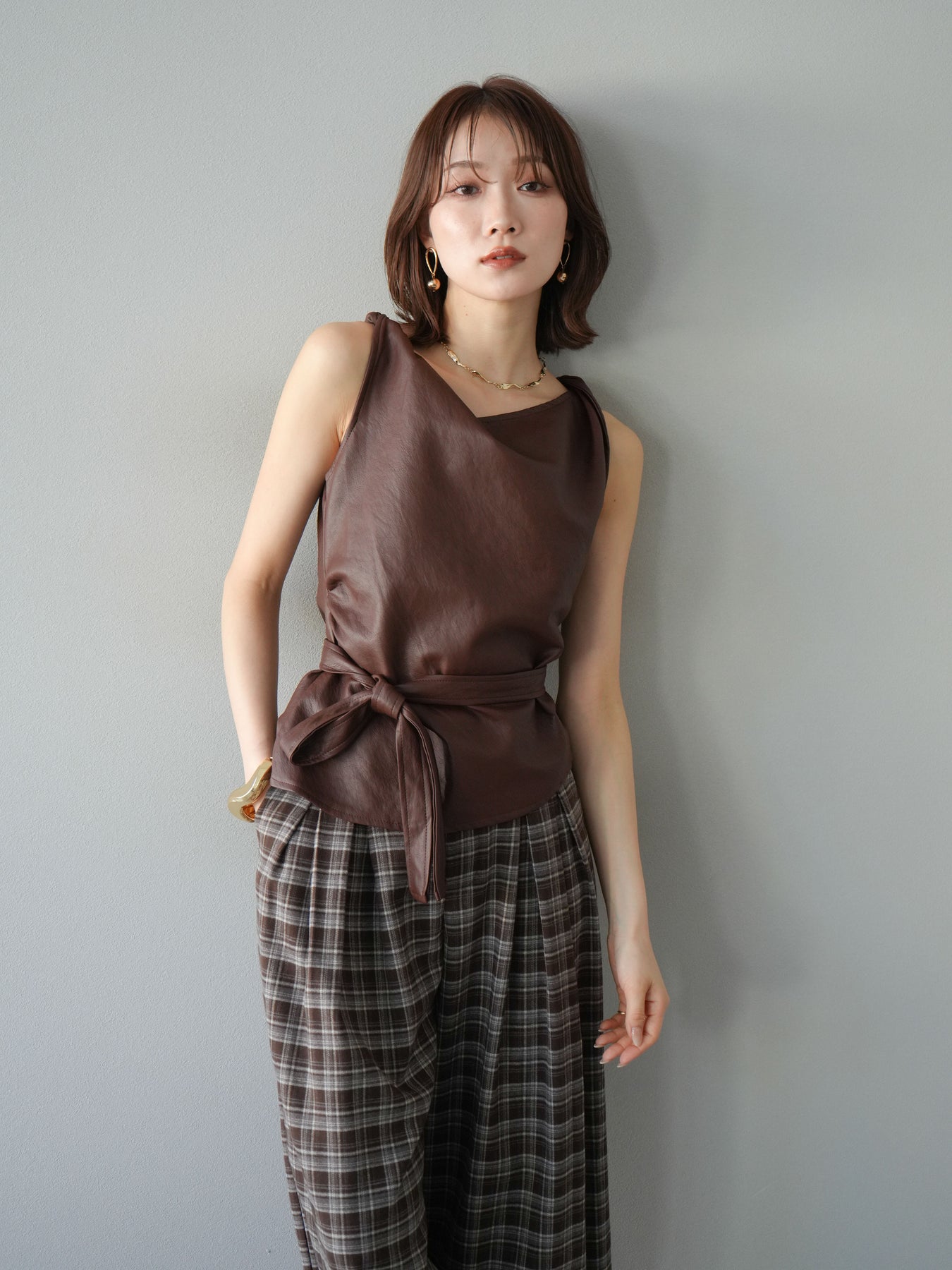 レザー調素材を使用したスリーブレスタイプのプルオーバー。ウエスト部分にあしらった共布のベルトデザインがシルエットにメリハリを与え、スタイルアップを叶えます。シンプルながら存在感のある質感で、1枚でモードな雰囲気を演出。パンツにもスカートにも合わせやすく、インナーとのレイヤードで着こなしの幅が広がるアイテムです。 ※ボトムス、キャミソール(インナー)以外の商品は一律でインナーは付属していません。