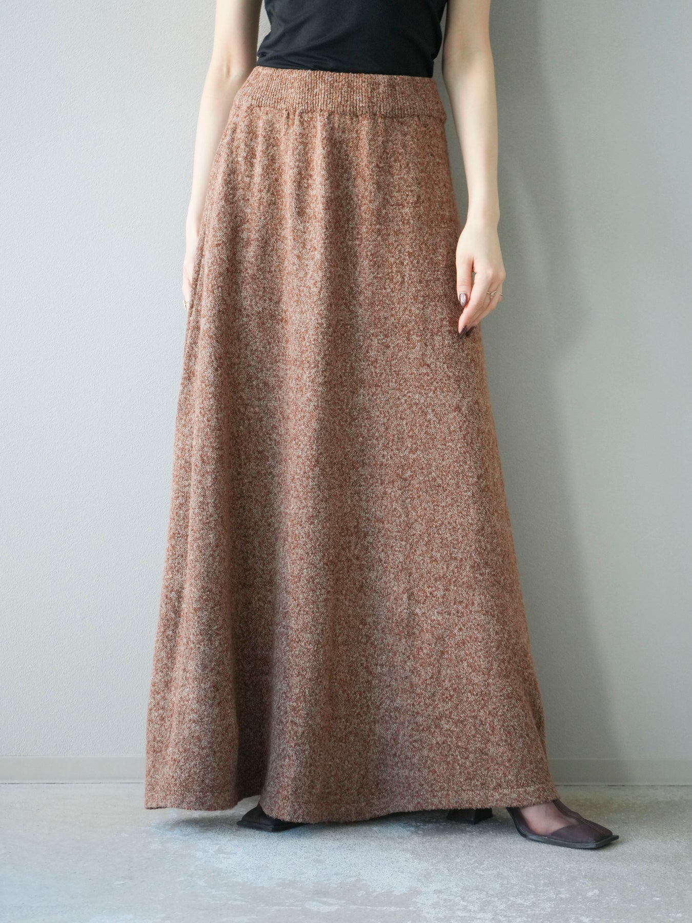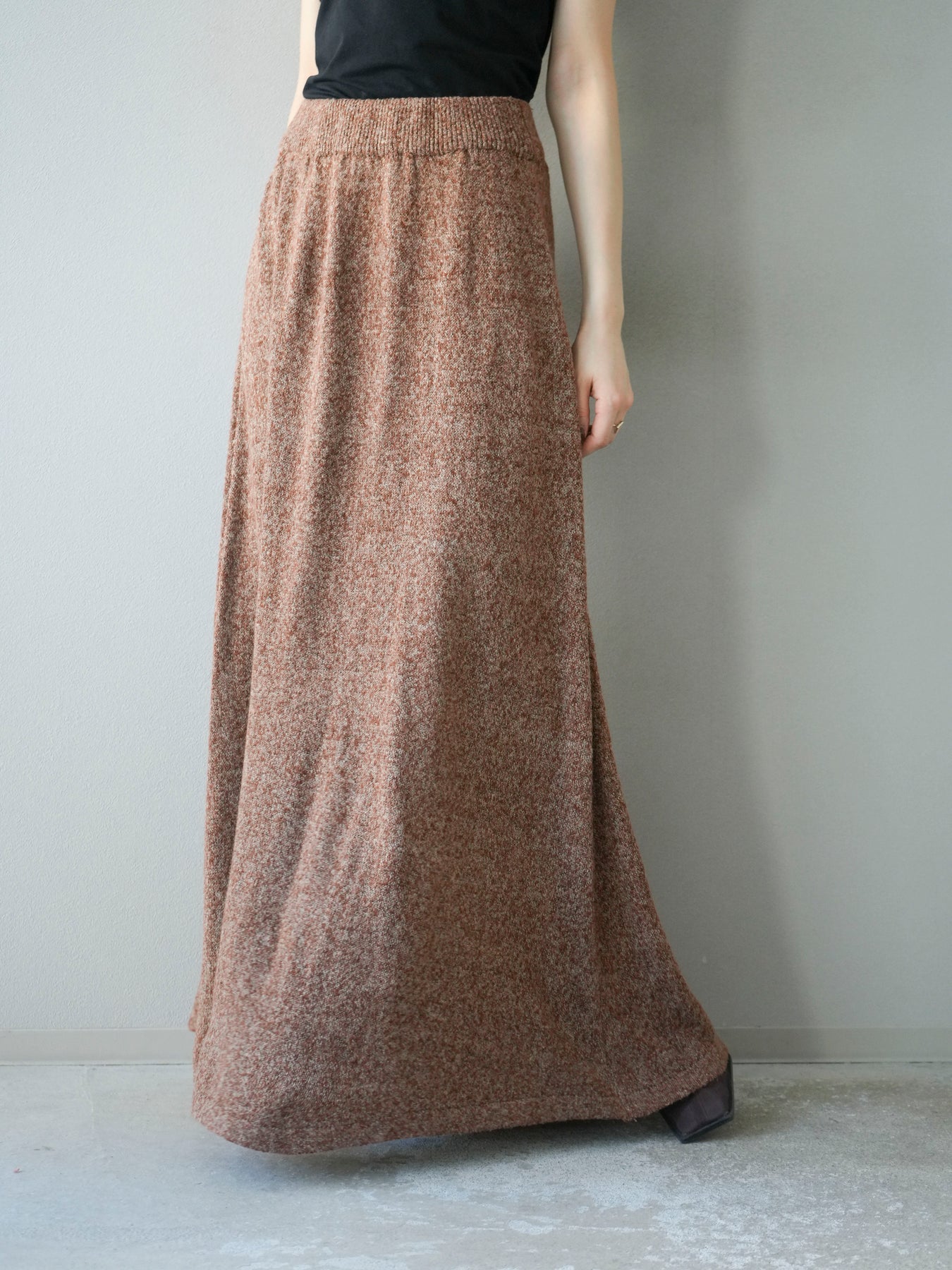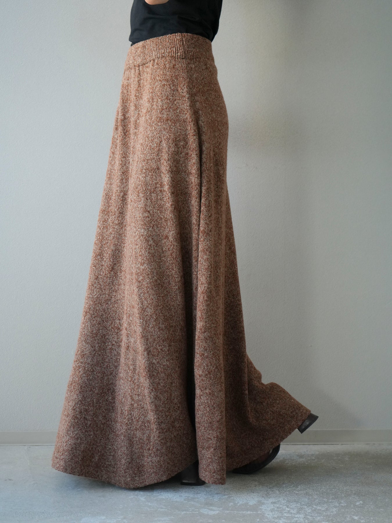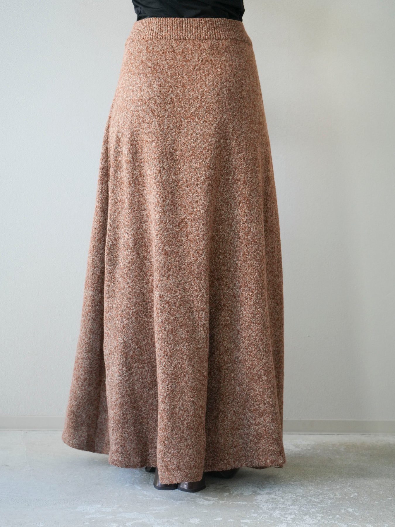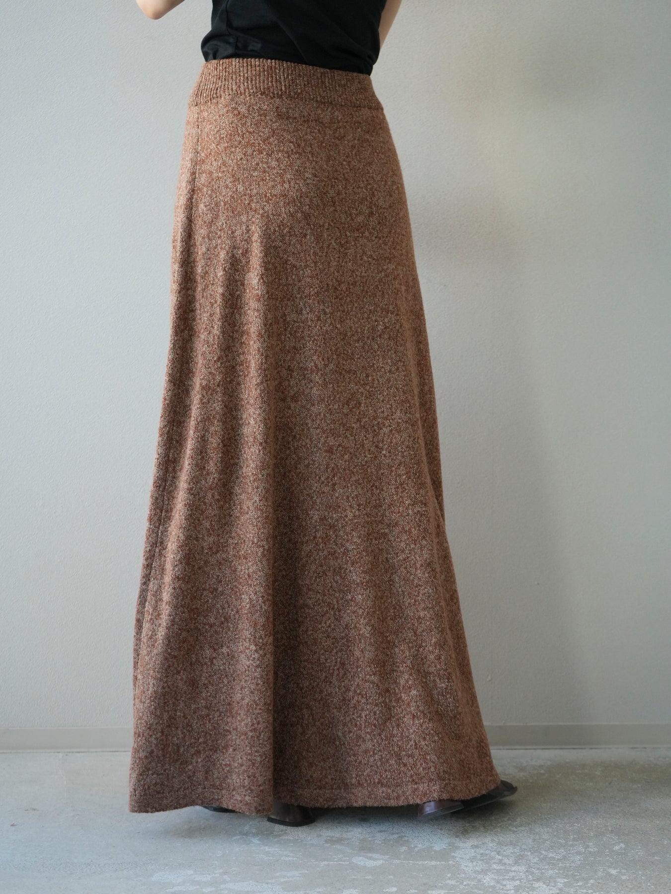表情豊かなミックスヤーンを使用したニットスカート。歩くたびに揺れる柔らかな素材感と程よいフレアシルエットが、女性らしい印象を引き立てます。ウエストはゴム仕様で快適な穿き心地を叶えつつ、リラックス感のある着用感が魅力。シンプルなトップスを合わせるだけでコーディネートが完成し、同素材のトップスやベストと合わせてセットアップ風に着こなすのもおすすめです。シーズンムードを高めてくれる、デイリーに取り入れやすい一着です。