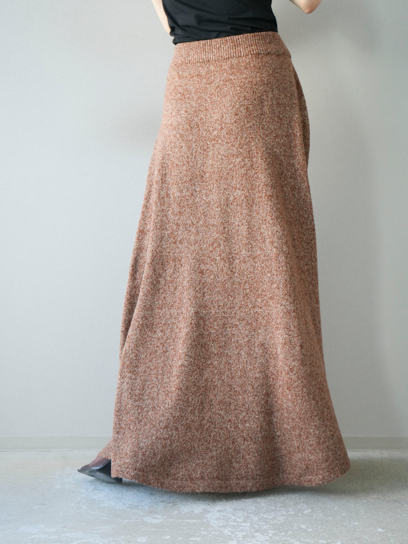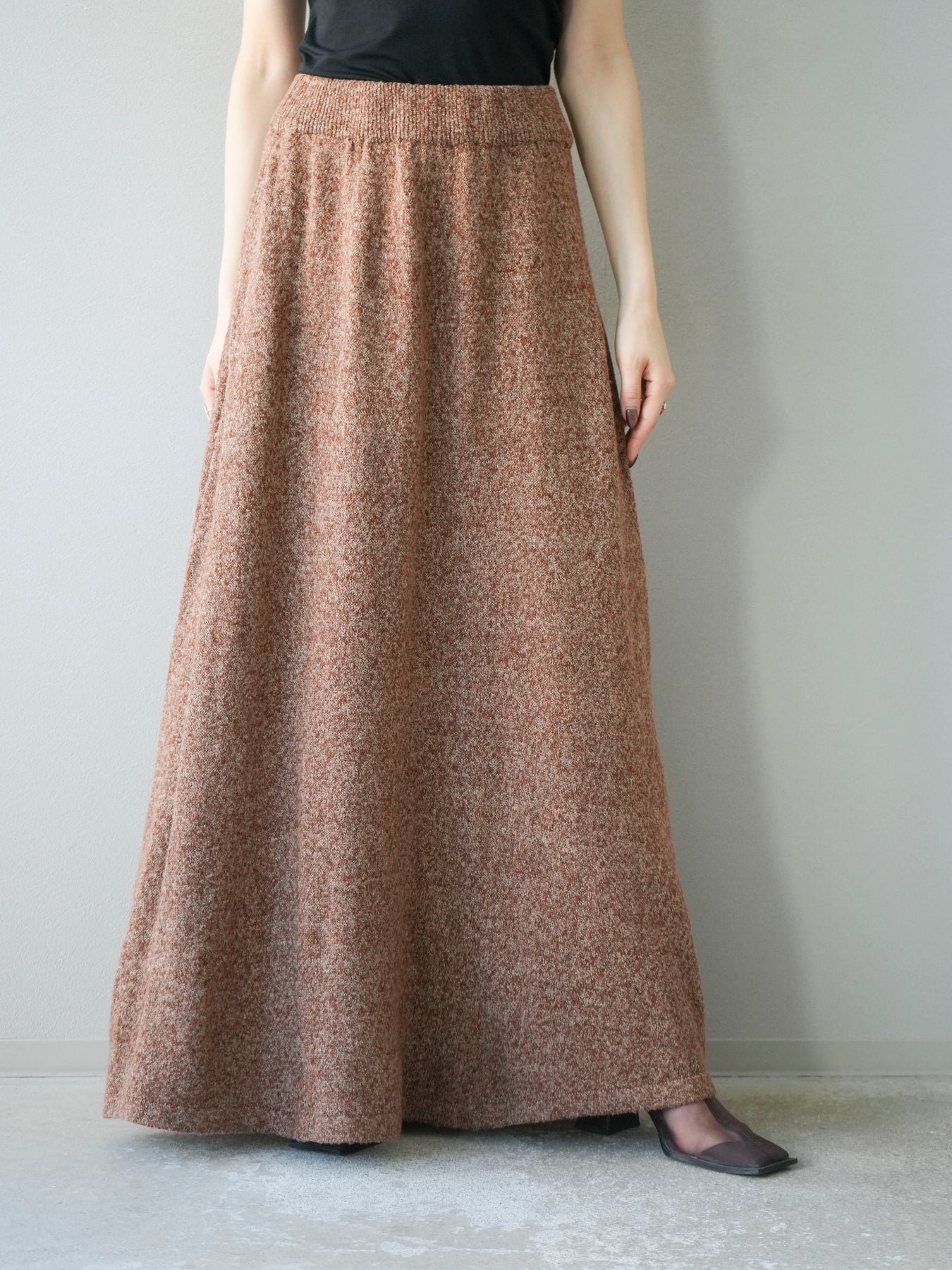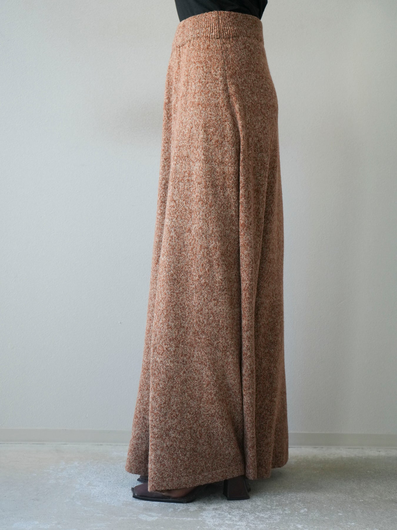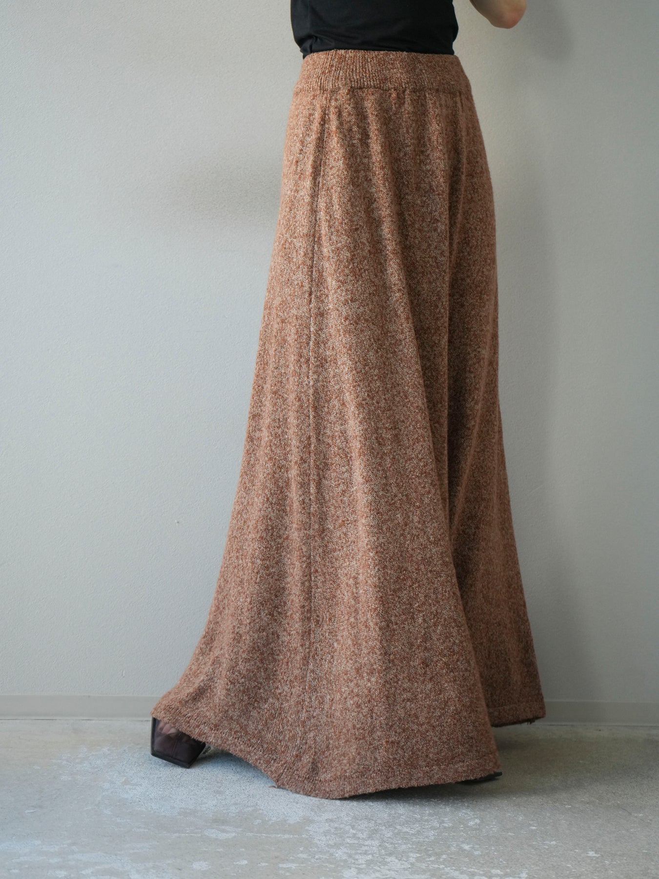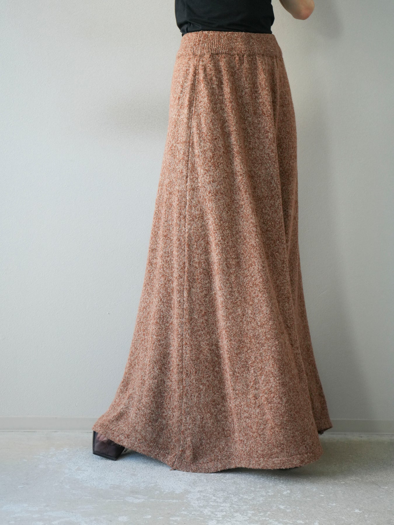 表情豊かなミックスヤーンを使用したニットスカート。歩くたびに揺れる柔らかな素材感と程よいフレアシルエットが、女性らしい印象を引き立てます。ウエストはゴム仕様で快適な穿き心地を叶えつつ、リラックス感のある着用感が魅力。シンプルなトップスを合わせるだけでコーディネートが完成し、同素材のトップスやベストと合わせてセットアップ風に着こなすのもおすすめです。シーズンムードを高めてくれる、デイリーに取り入れやすい一着です。