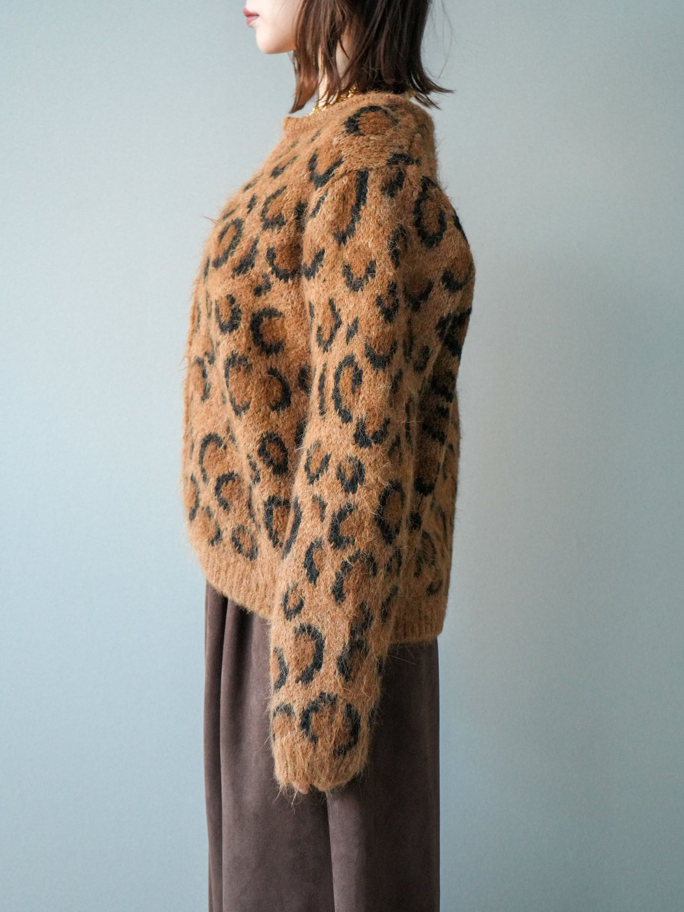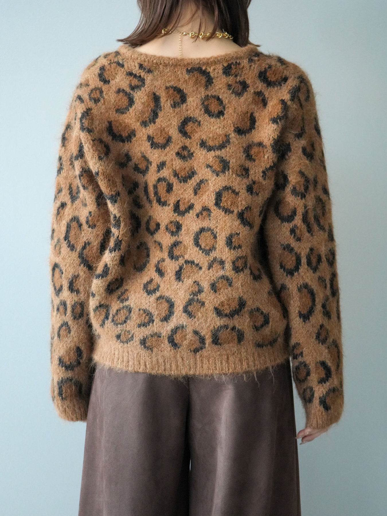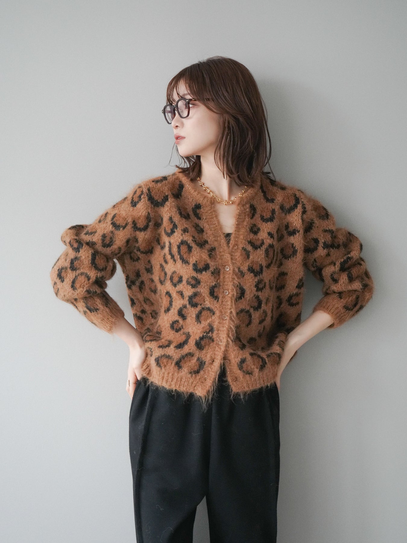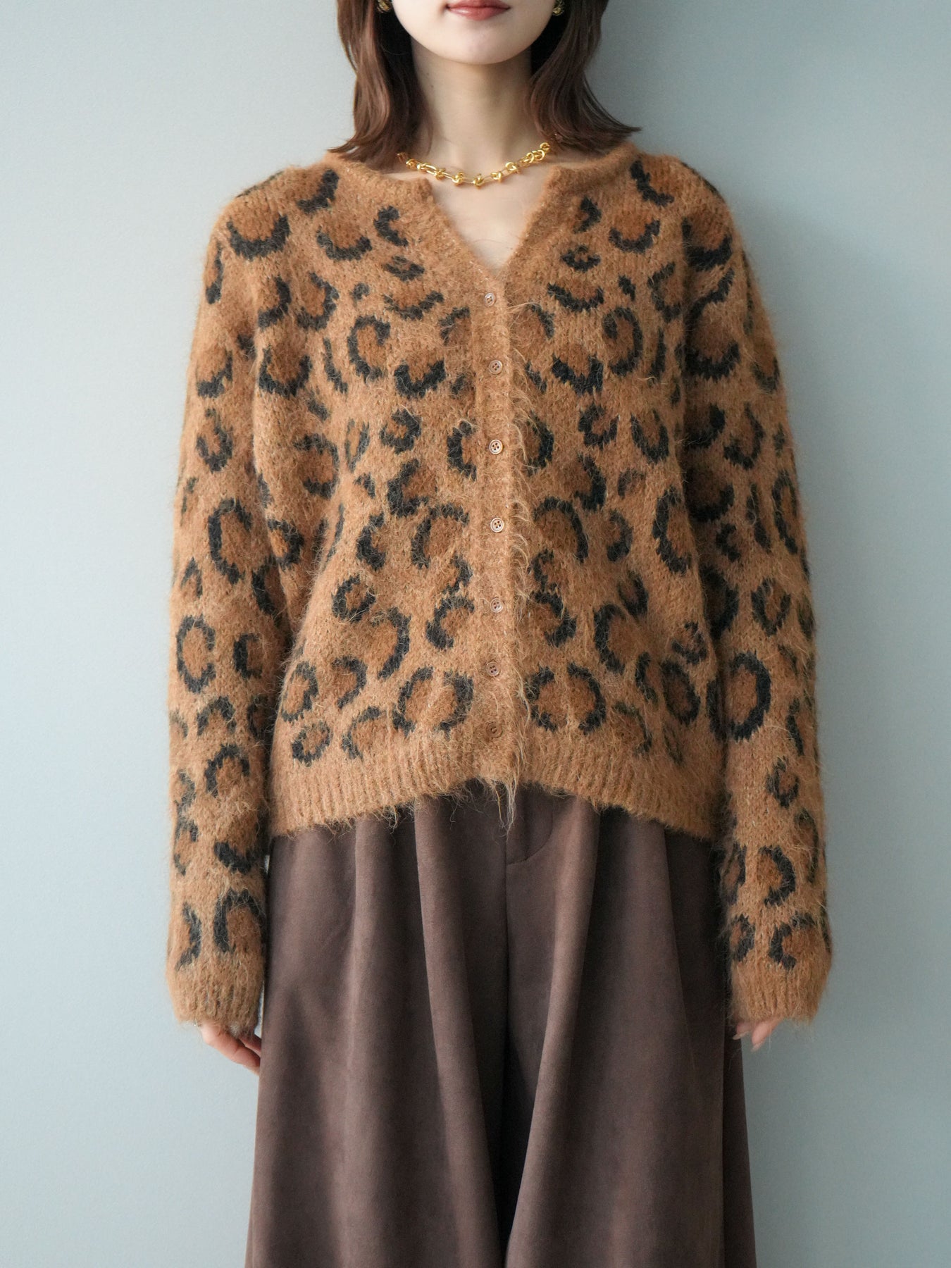 [予約]モヘアタッチレオパード柄ニットカーディガン/khaki