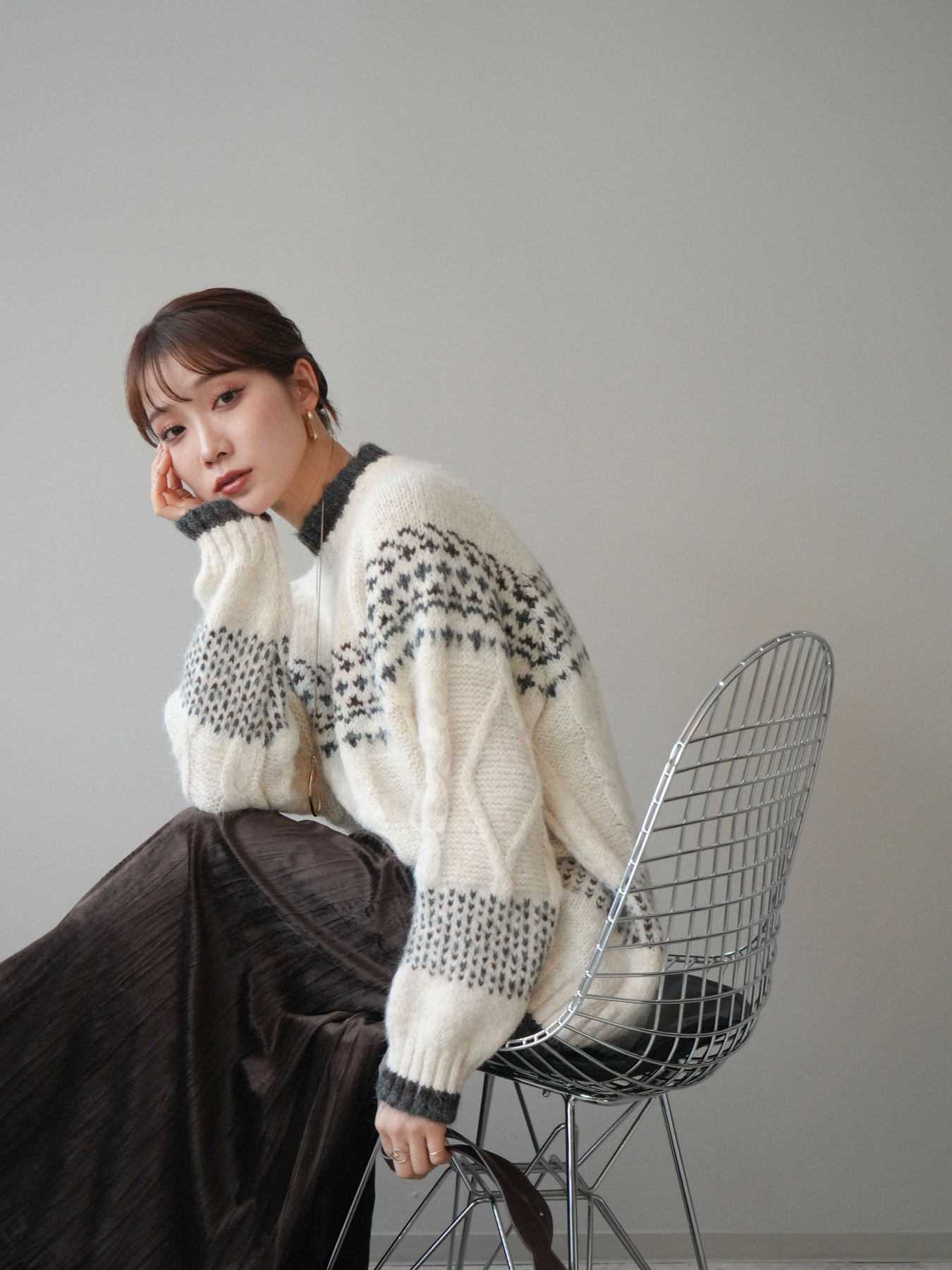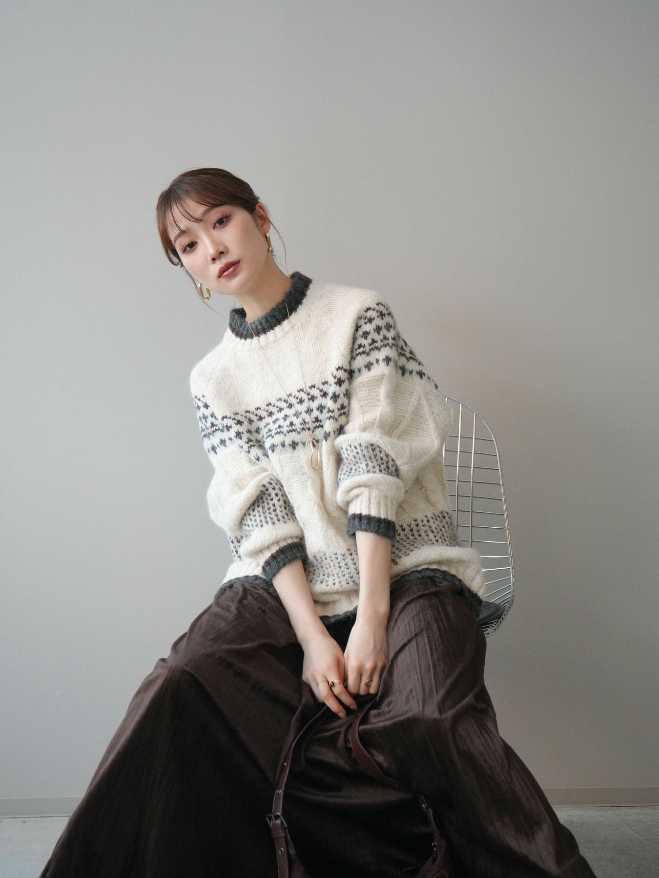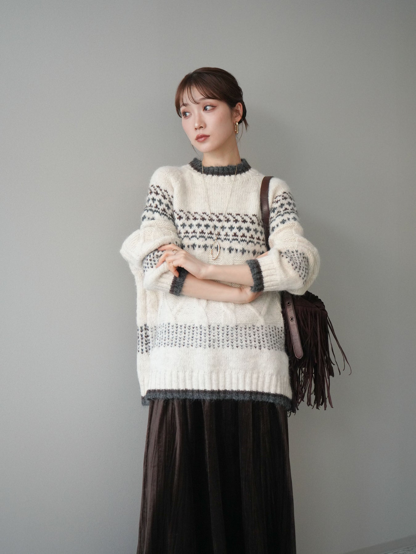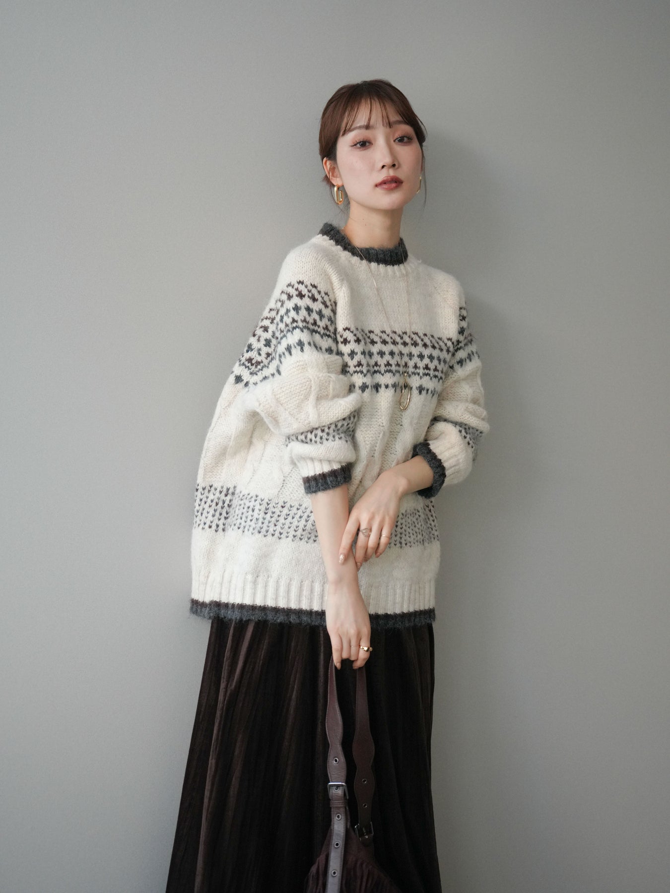 季節感あふれるノルディック柄を取り入れつつ、裾や襟ぐりに配色デザインを施すことで大人でも取り入れやすいバランスに仕上げたニットプルオーバー。ふんわりとしたタッチと程よい厚みが暖かさを引き立て、着るだけでスタイリングが華やぐ存在感のある一枚です。ゆったりとしたシルエットが抜け感を生み、デイリーなボトムに合わせるだけでこなれた冬の装いに。クラシックな柄をモダンにアレンジした着映えニットとして、ワードローブに一枚持っておきたいアイテムです。 ※ボトムス、キャミソール(インナー)以外の商品は一律でインナーは付属していません。