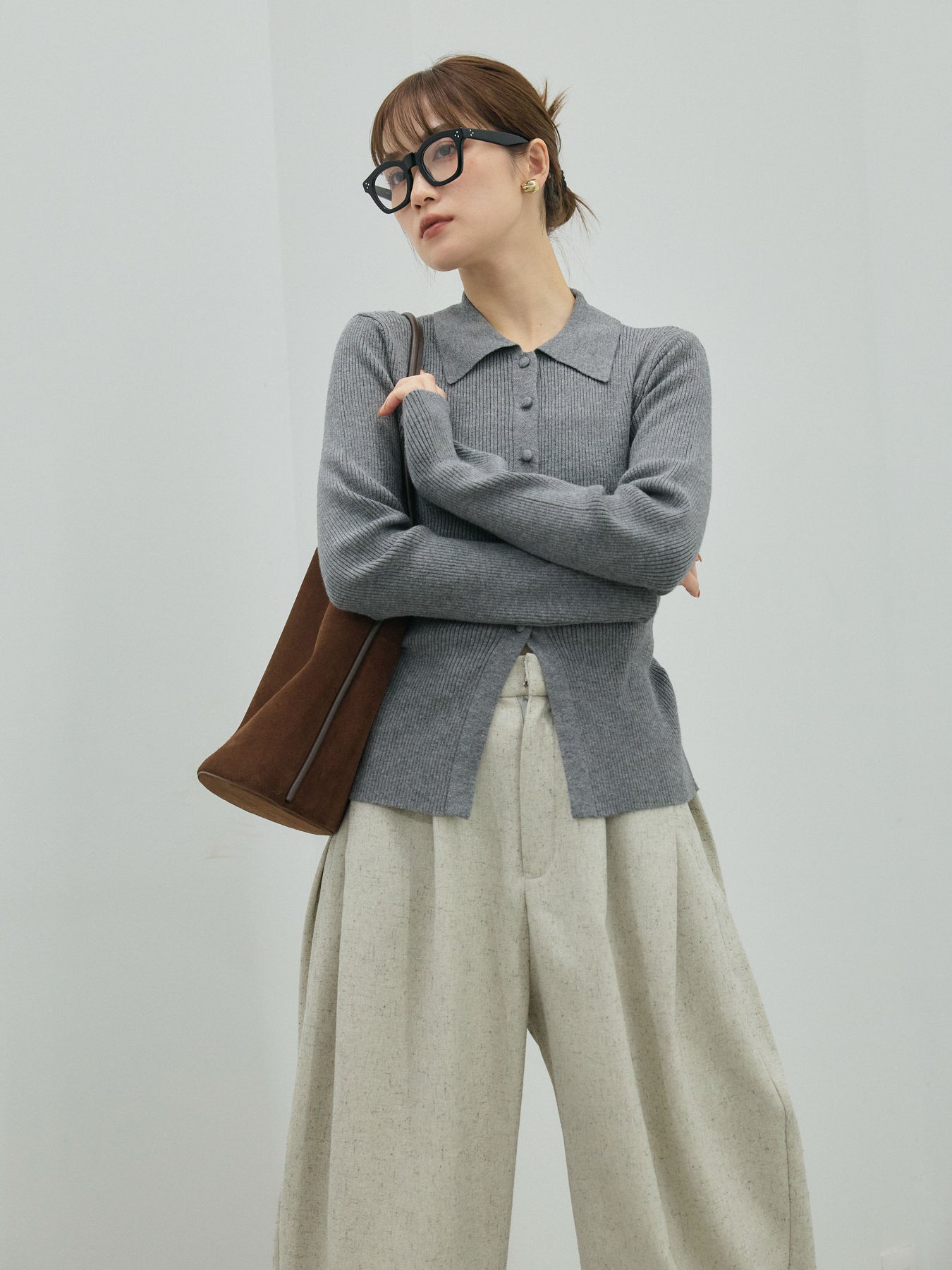 程よくゆるさのあるシルエットが魅力のニットアップ。 ポロデザインの襟元にレザーベルトをあしらったトップスは、胸元のディテールがアクセントになり、1枚でも映える主役アイテム。 パンツはストンと落ちるワイドシルエットで、気になるラインを拾わずリラックス感のある穿き心地です。 セットアップでの着用はもちろん、それぞれ単品でも着まわせる万能アイテムです。