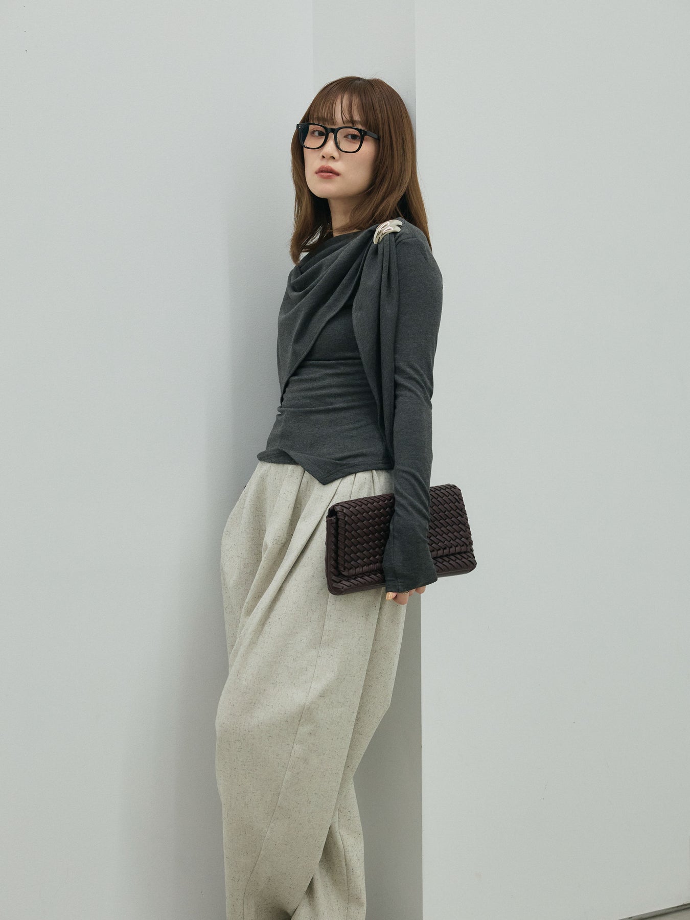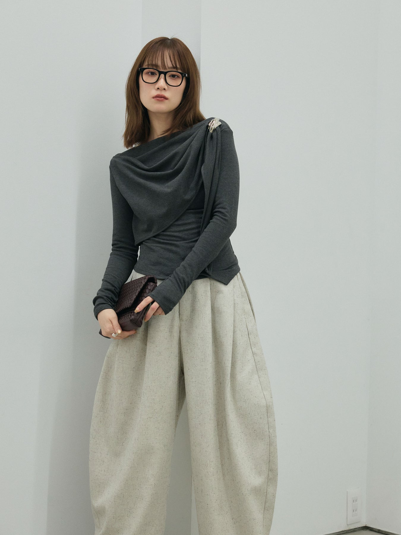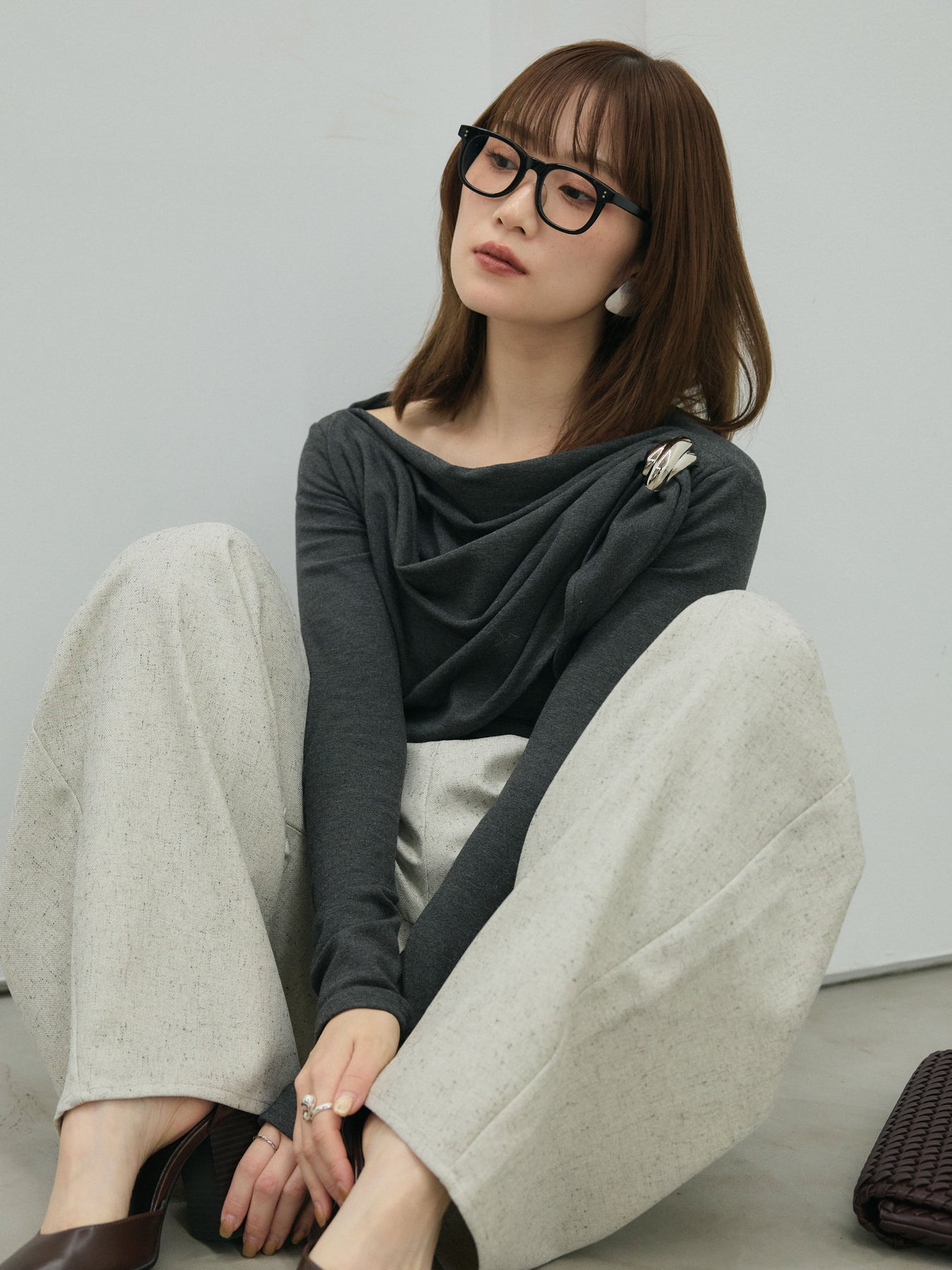立体感のあるドレープデザインが目を惹く、モード感漂う長袖トップス。 片肩にあしらった取り外し可能なブローチが、さりげなくアクセントを添えてくれます。 柔らかな肌触りの裏起毛素材で、着心地も暖かさも兼ね備えた一枚。 一枚で着映えしながらも、ボトムスを選ばず幅広いスタイリングに活躍します。
