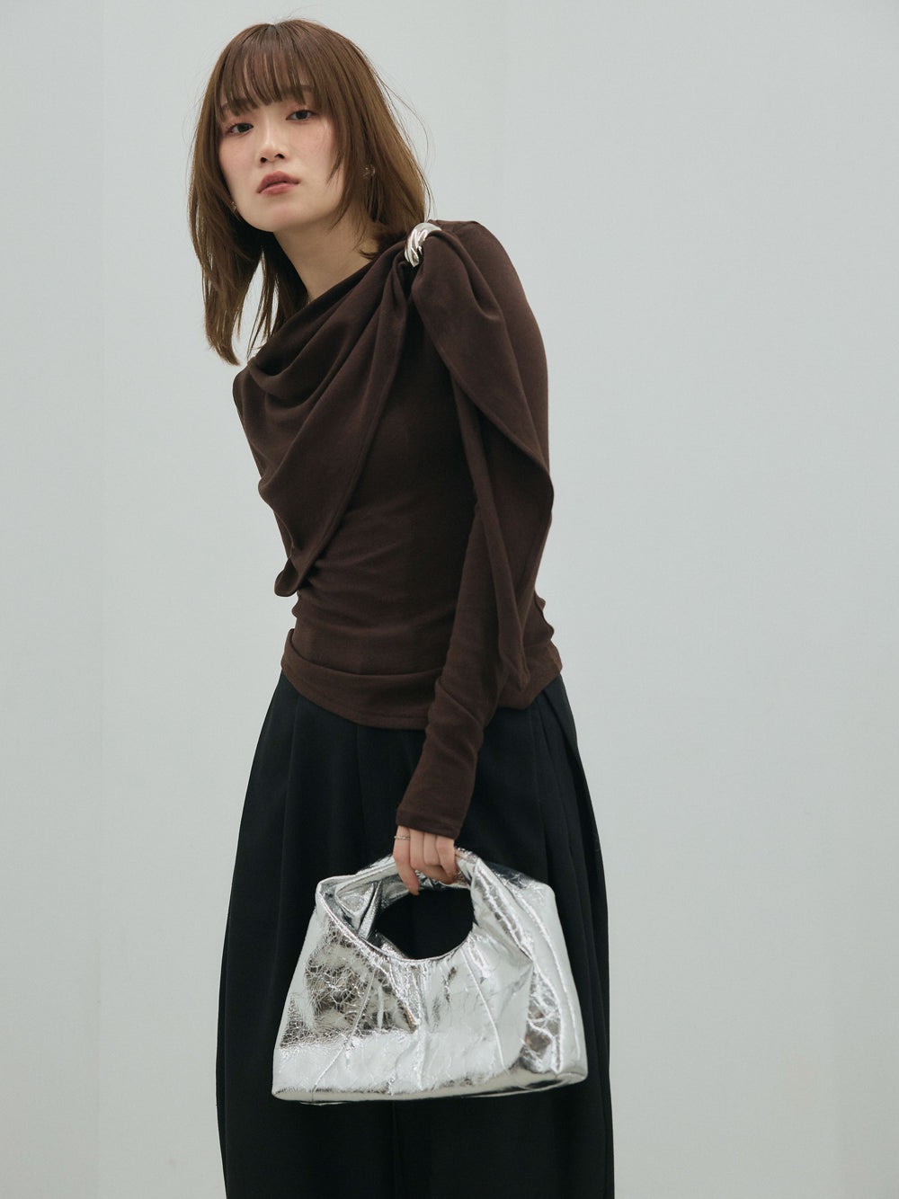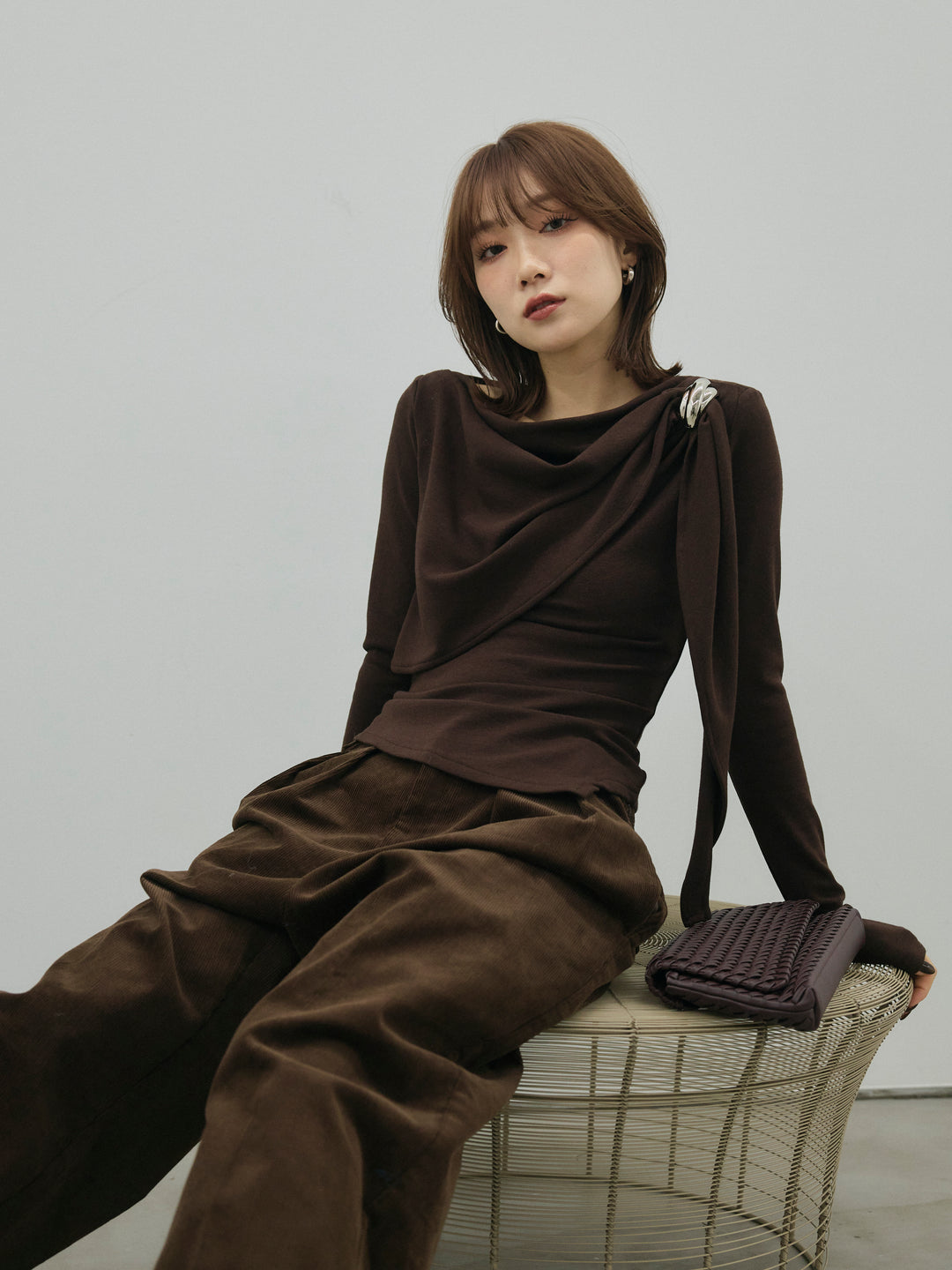 [予約]ブローチ付ドレープ裏起毛トップス/brown