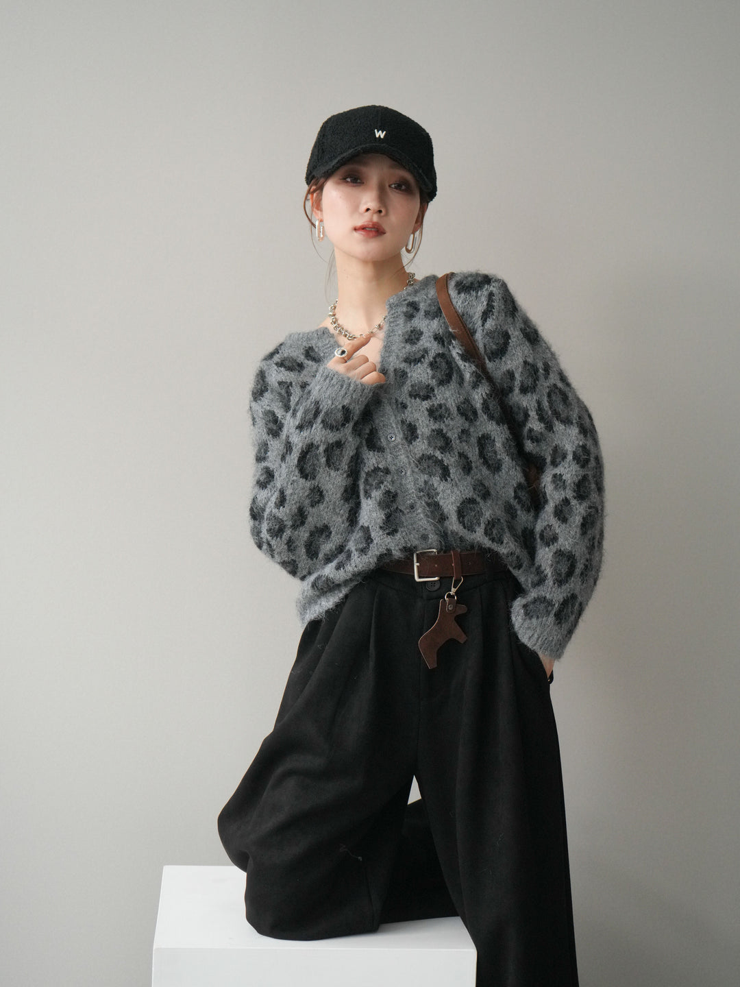 [予約]モヘアタッチレオパード柄ニットカーディガン/gray