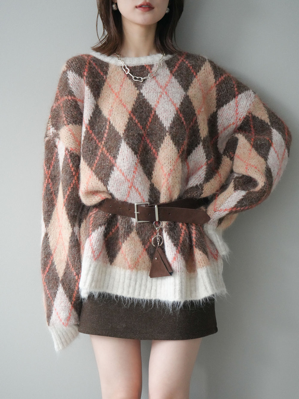 [予約]モヘアタッチアーガイル柄オーバーニットプルオーバー/brown