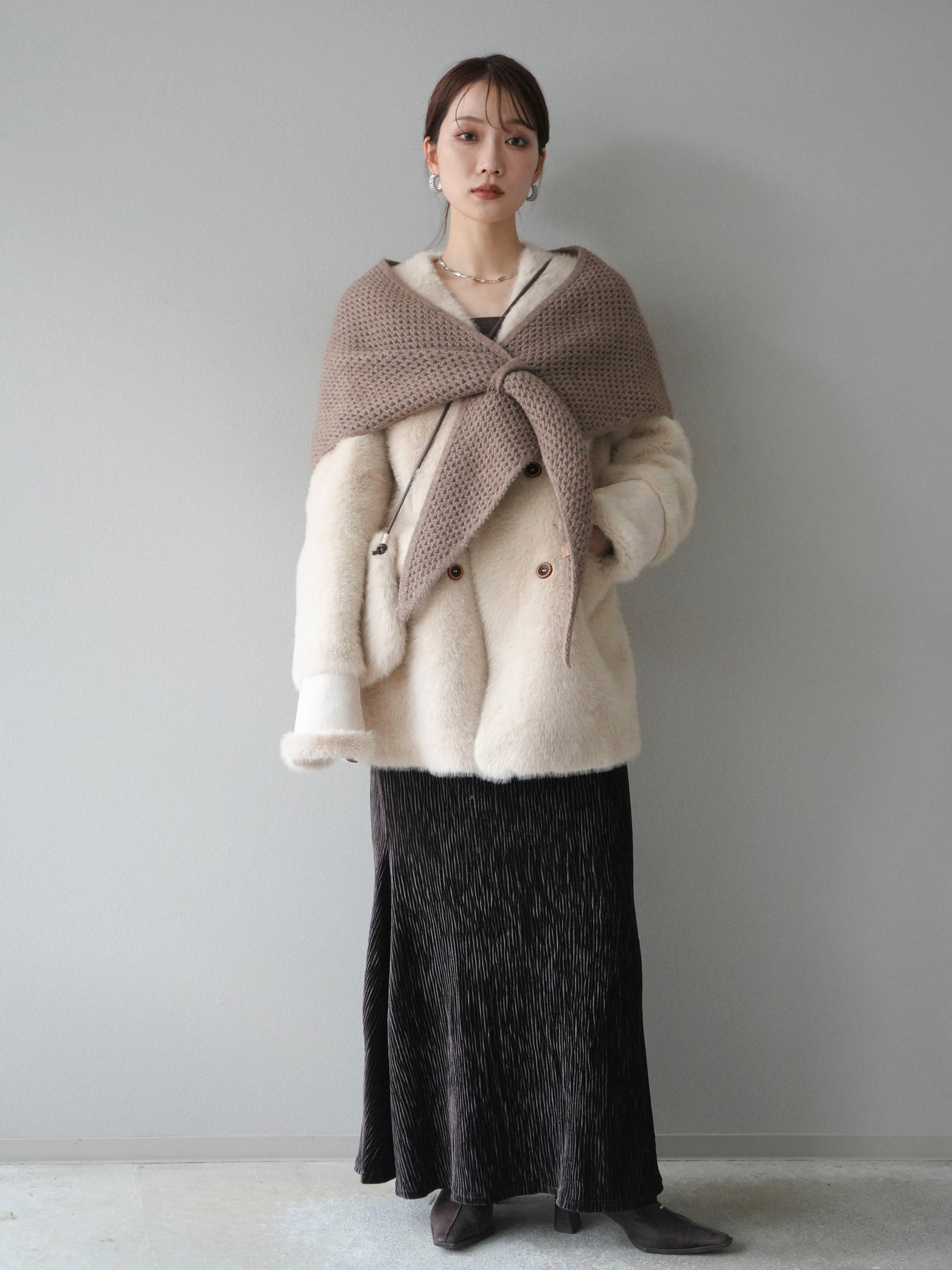 ふんわりとしたエコファー素材が高級感を演出するノーカラーコート。 程よい毛足と滑らかな質感が上品な印象を与え、羽織るだけで華やかさのあるスタイリングに仕上がります。 ノーカラーデザインで首元がすっきり見え、タートルネックやマフラーとの相性も抜群。 同素材のバッグが付属しており、統一感のあるコーディネートを楽しめます。 軽やかな着心地ながらも暖かく、デイリーにも特別なシーンにも活躍する一着です。 ※ボトムス、キャミソール(インナー)以外の商品は一律でインナーは付属していません。