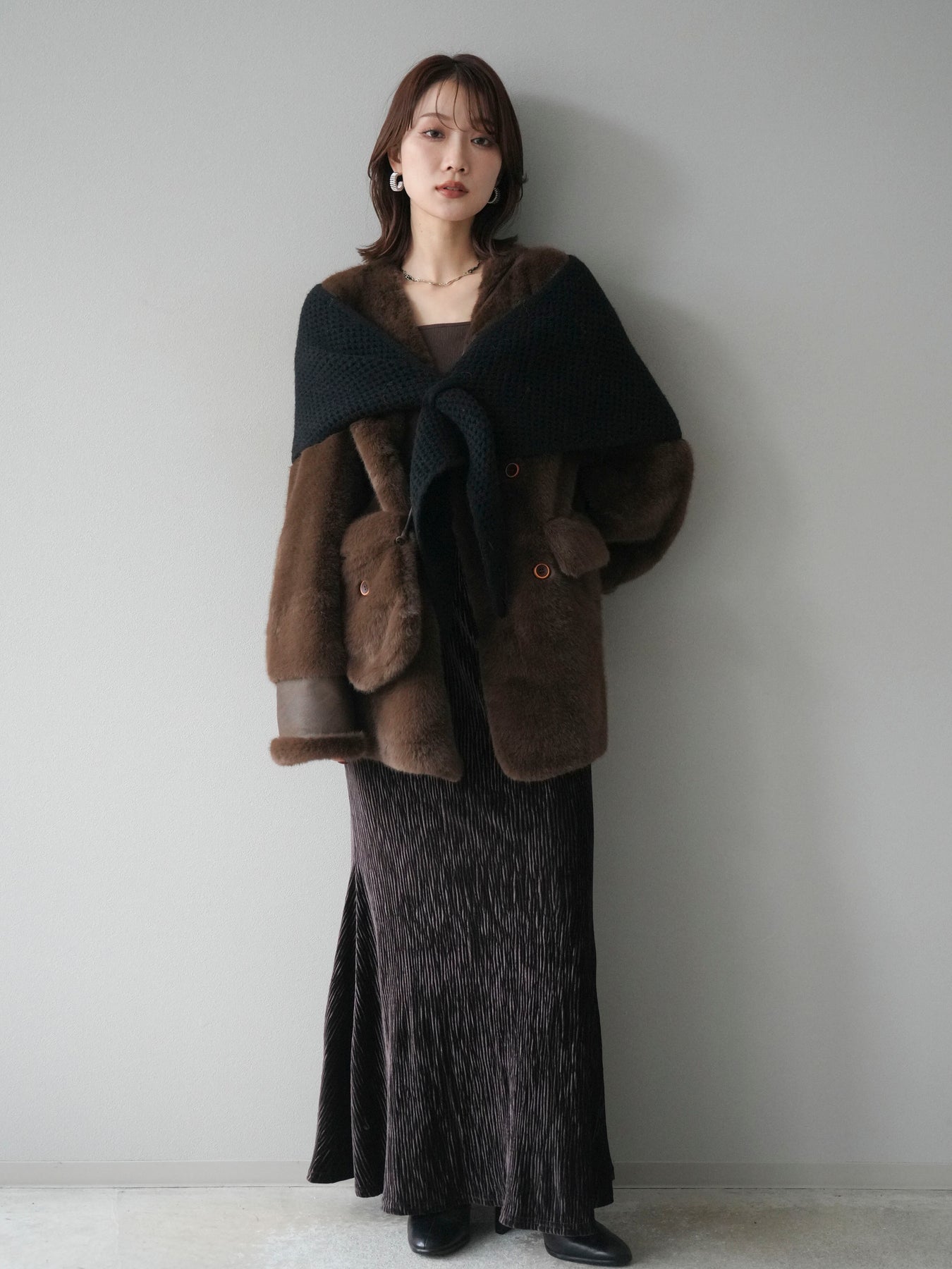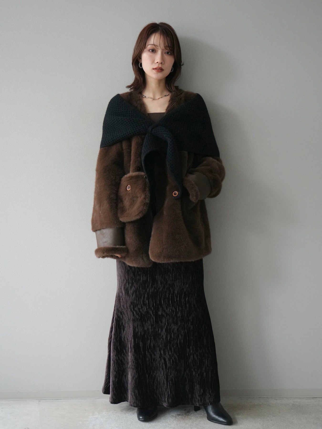 ふんわりとしたエコファー素材が高級感を演出するノーカラーコート。 程よい毛足と滑らかな質感が上品な印象を与え、羽織るだけで華やかさのあるスタイリングに仕上がります。 ノーカラーデザインで首元がすっきり見え、タートルネックやマフラーとの相性も抜群。 同素材のバッグが付属しており、統一感のあるコーディネートを楽しめます。 軽やかな着心地ながらも暖かく、デイリーにも特別なシーンにも活躍する一着です。 ※ボトムス、キャミソール(インナー)以外の商品は一律でインナーは付属していません。