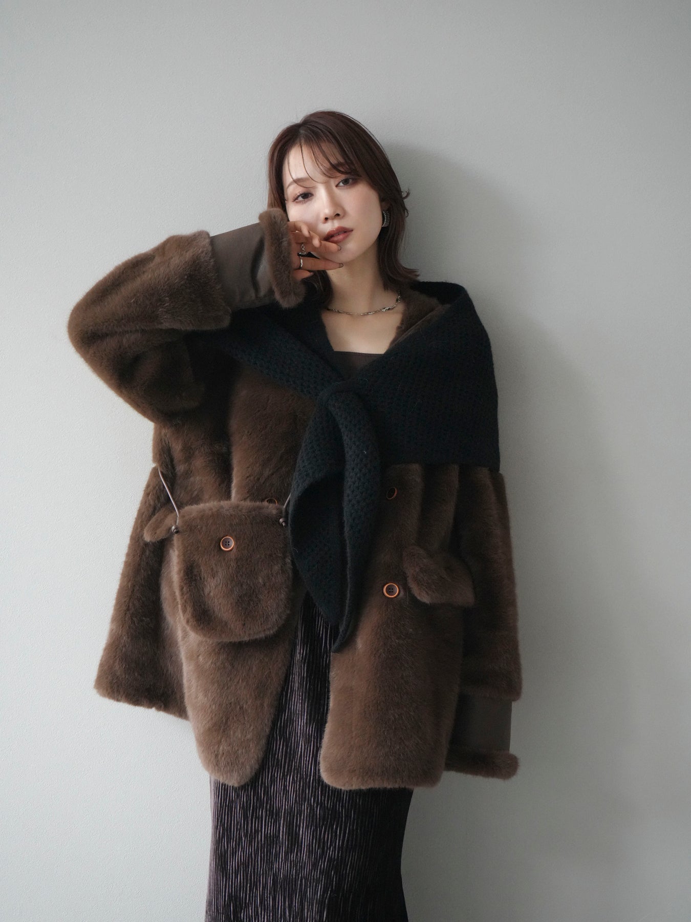 [予約]バッグ付エコファーノーカラーコート/brown