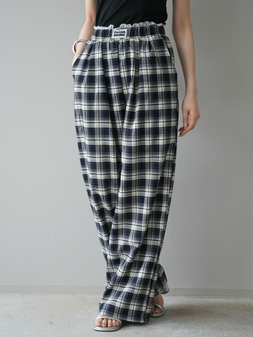 [予約]レースレイヤードチェックワイドパンツ/ネイビー