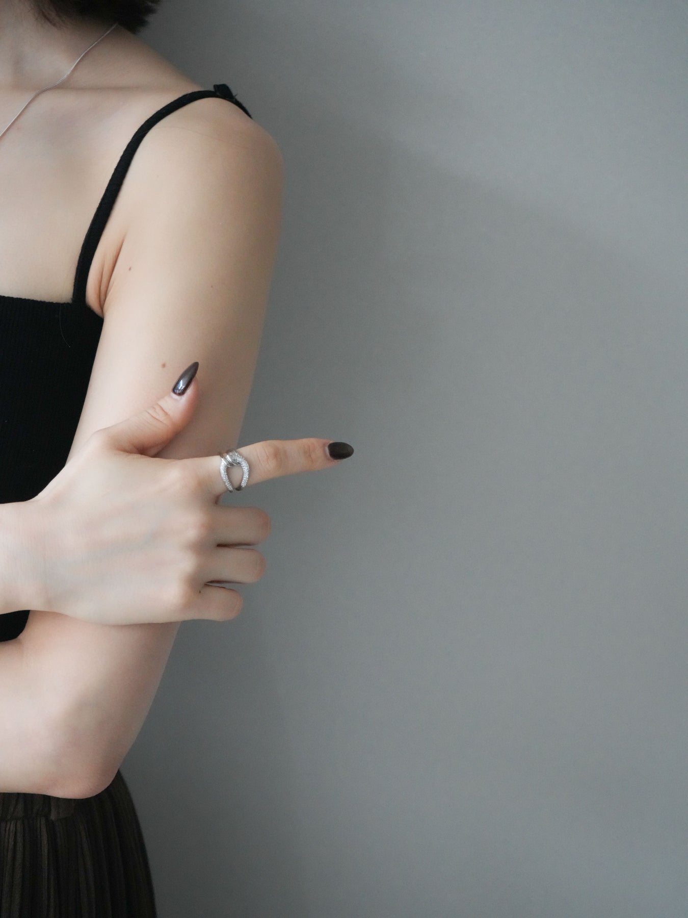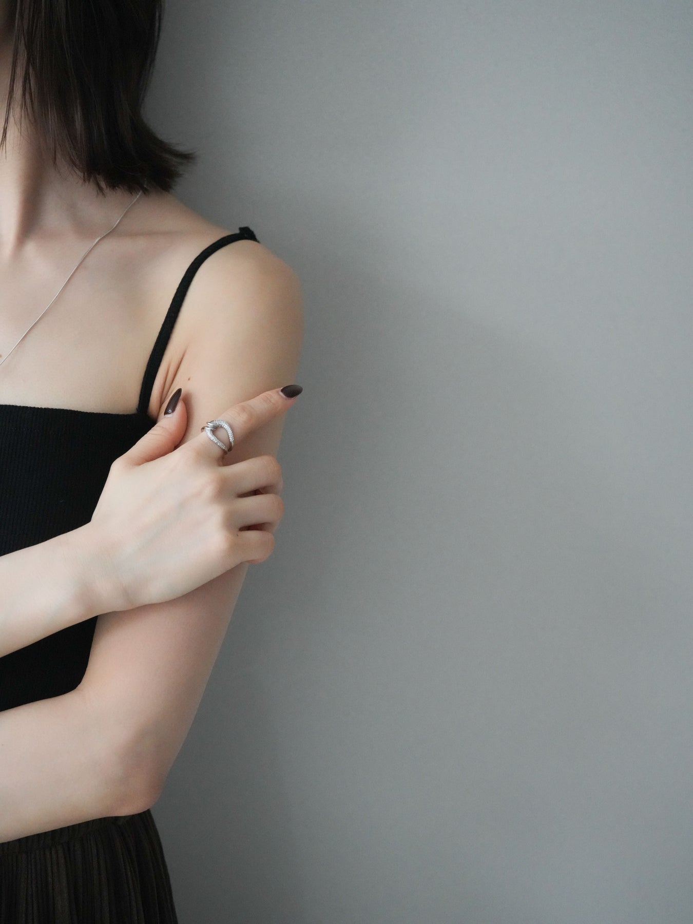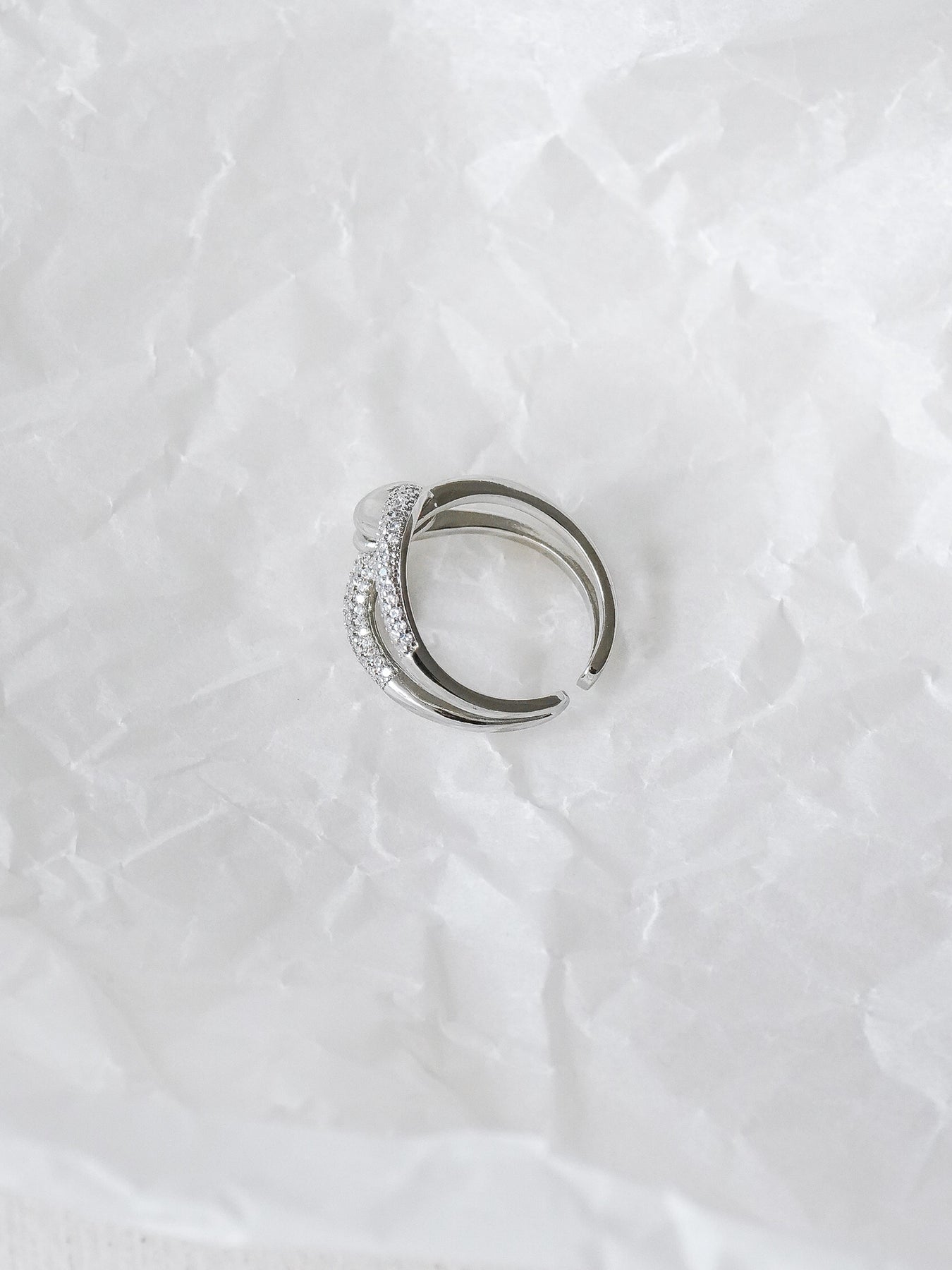 繊細なラインが重なり合うツイストデザインに、ビジューを敷き詰めて上品な輝きを添えたリング。手元にさりげない華やかさをプラスしてくれるデザインで、デイリーから特別なシーンまで幅広く活躍します。存在感がありながらも主張しすぎないバランスで、他のアクセサリーともコーディネートしやすいのが魅力。指先の動きに合わせてきらりと光り、女性らしい手元を演出してくれるアイテムです。