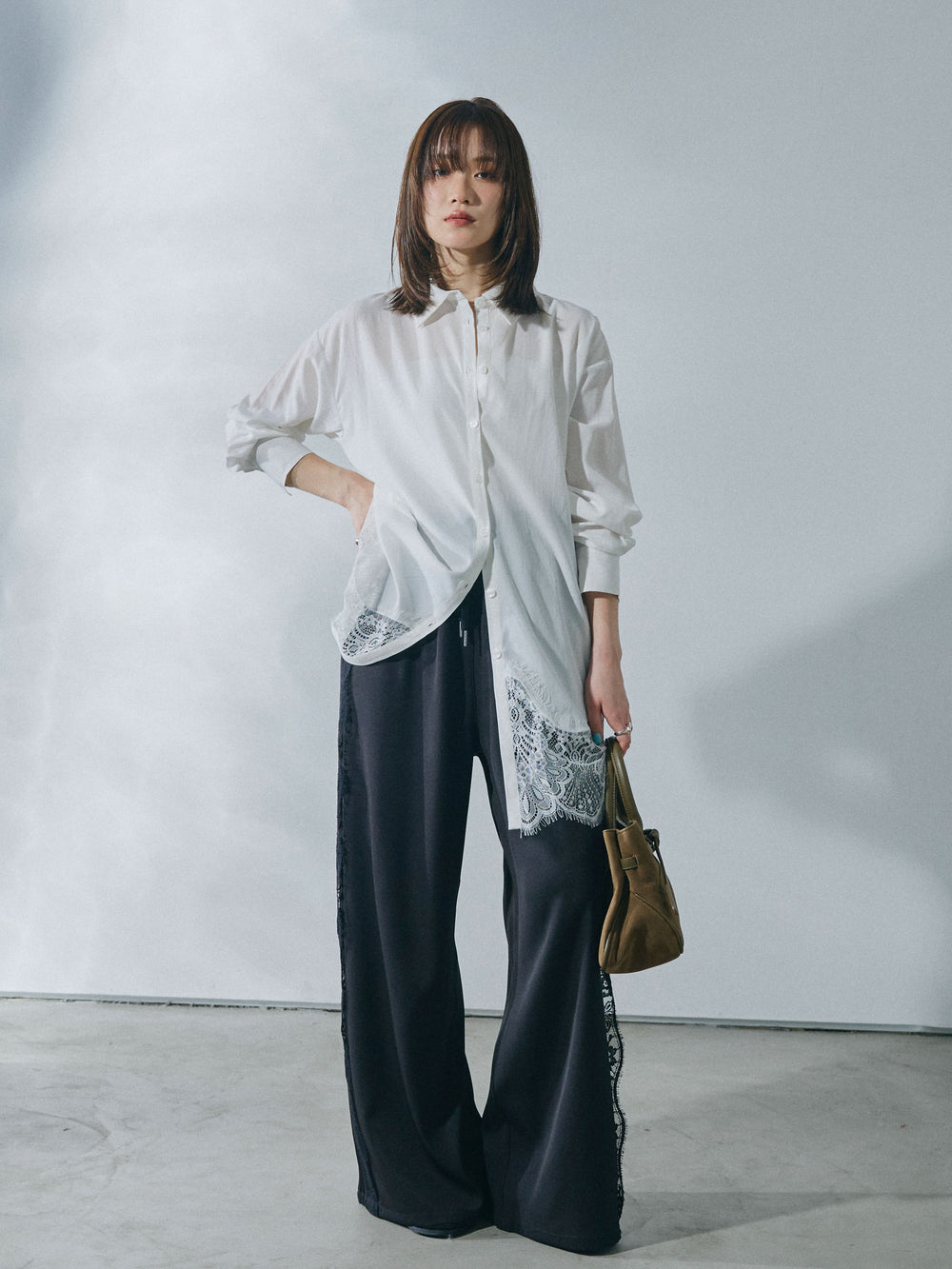 【Allure】[SET]裾レースポプリンシャツ+サイドピンタックレースイージーワイドパンツ(2set)