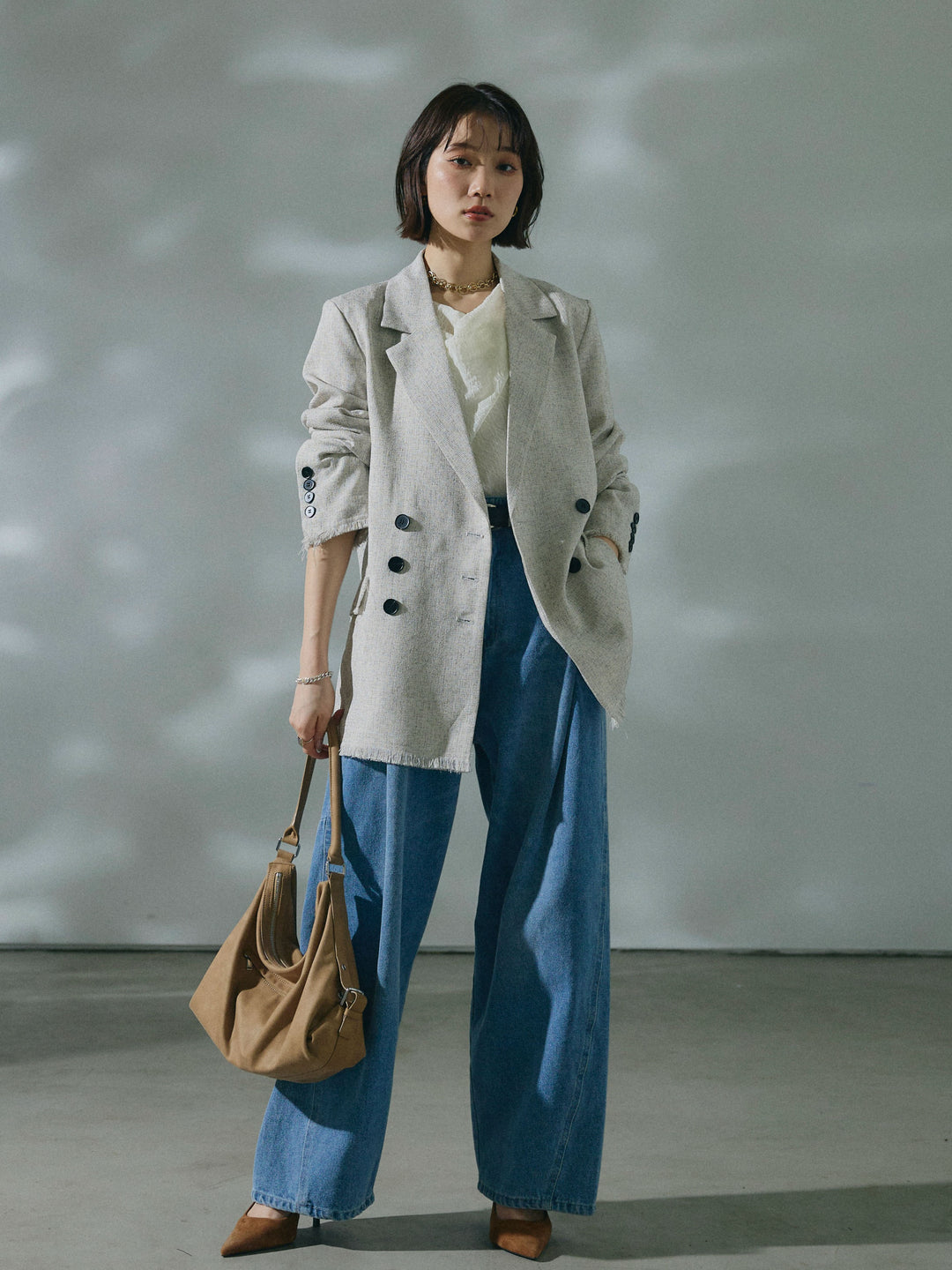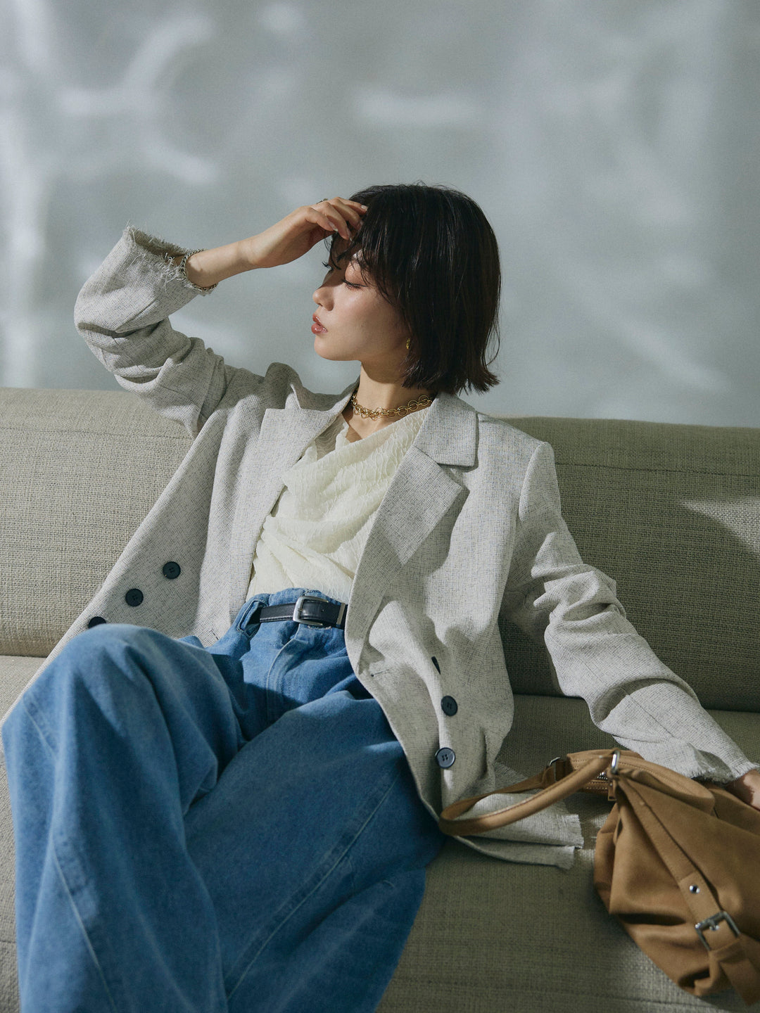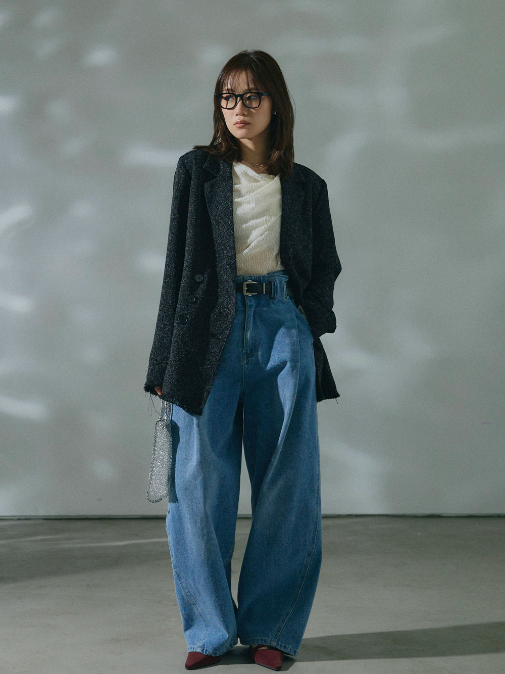 【Allure】[SET]スラブツイードフリンジテーラージャケット+ハイウエストベルトループデザインデニムパンツ(2set)