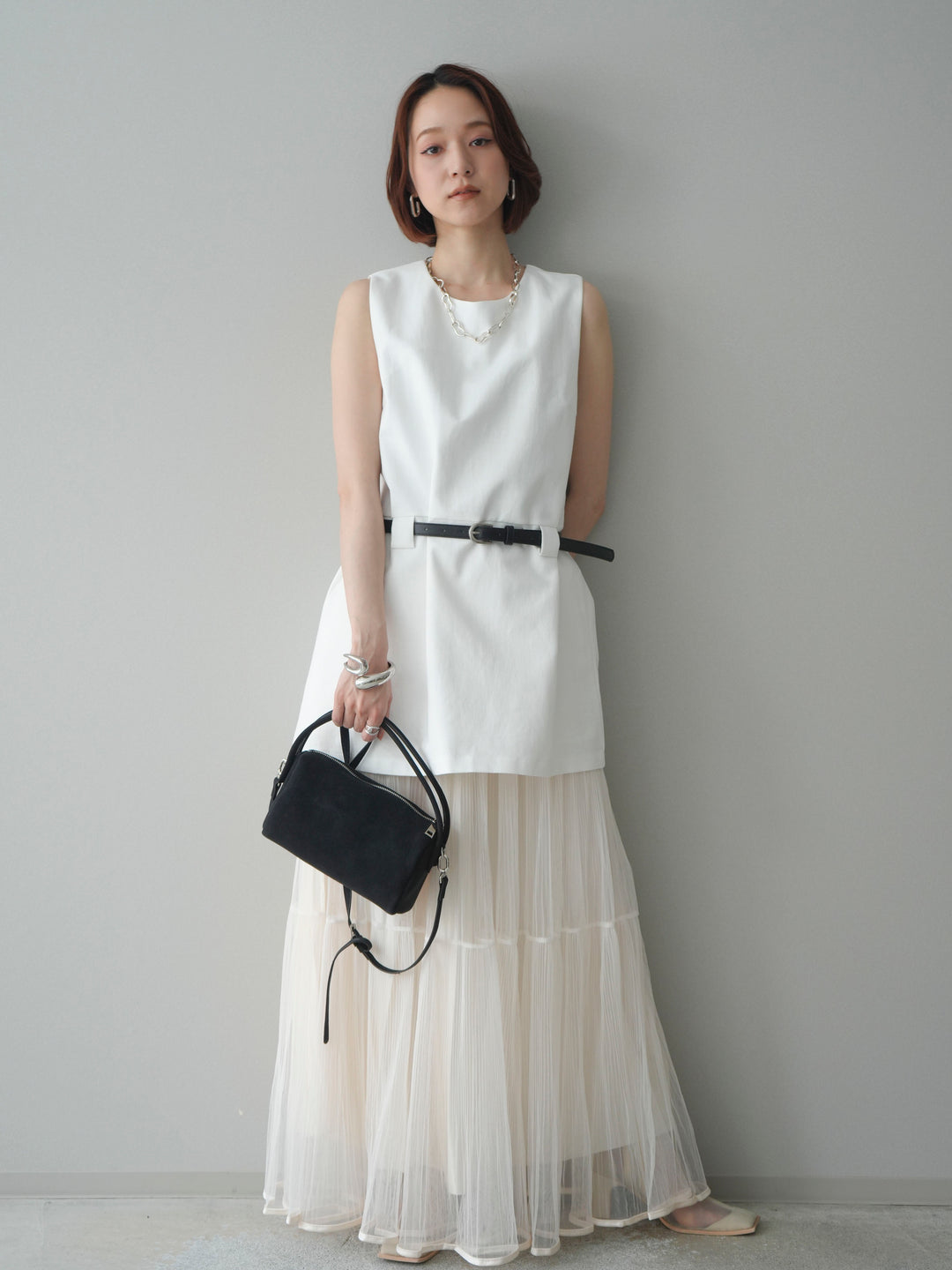 [SET]ベルト付リネンライクノースリチュニック+ラメプリーツレイヤードチュールロングスカート(2set)
