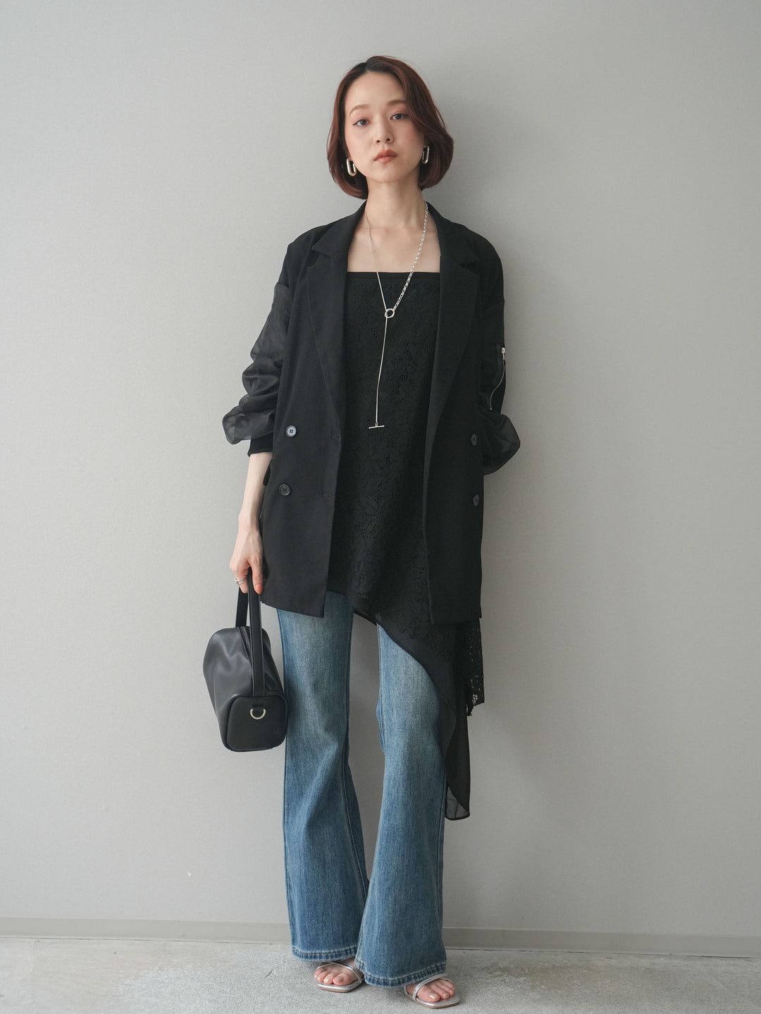 [SET]MA-1ドッキングデザインジャケット+シフォンレイヤードアシンメトリーレースキャミソール+ハイウエストフレアデニムパンツ(3set)