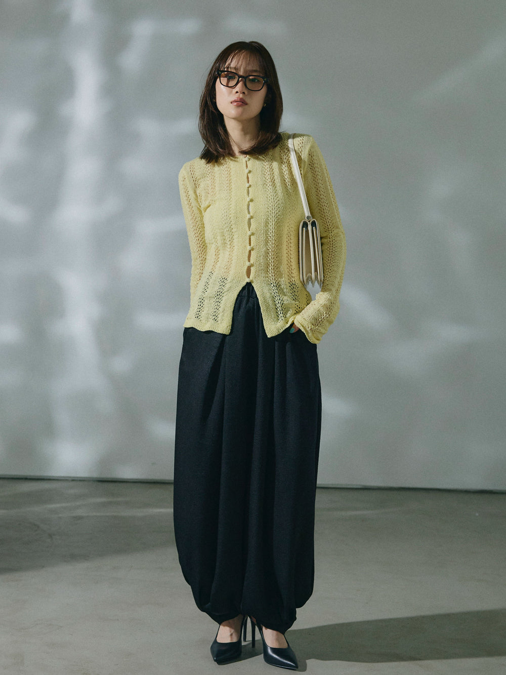 【Allure】[SET]透かし編みニットカーディガントップス+サイドピンタックレースイージーワイドパンツ(2set)