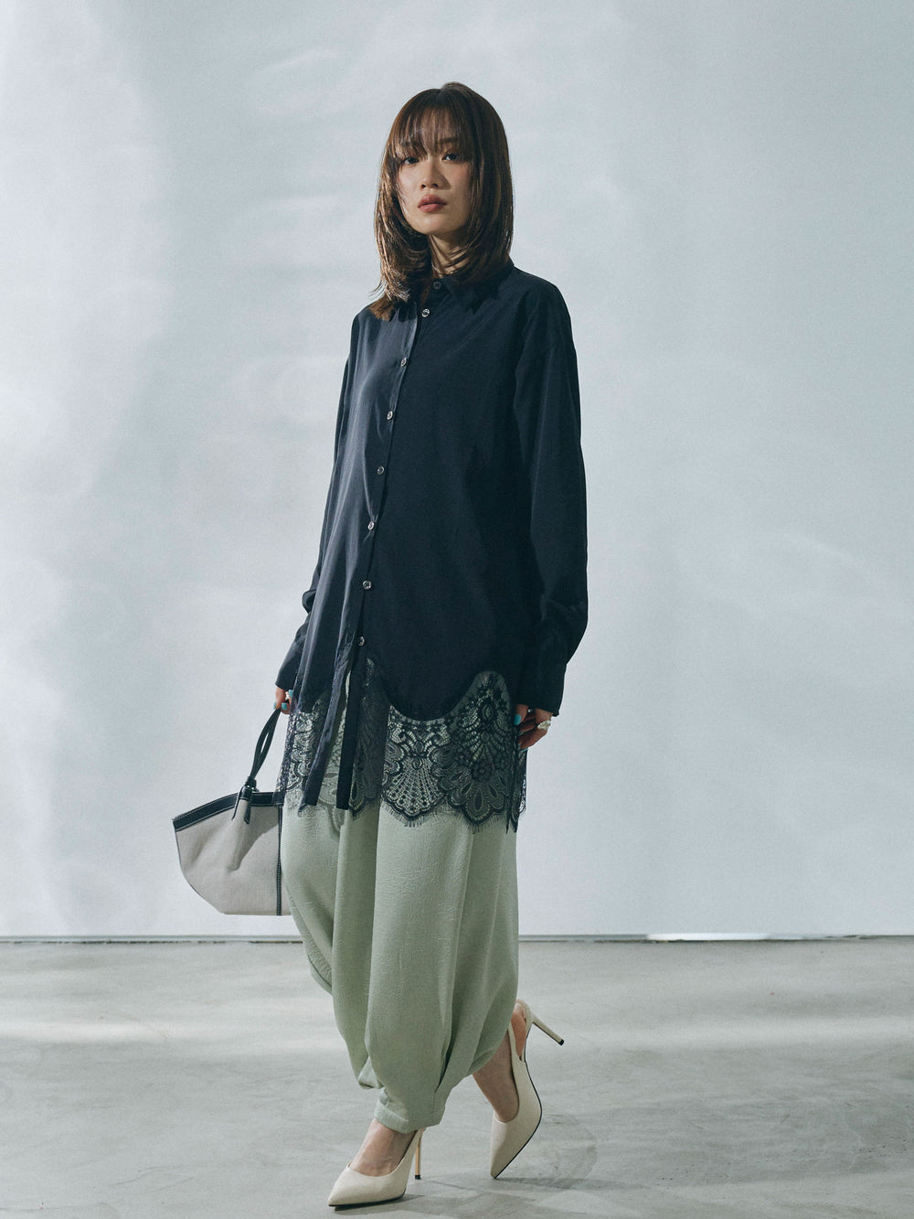 【Allure】[SET]裾レースポプリンシャツ+ワッシャーサテンタックジョガーパンツ(2set)