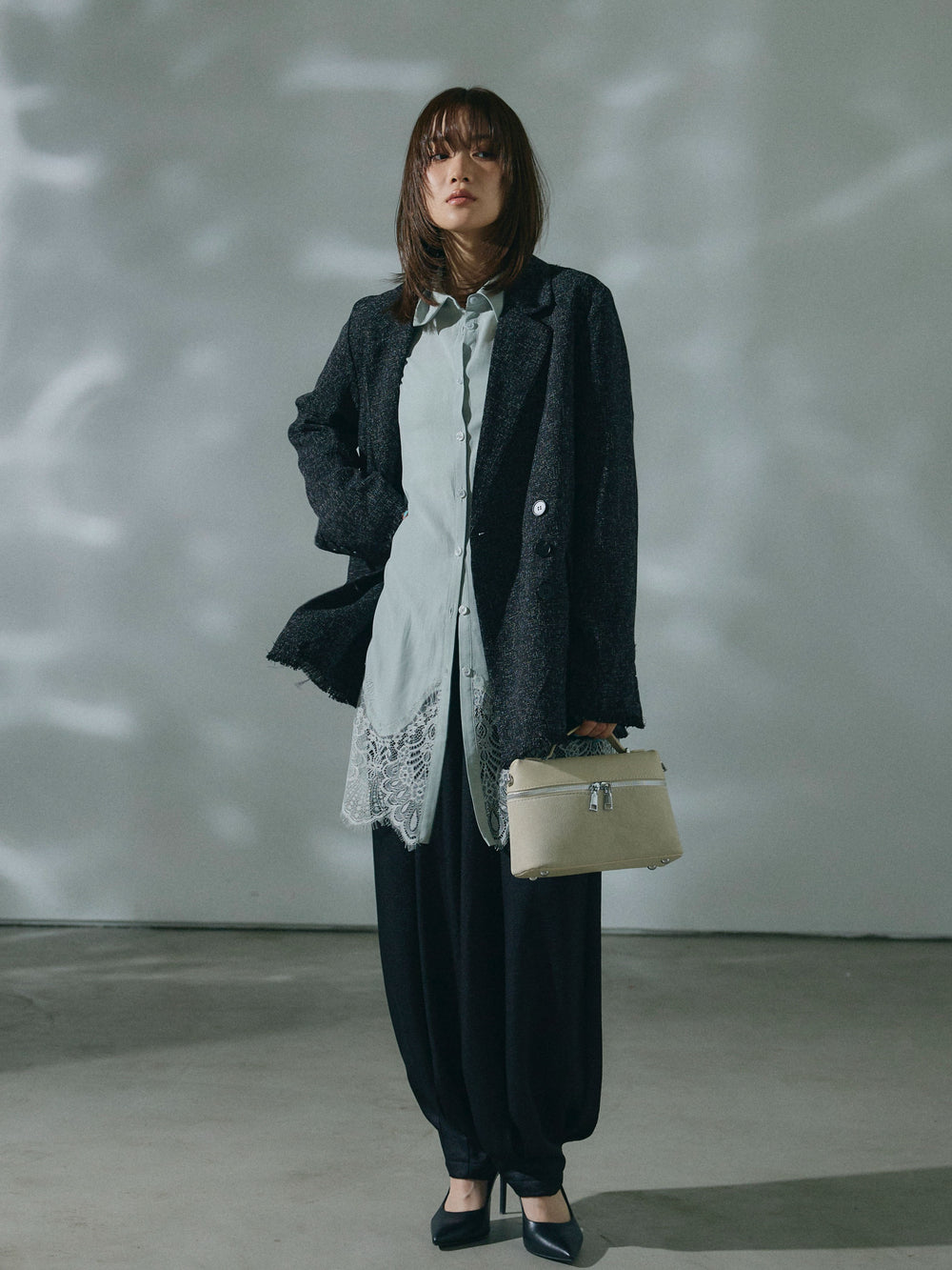 【Allure】[SET]スラブツイードフリンジテーラージャケット+裾レースポプリンシャツ+ワッシャーサテンタックジョガーパンツ(3set)