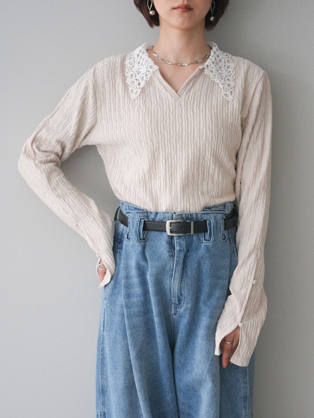 [SET]袖スリットレースカラートップス+ハイウエストベルトループデザインデニムパンツ(2set)