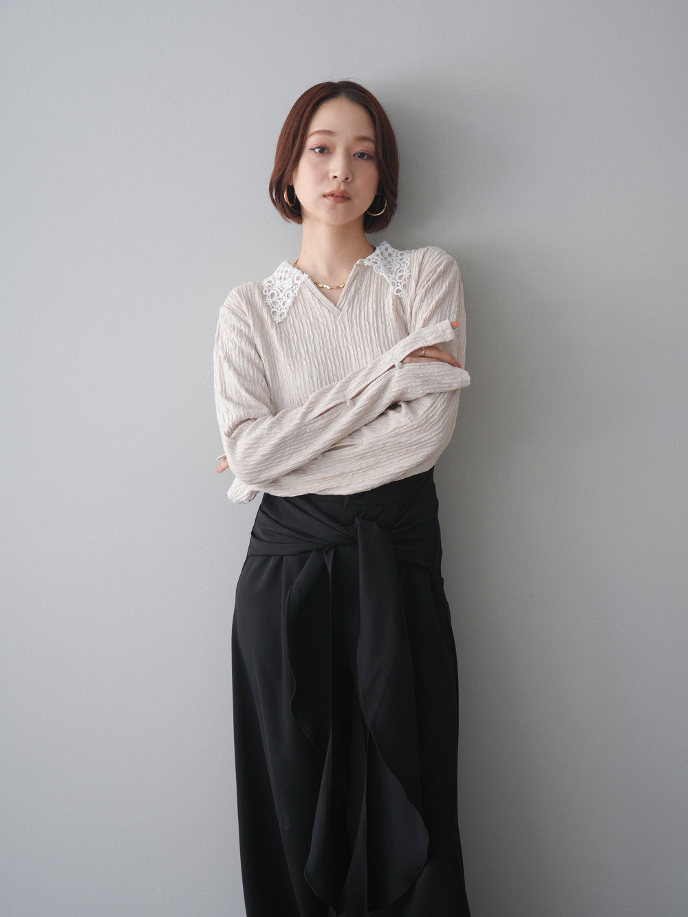 [SET]袖スリットレースカラートップス+ラッフルベルトワイドパンツ(2set)