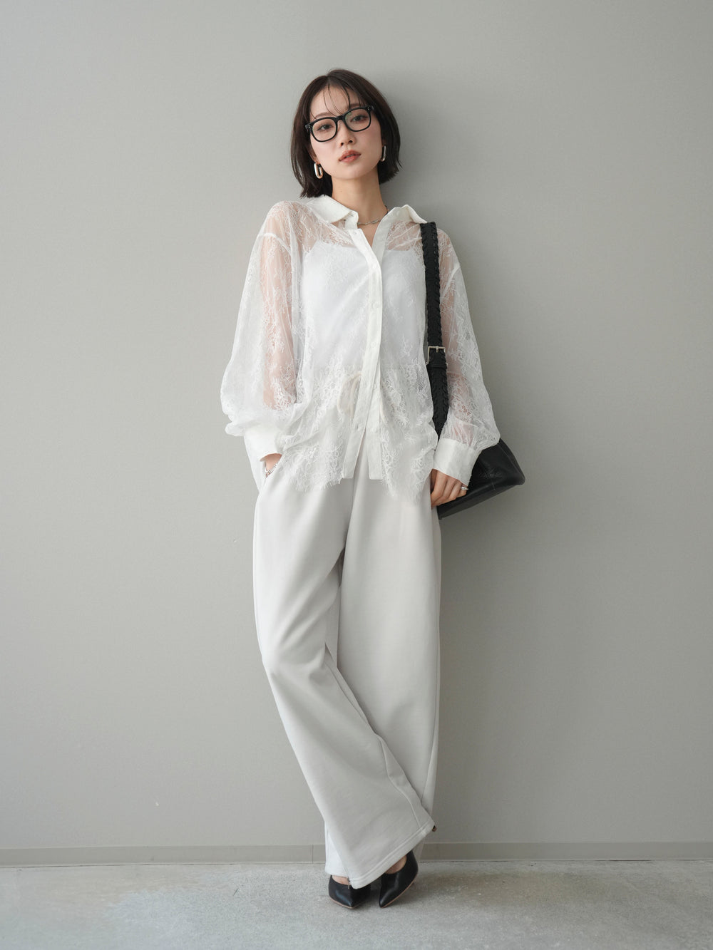 [SET]総レースボリュームスリーブシャツ+カップ付きバッククロスキャミソール+裾ZIPスエットワイドパンツ(3set)