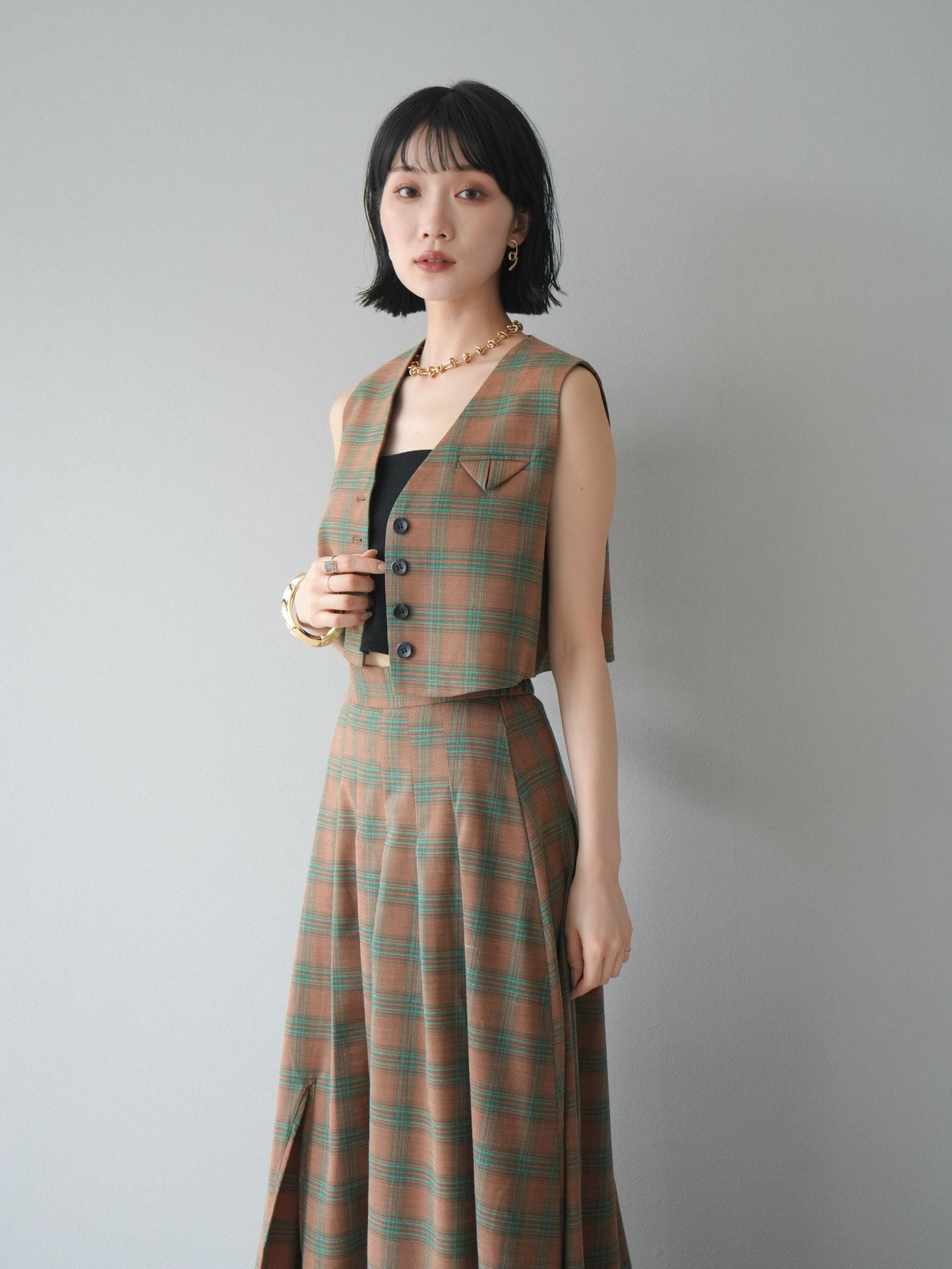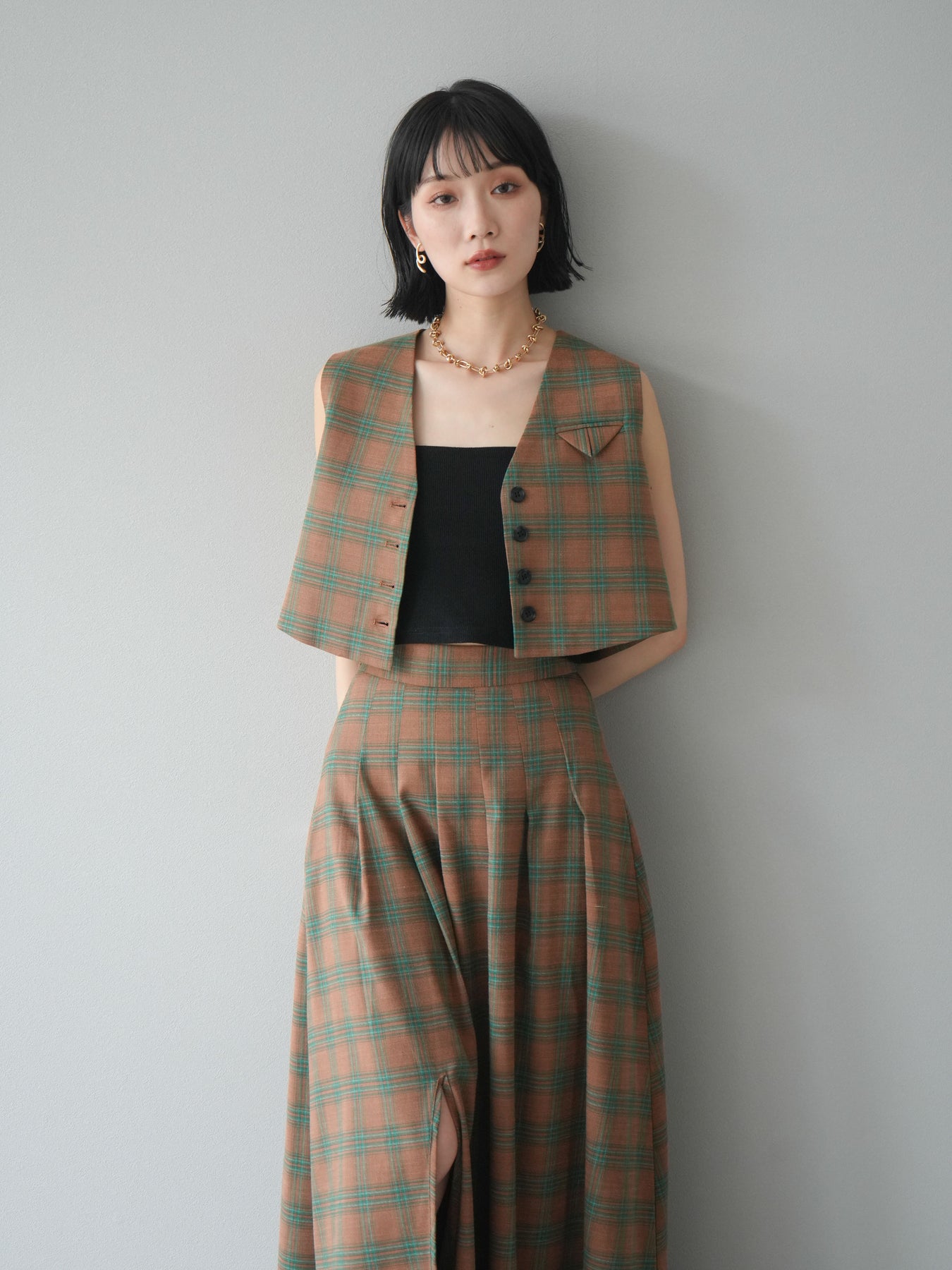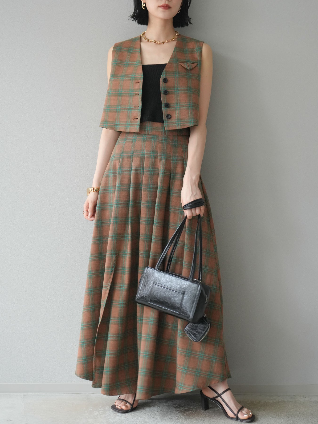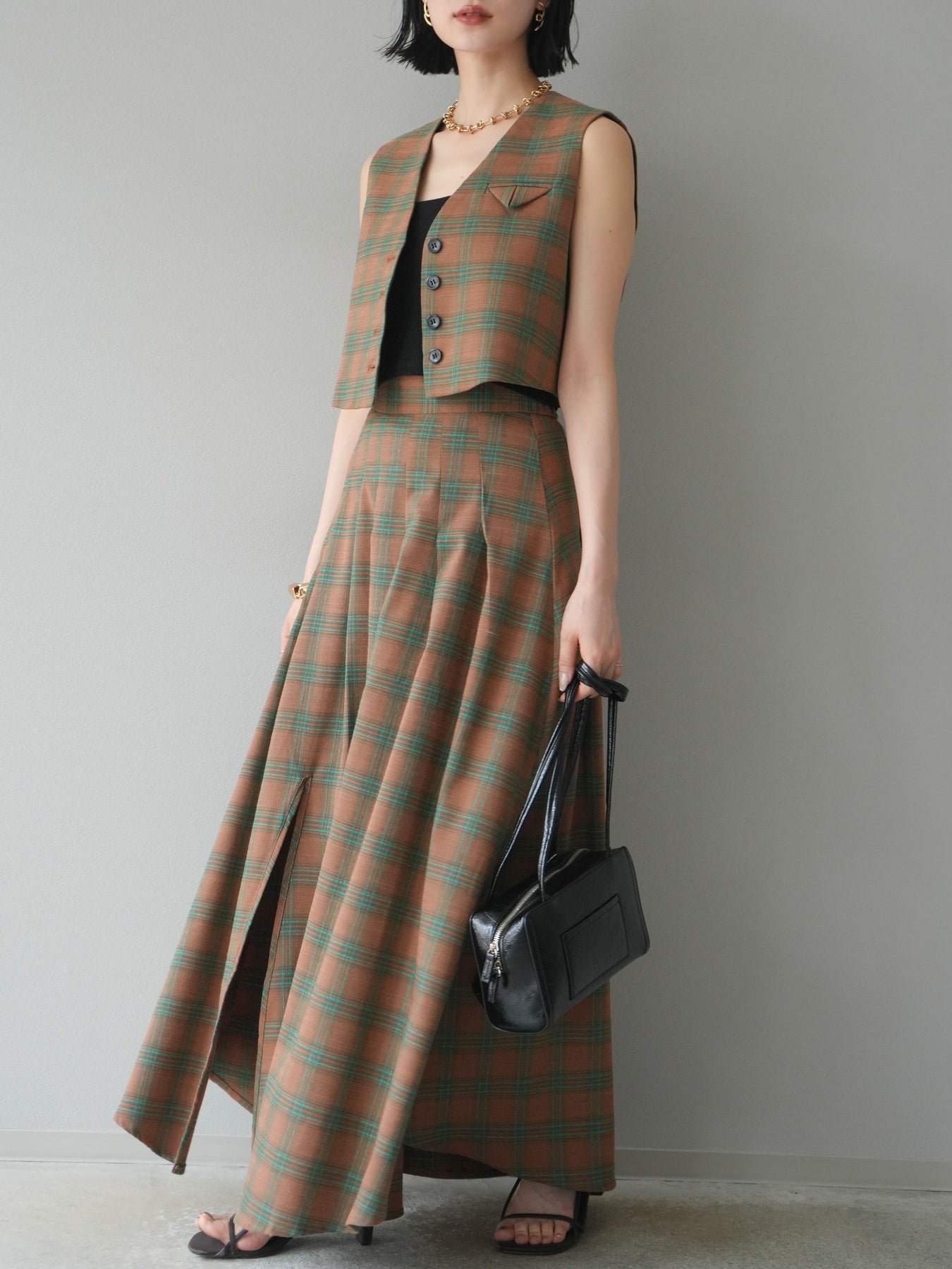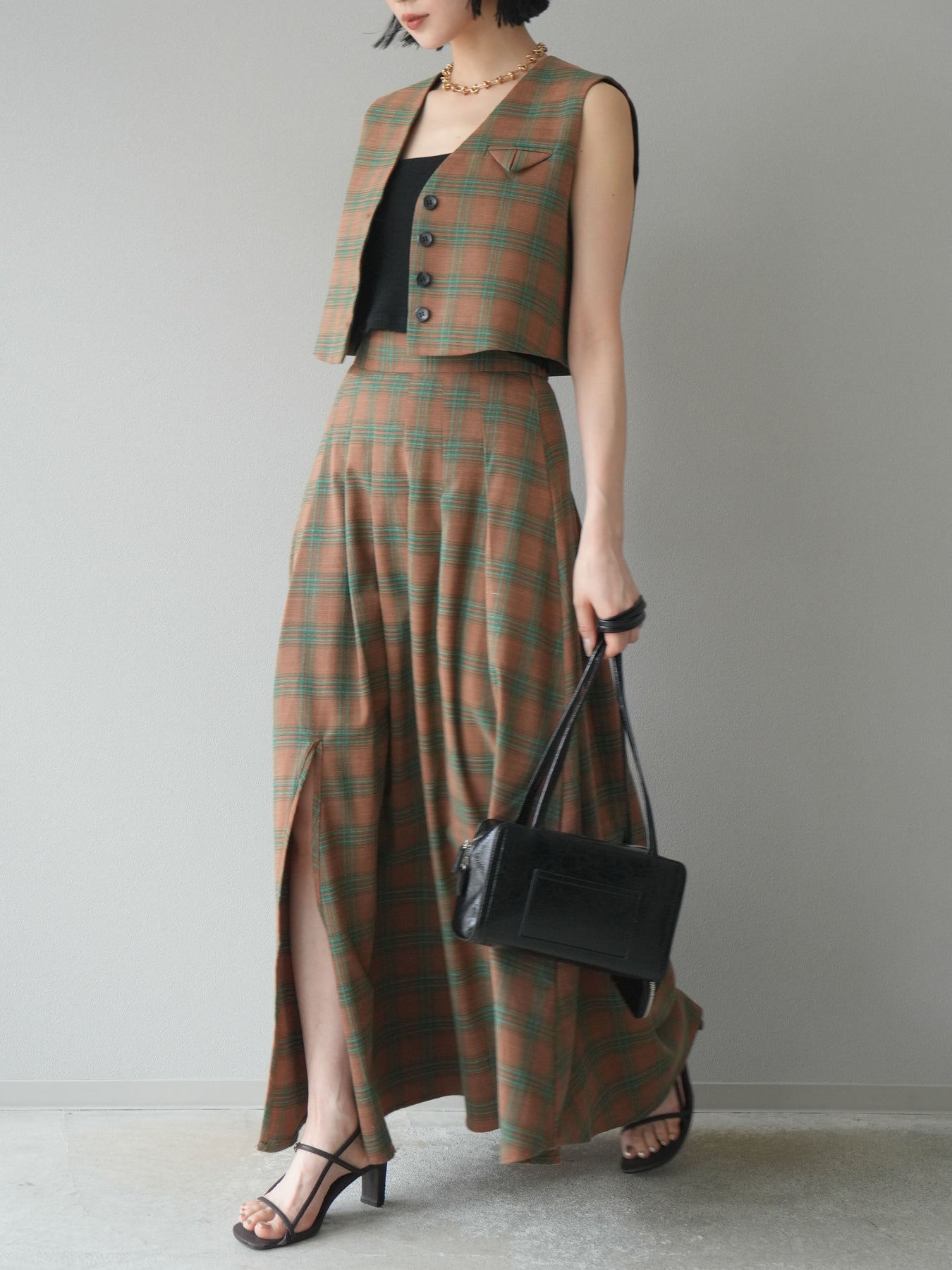 [予約]チェック柄ベスト&フロントスリットタックスカートSET UP