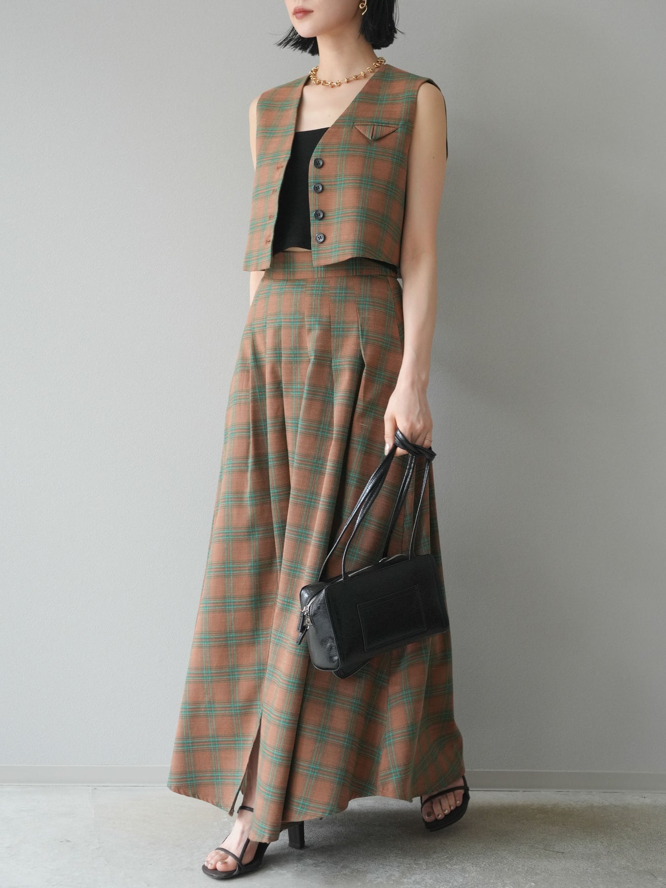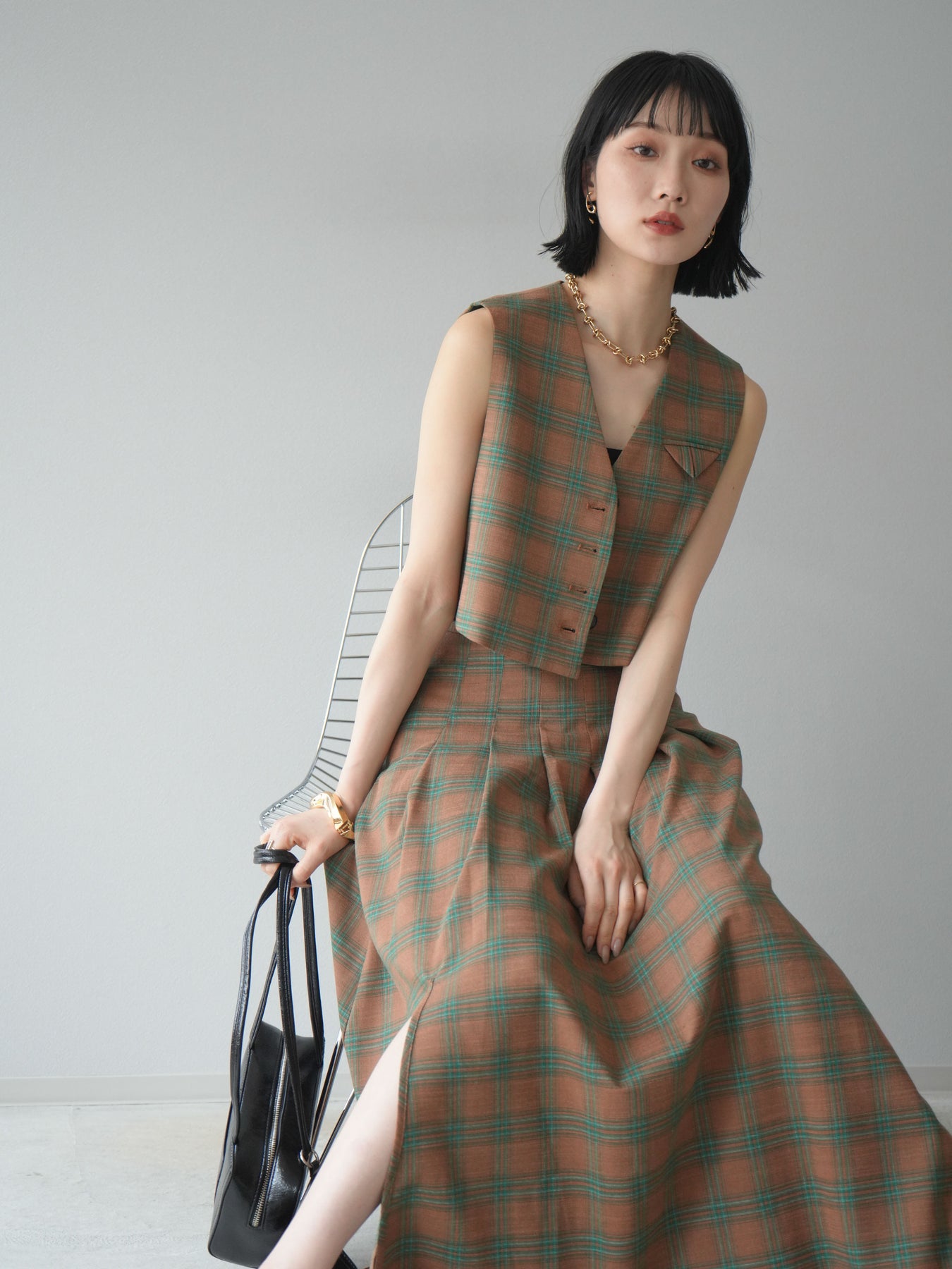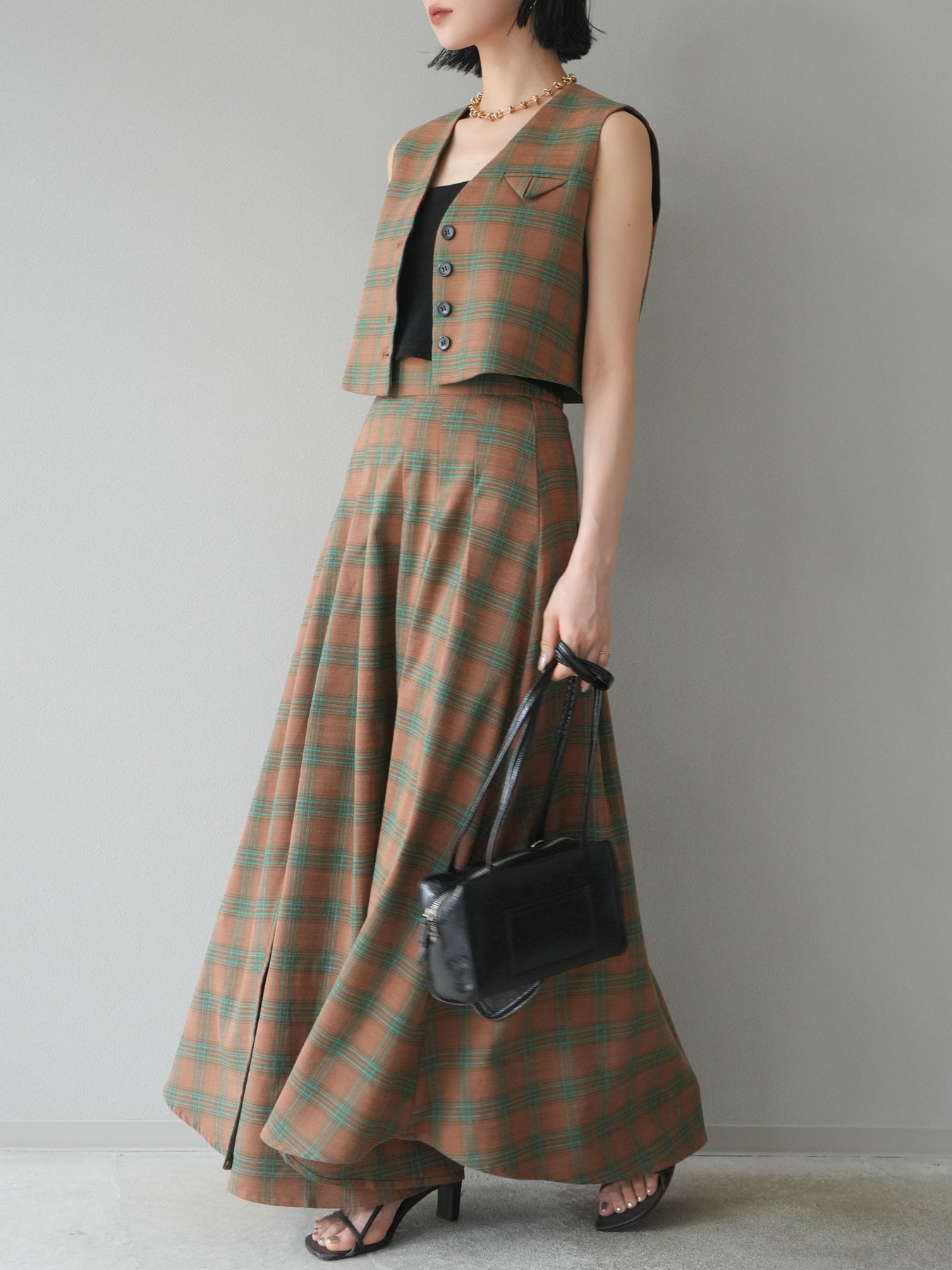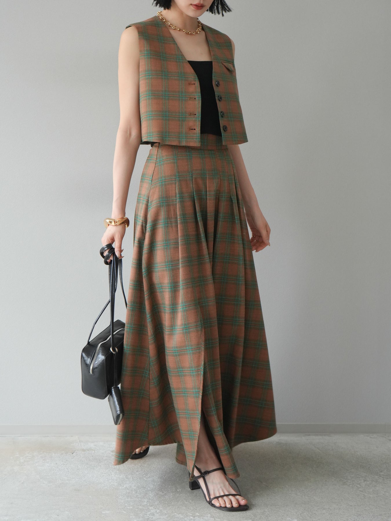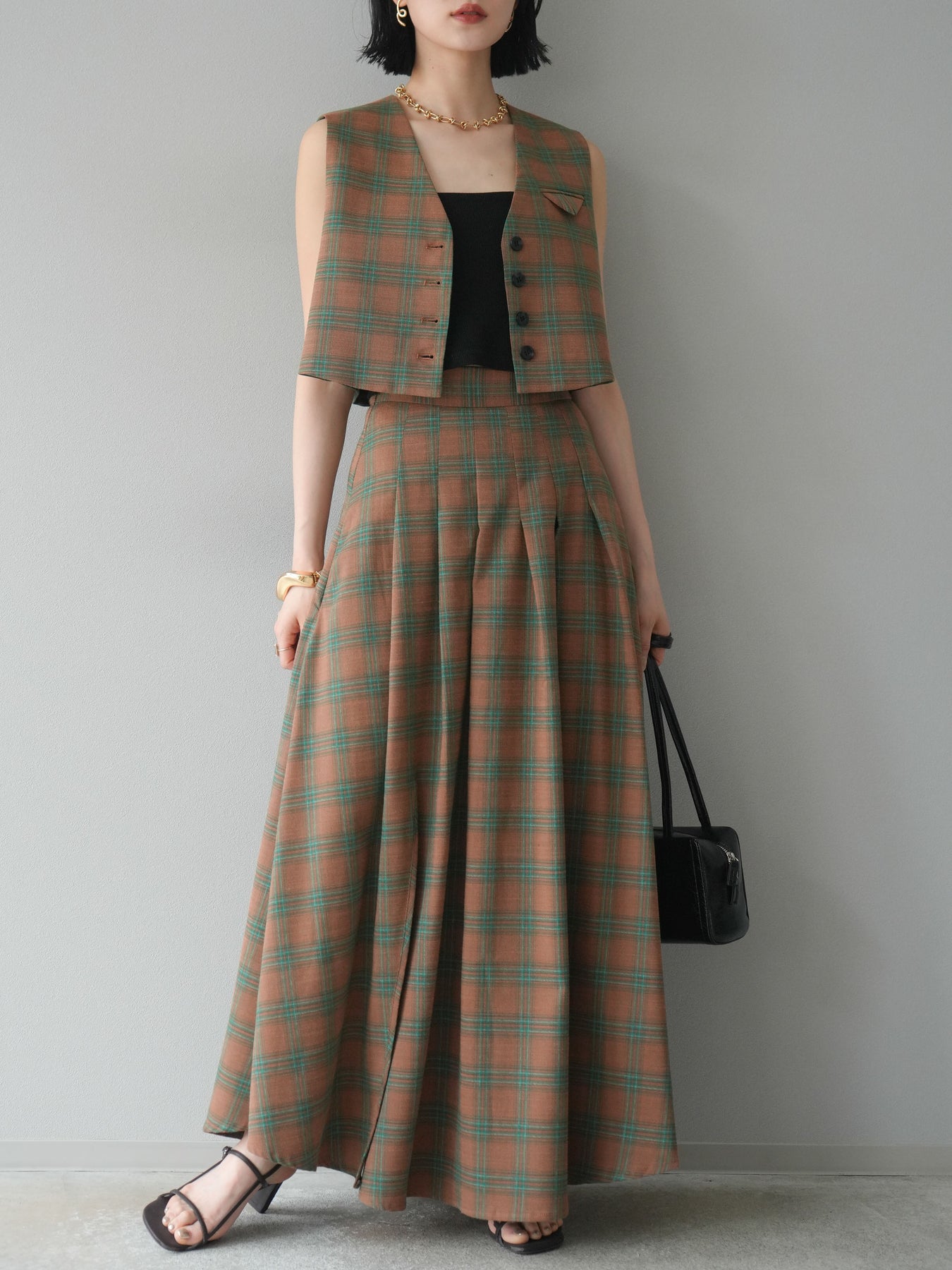 [予約]チェック柄ベスト&フロントスリットタックスカートSET UP
