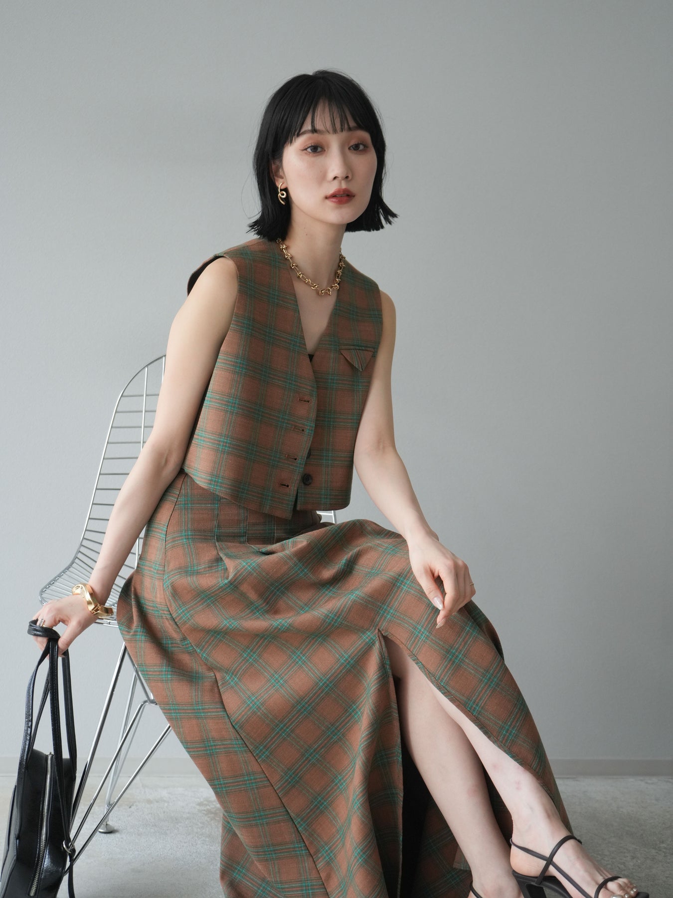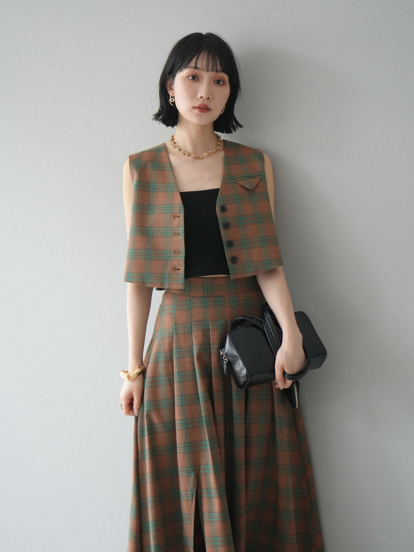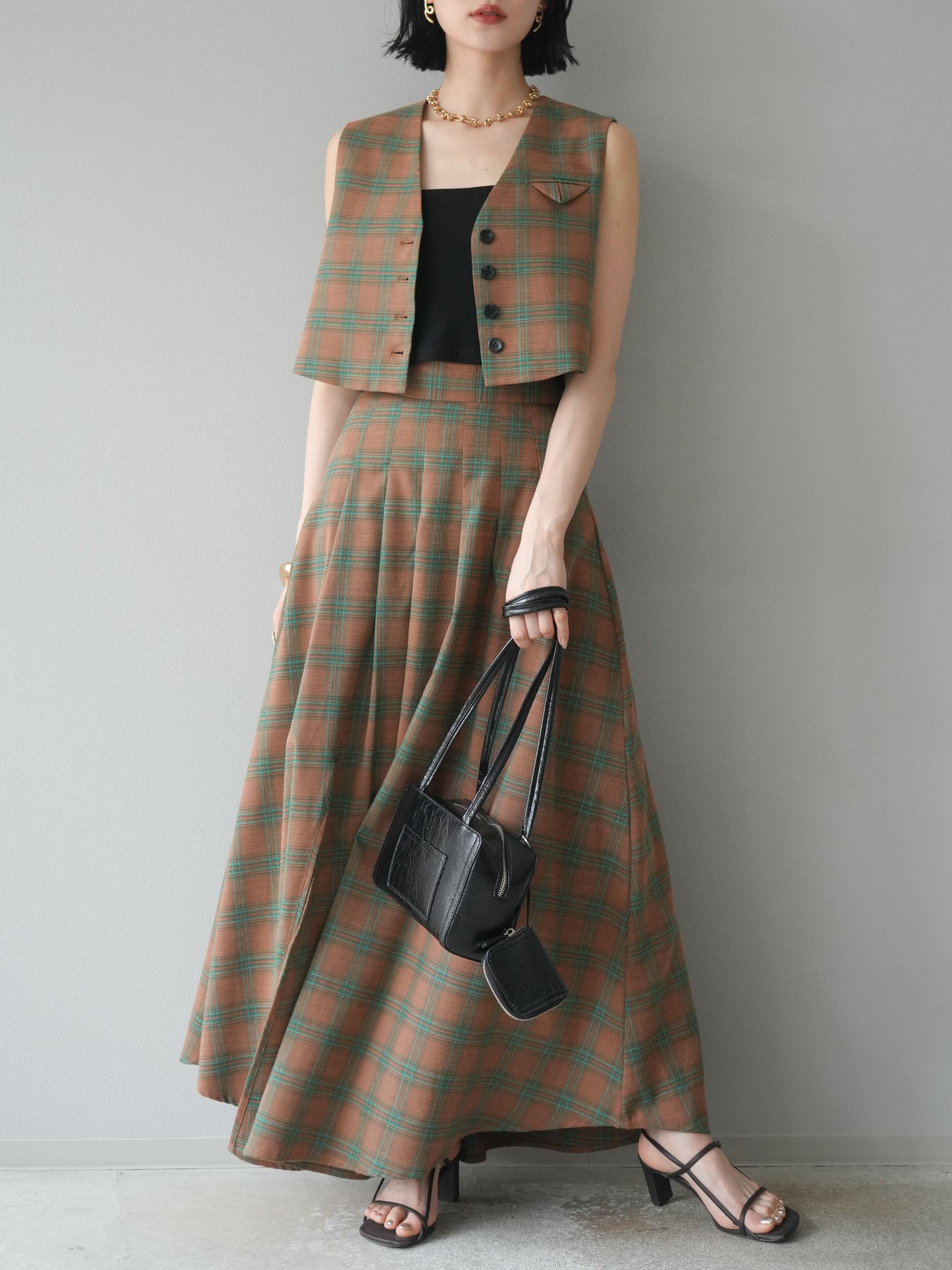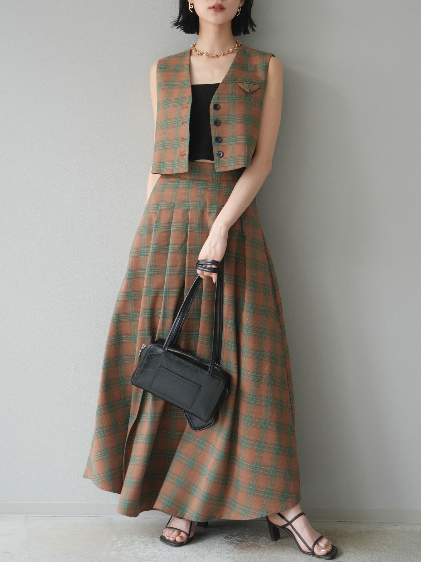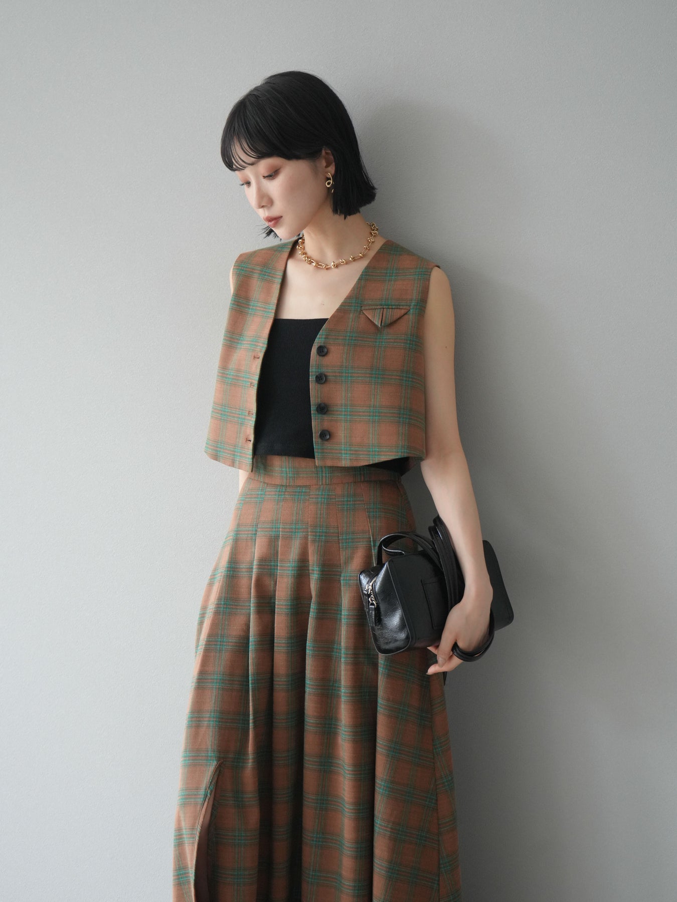 [予約]チェック柄ベスト&フロントスリットタックスカートSET UP