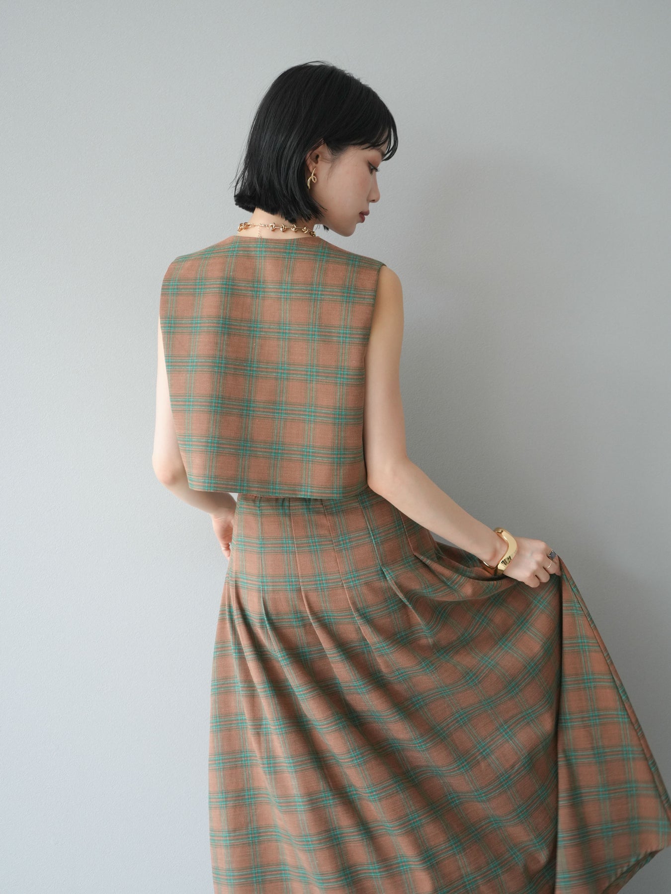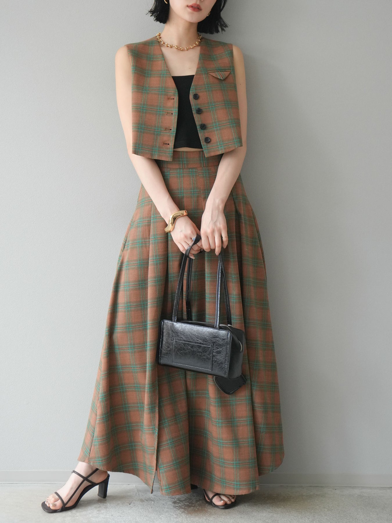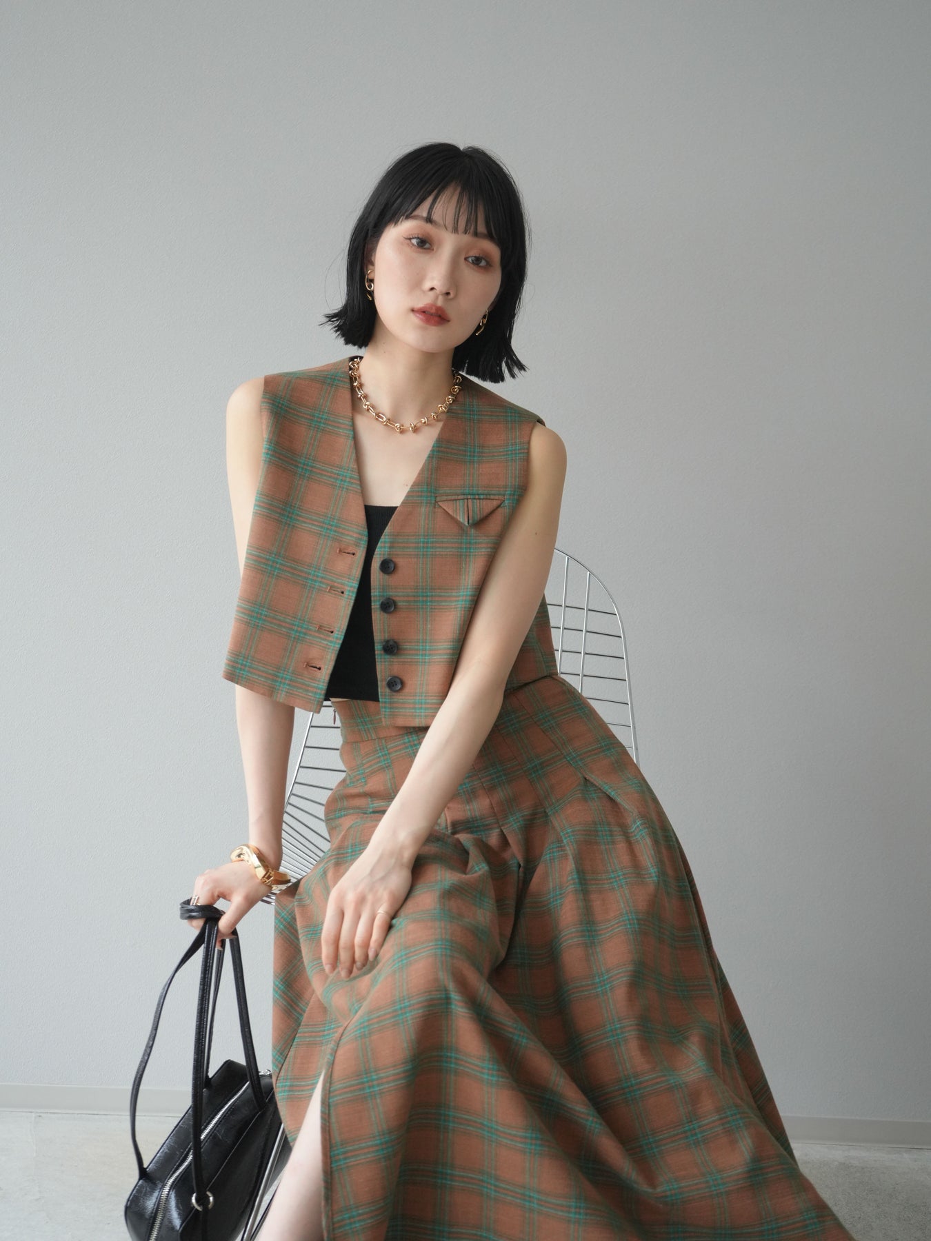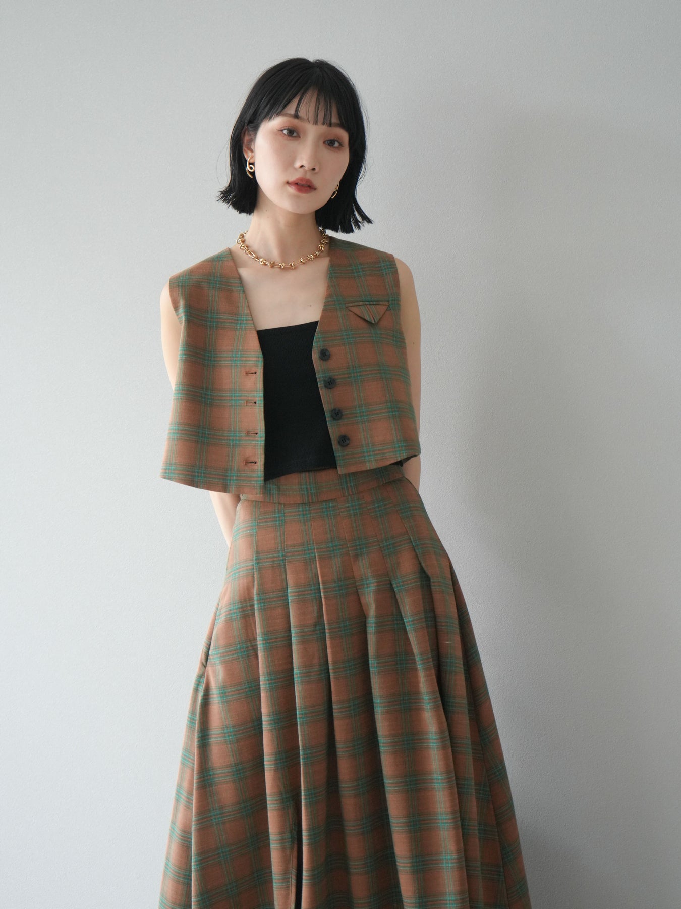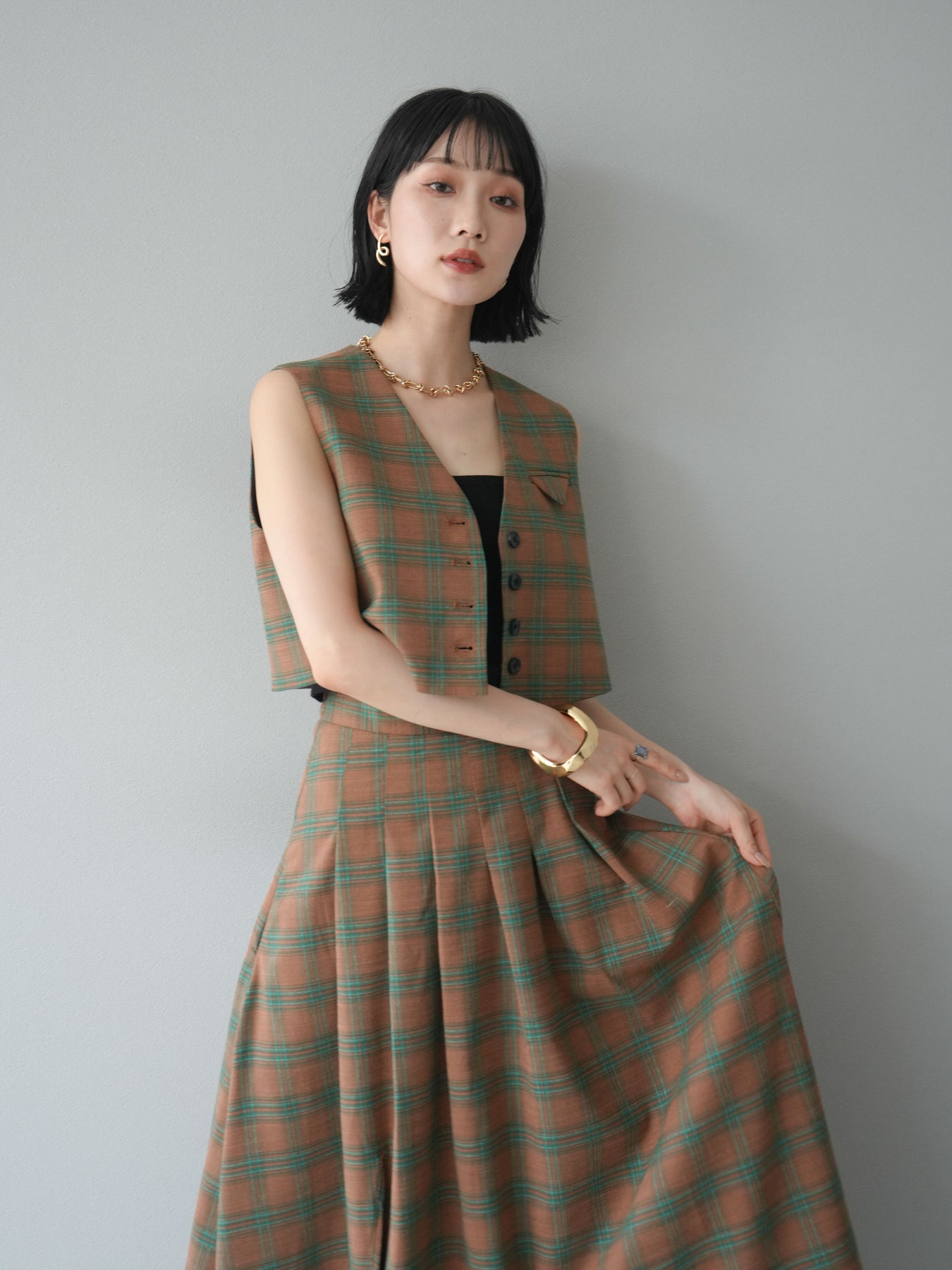 [予約]チェック柄ベスト&フロントスリットタックスカートSET UP