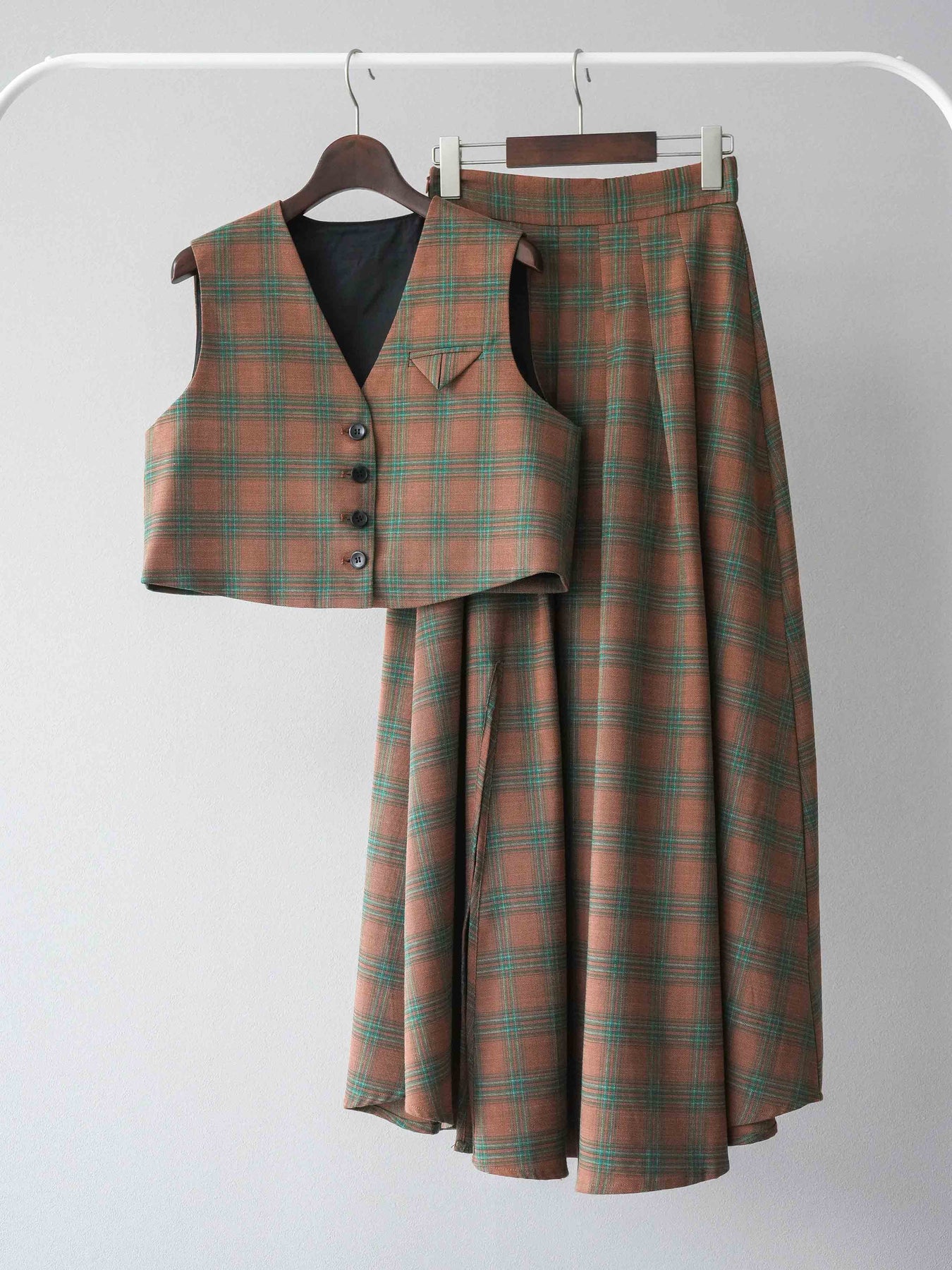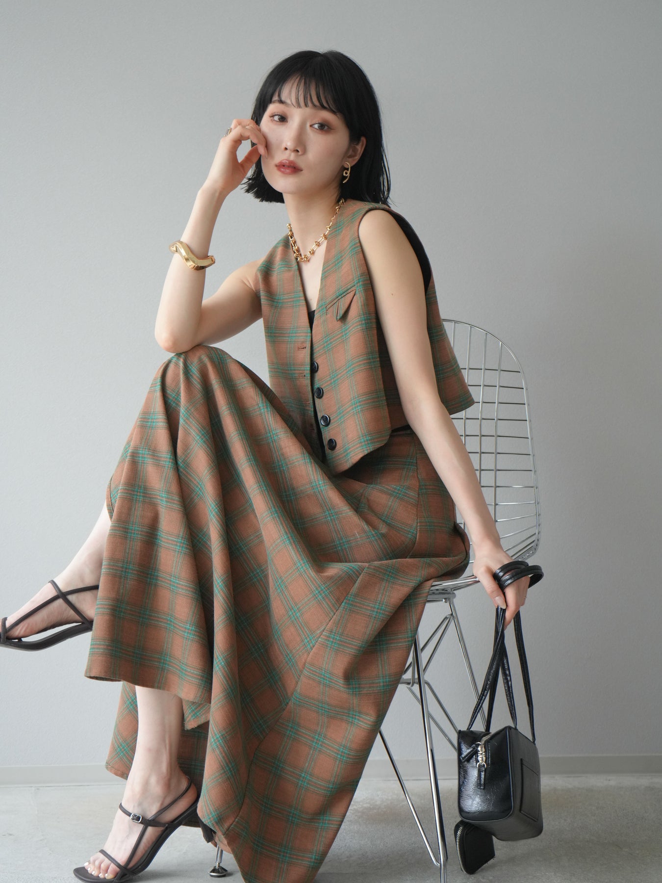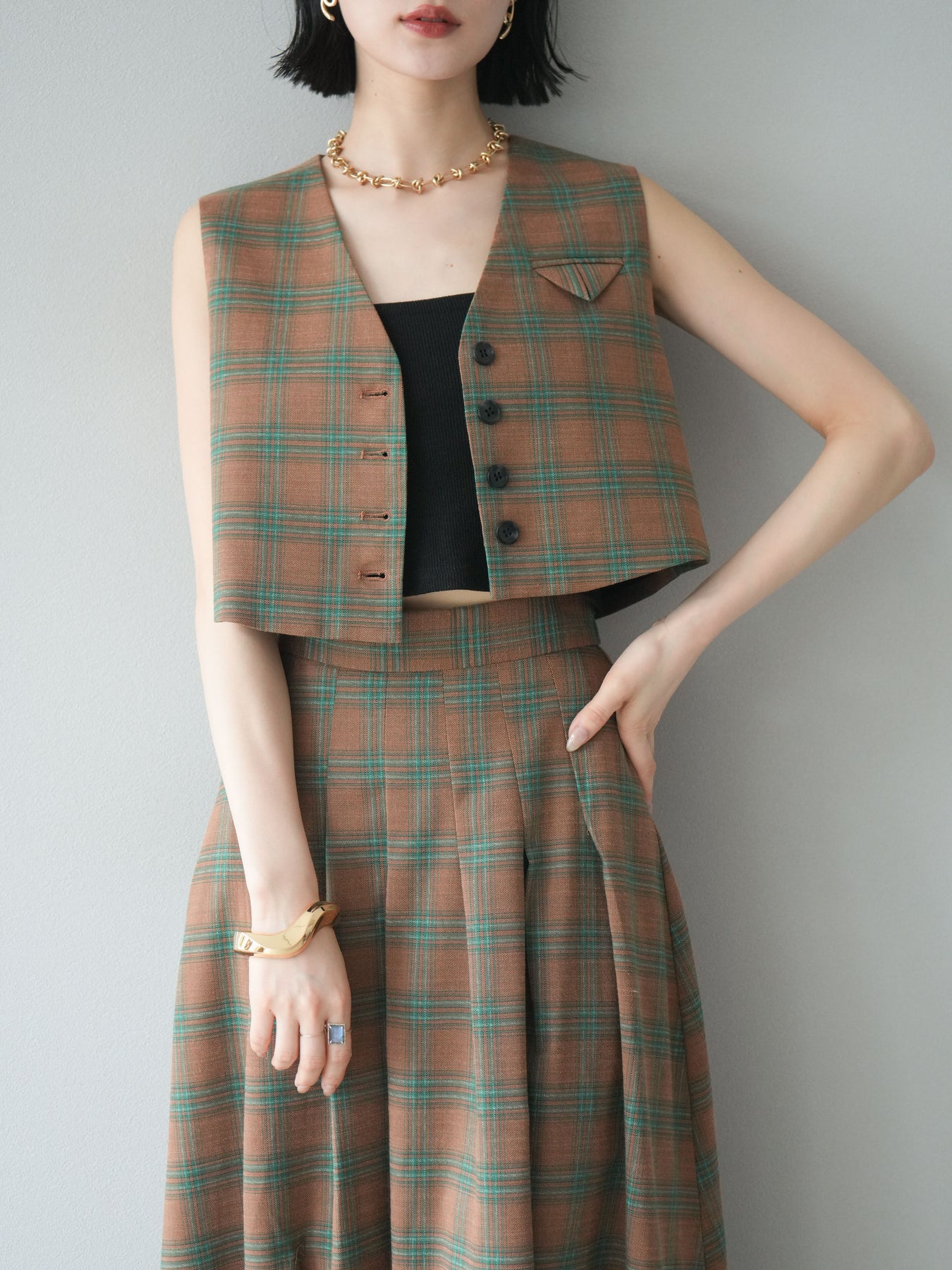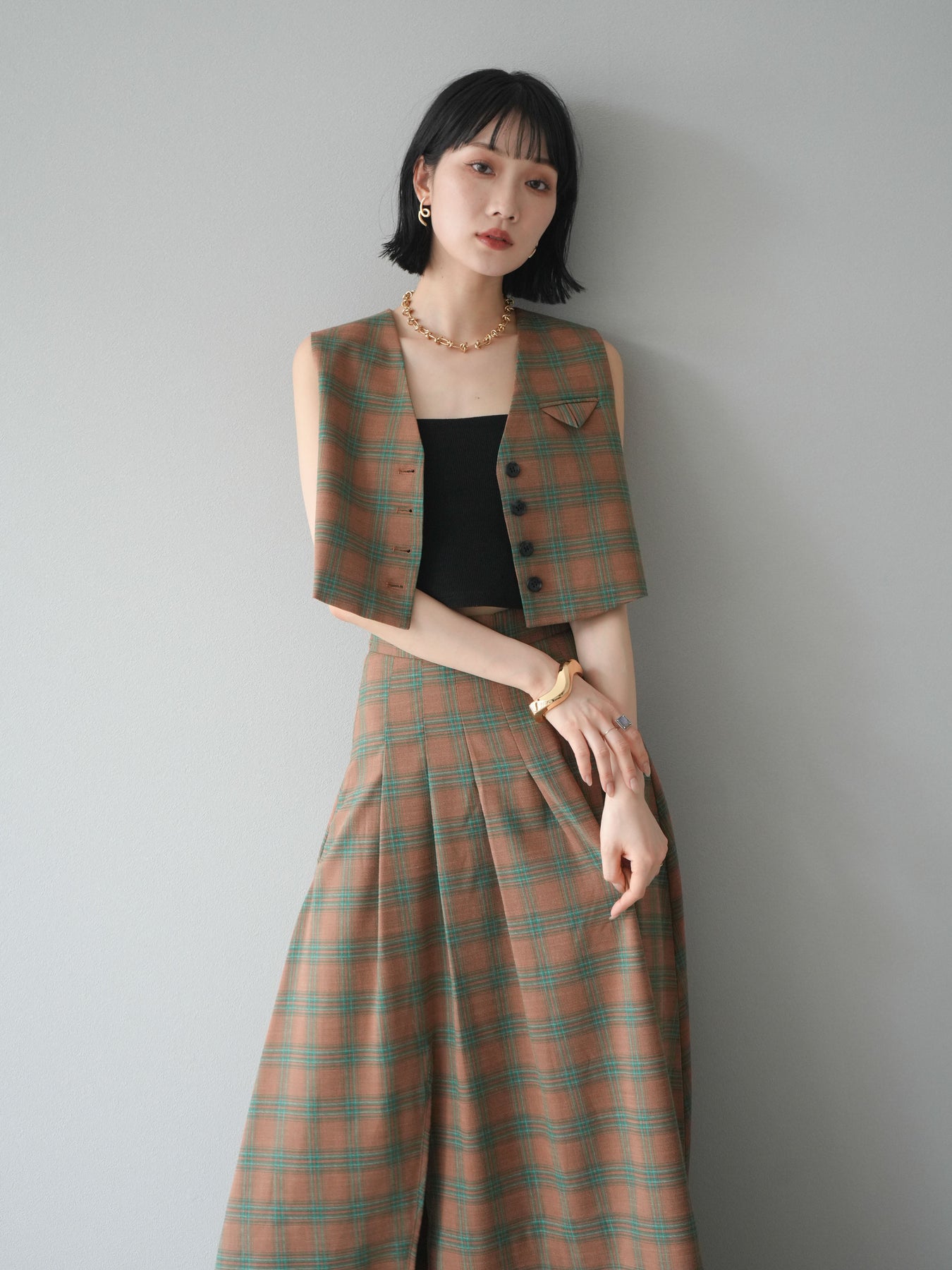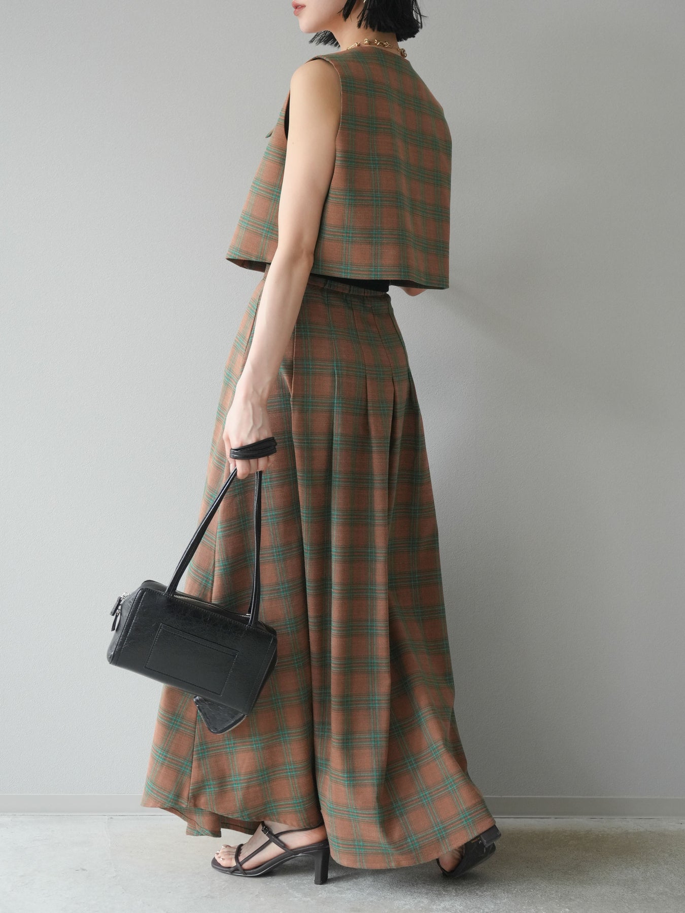 [予約]チェック柄ベスト&フロントスリットタックスカートSET UP