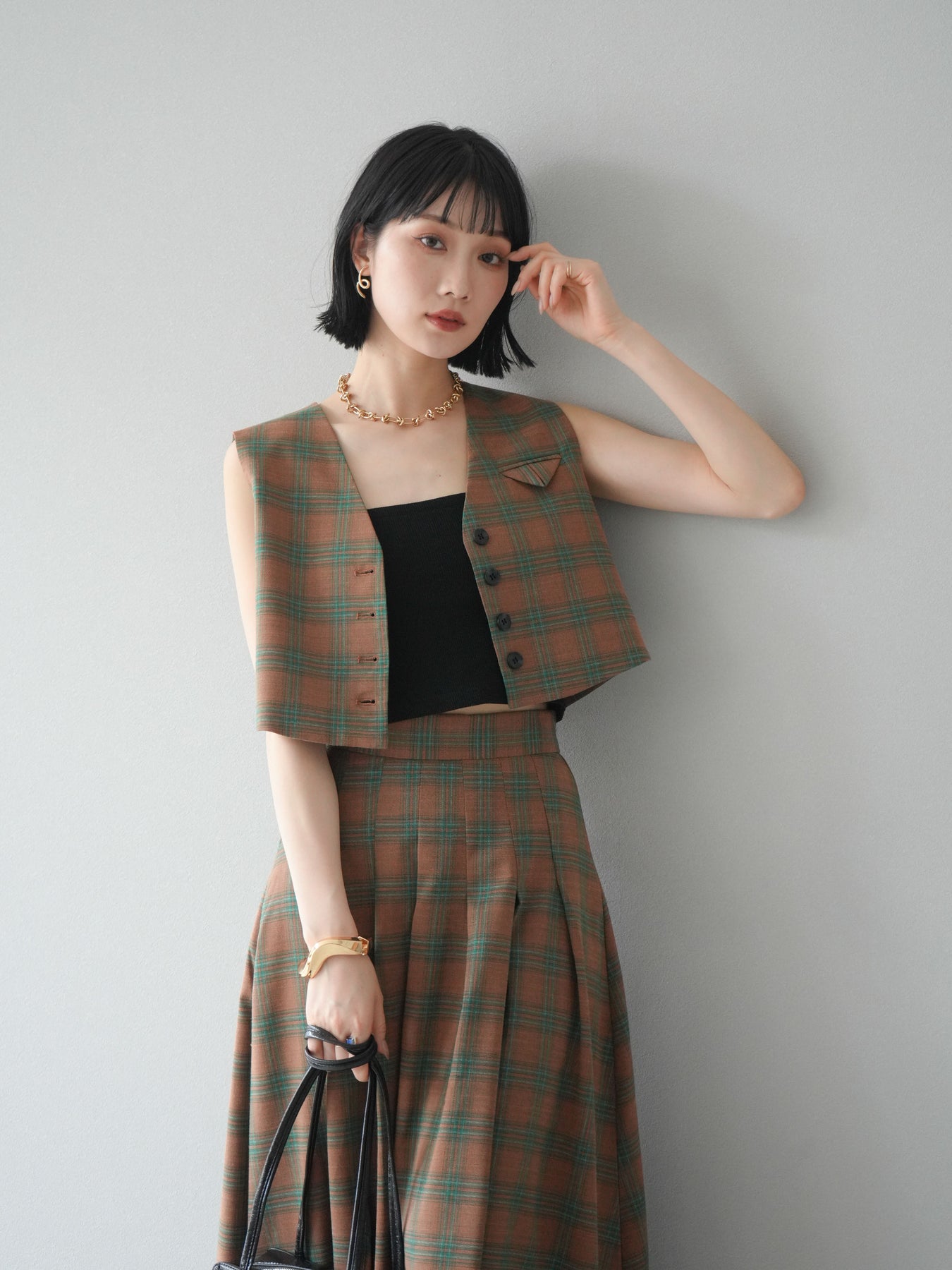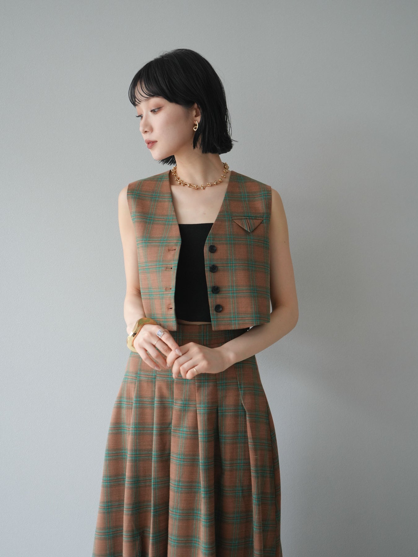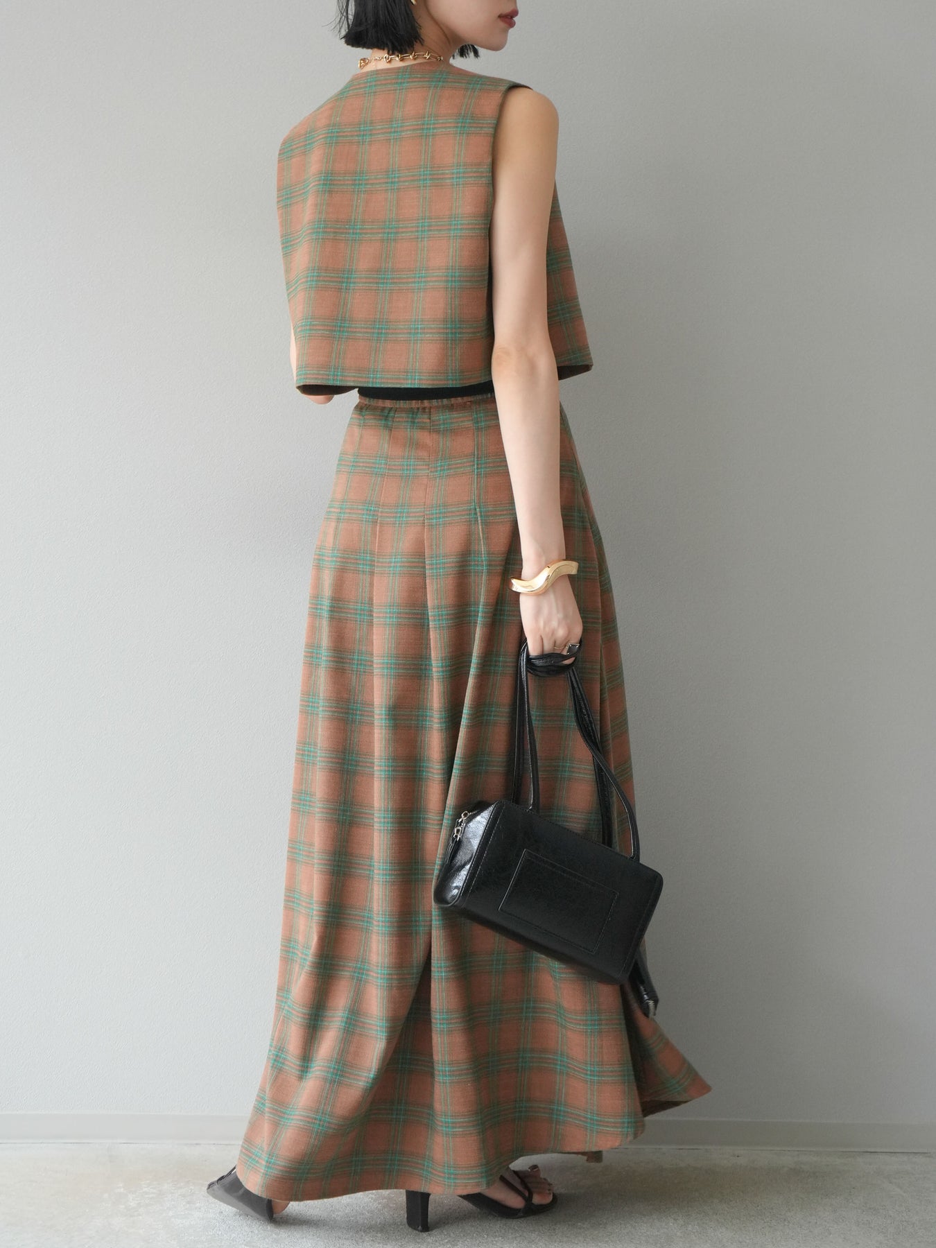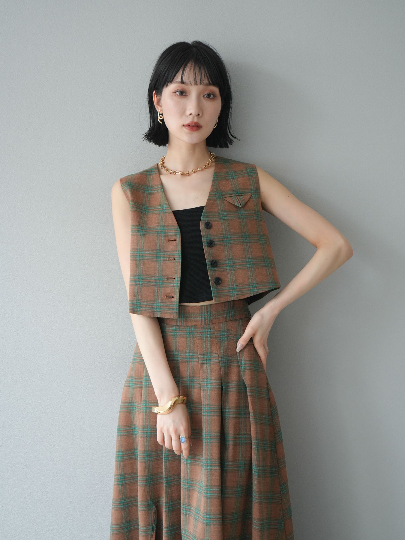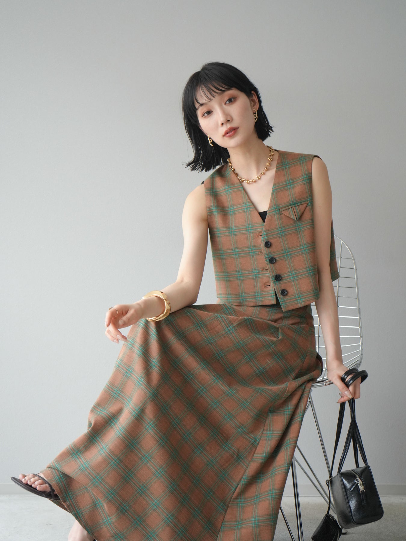 [予約]チェック柄ベスト&フロントスリットタックスカートSET UP