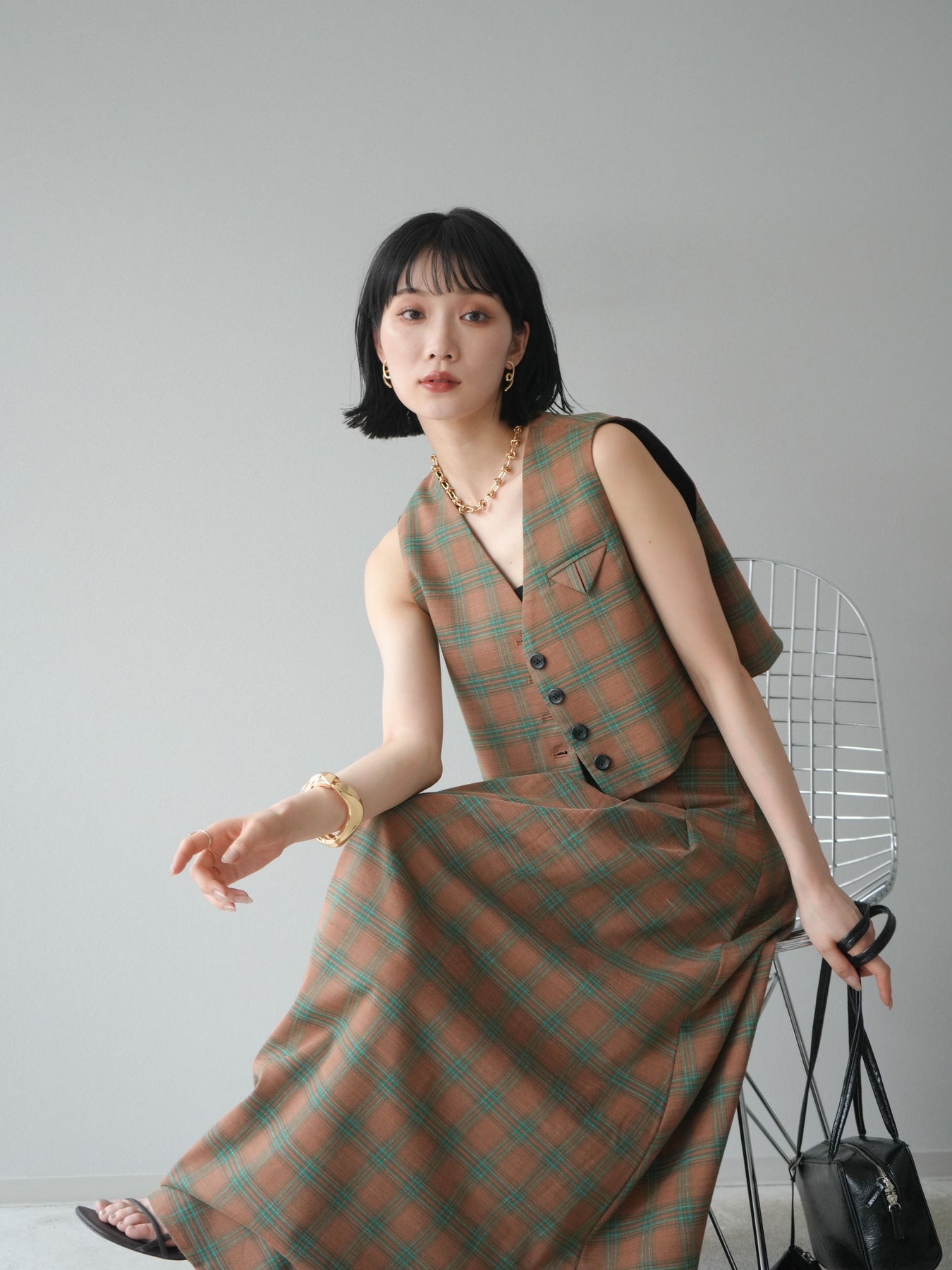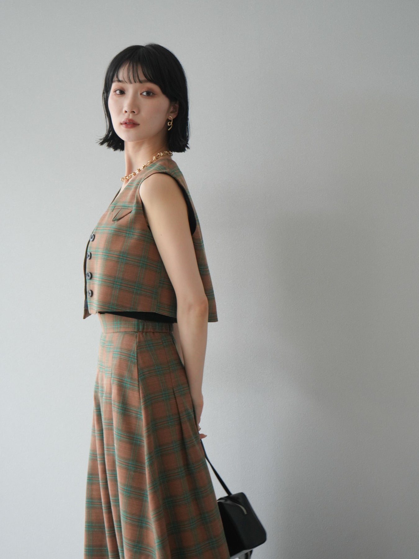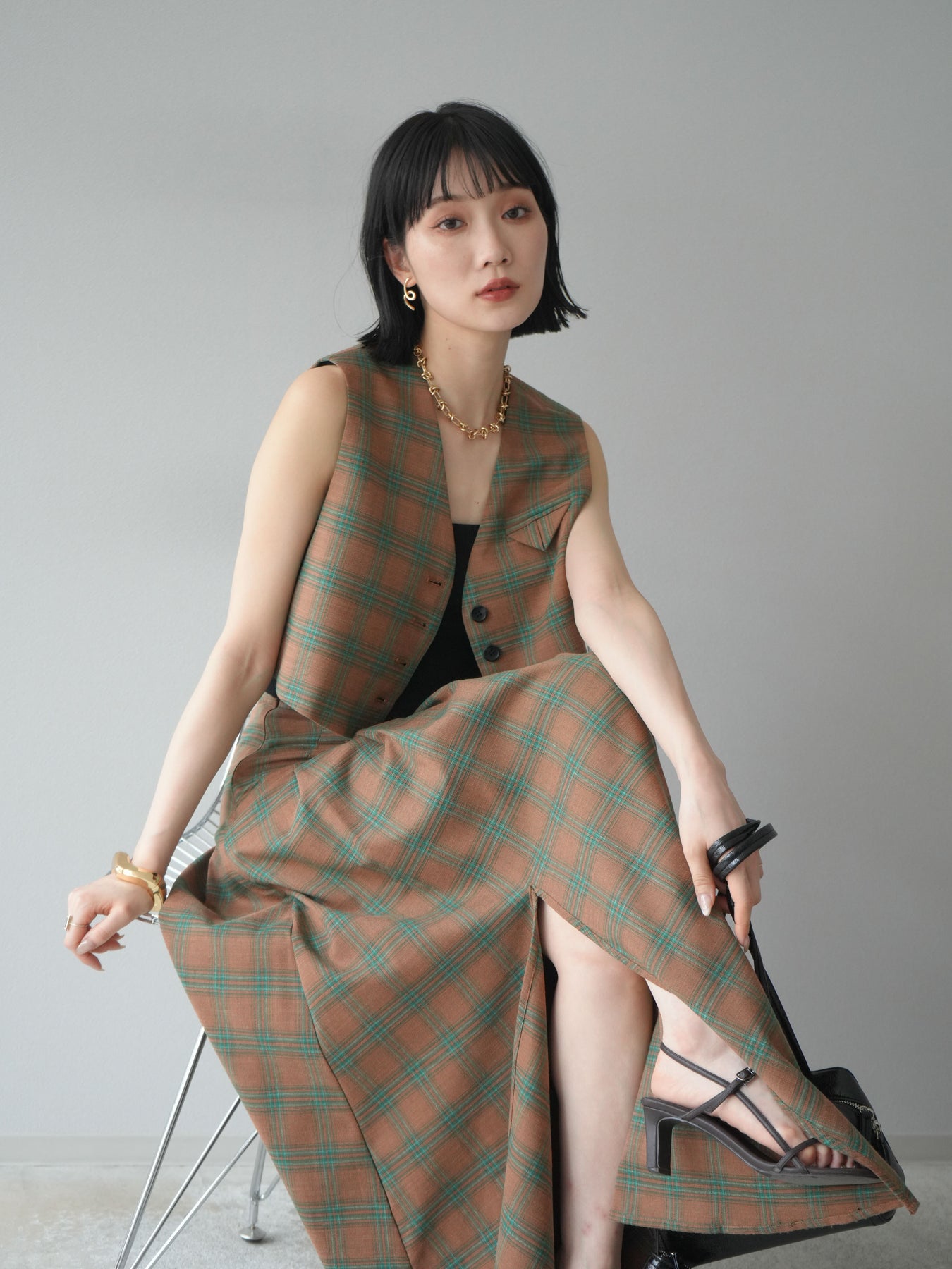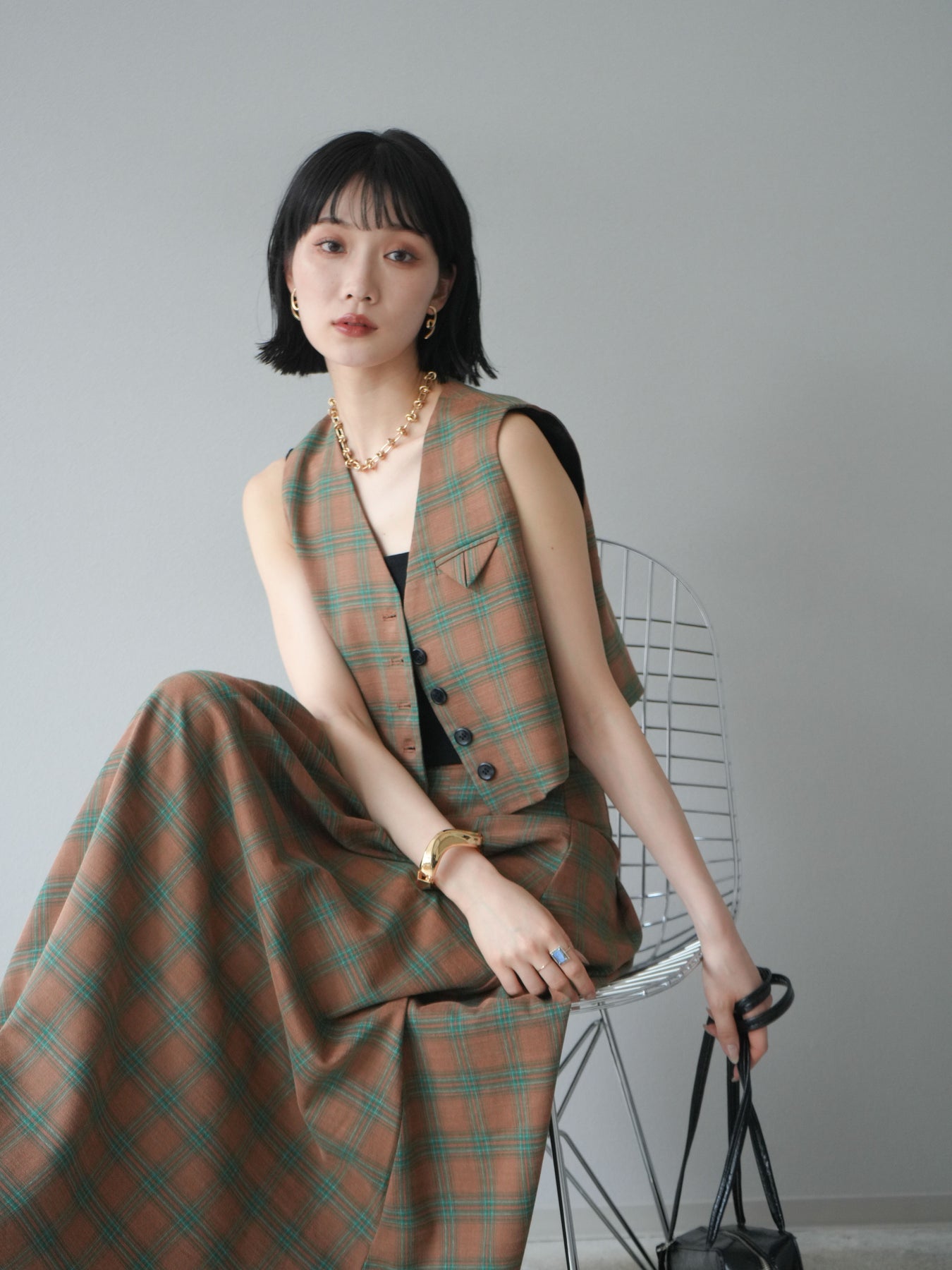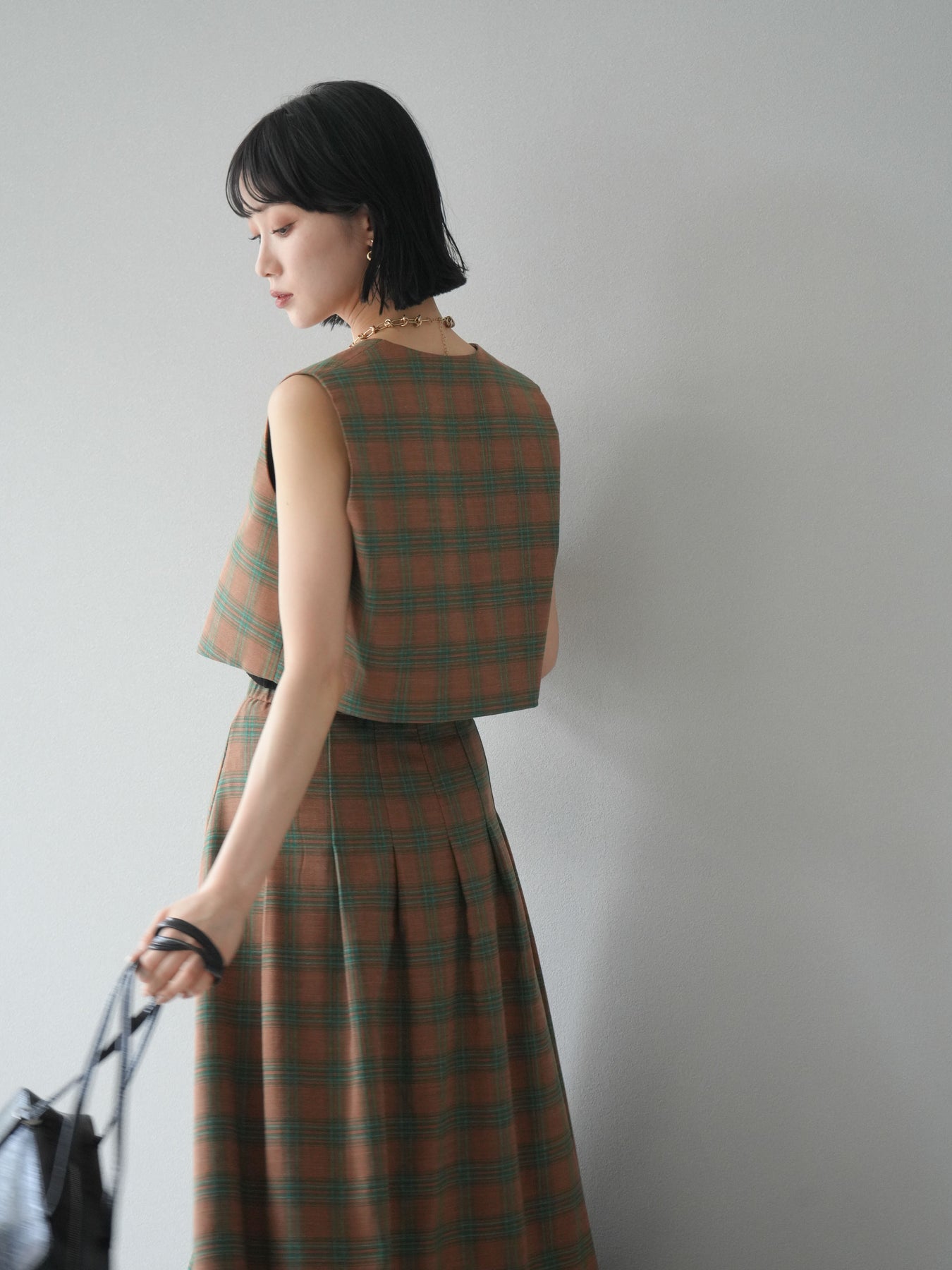 [予約]チェック柄ベスト&フロントスリットタックスカートSET UP
