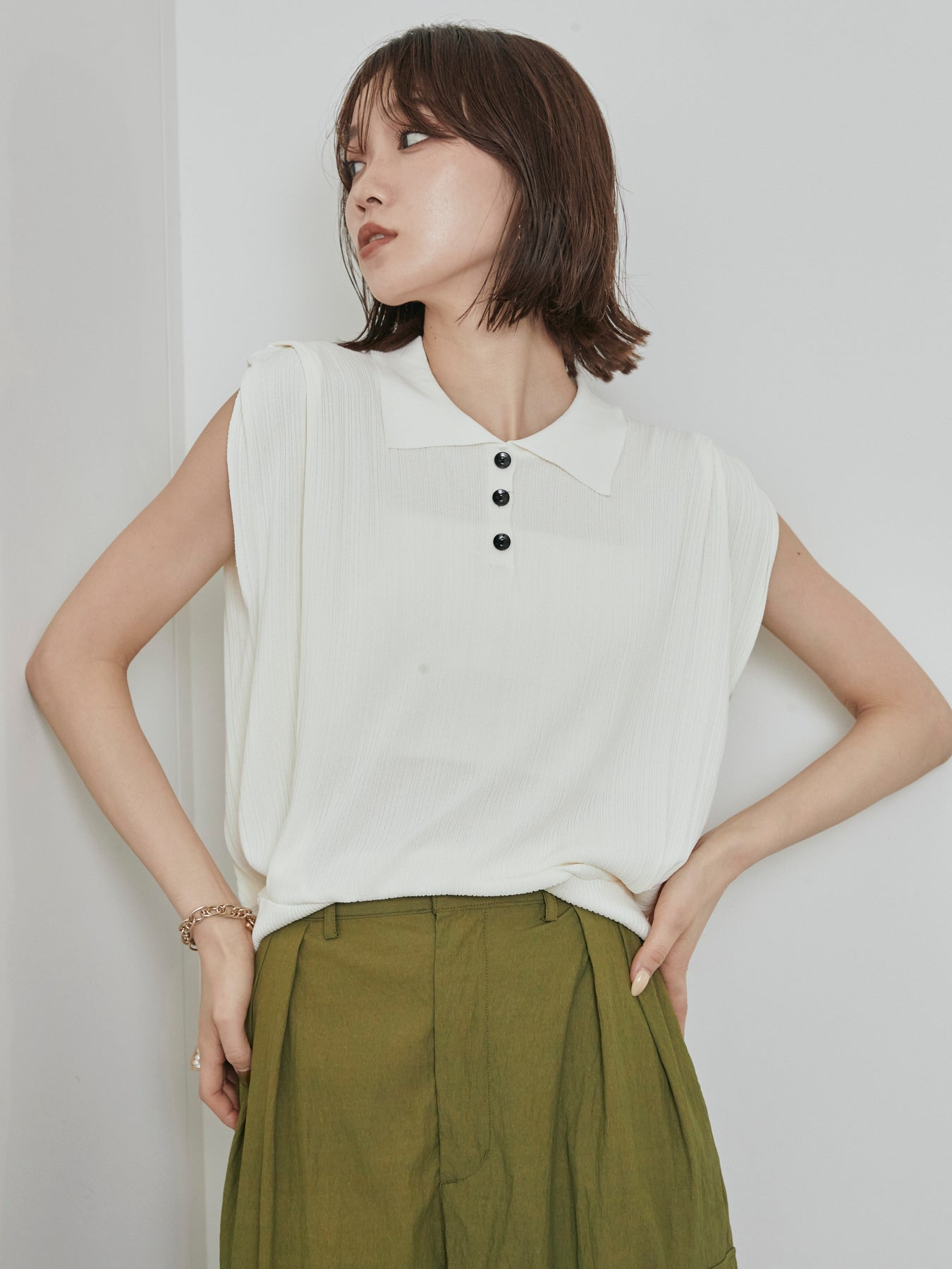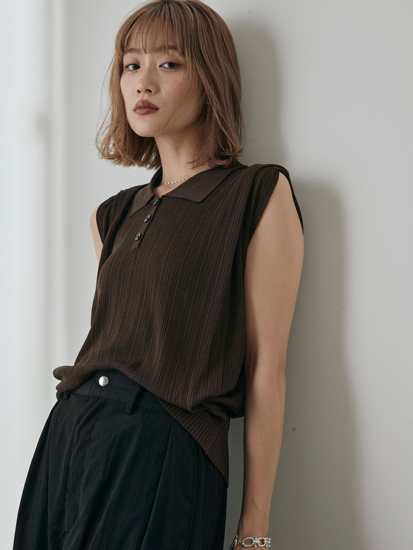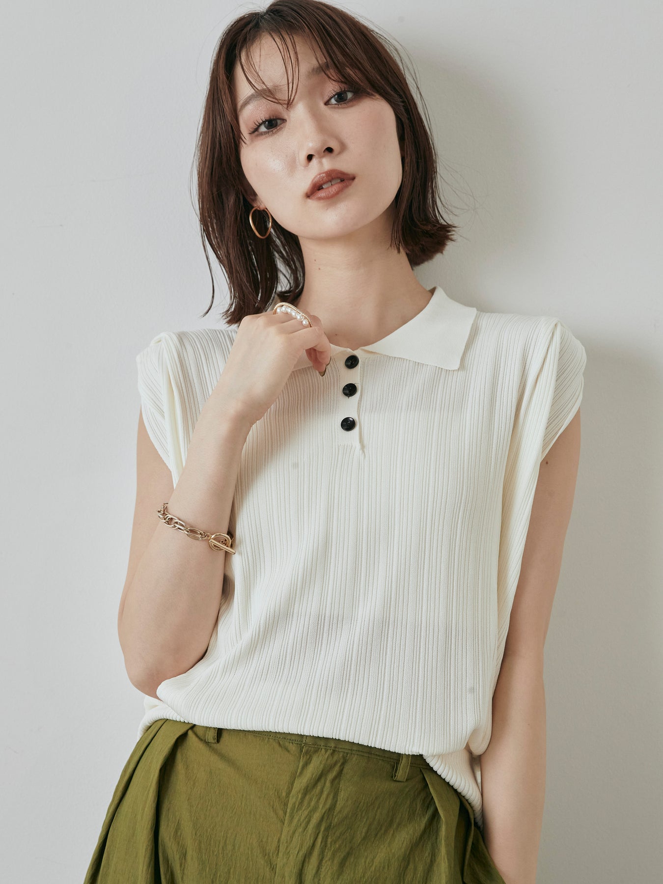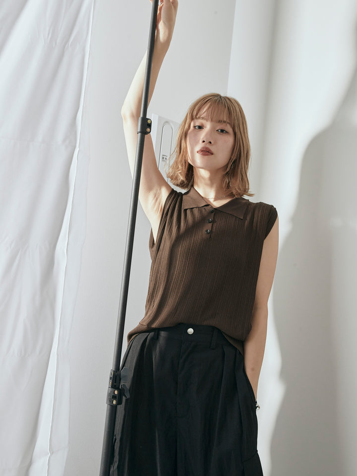 ランダムピッチのリブ編みがさりげなく表情を生み出す、クラシカルな印象のポロニットベスト。 ノースリーブながらも肩にかかるスリーブラインと襟付きデザインで、きちんと感と抜け感を両立した一枚です。 やわらかなニット素材がボディに優しくフィットし、コンパクトすぎない絶妙なシルエットに。 バスト上はほんのり透け感のある編地で、さりげないニュアンスをプラスしています。 パンツにもスカートにも合わせやすく、インでもアウトでも着映えする万能トップス。 ジャケットのインナーとしても活躍し、ロングシーズン使えるベーシックアイテムです。