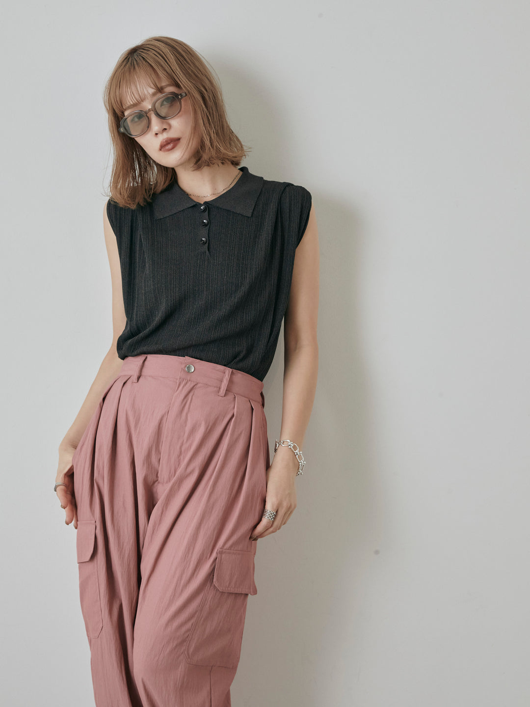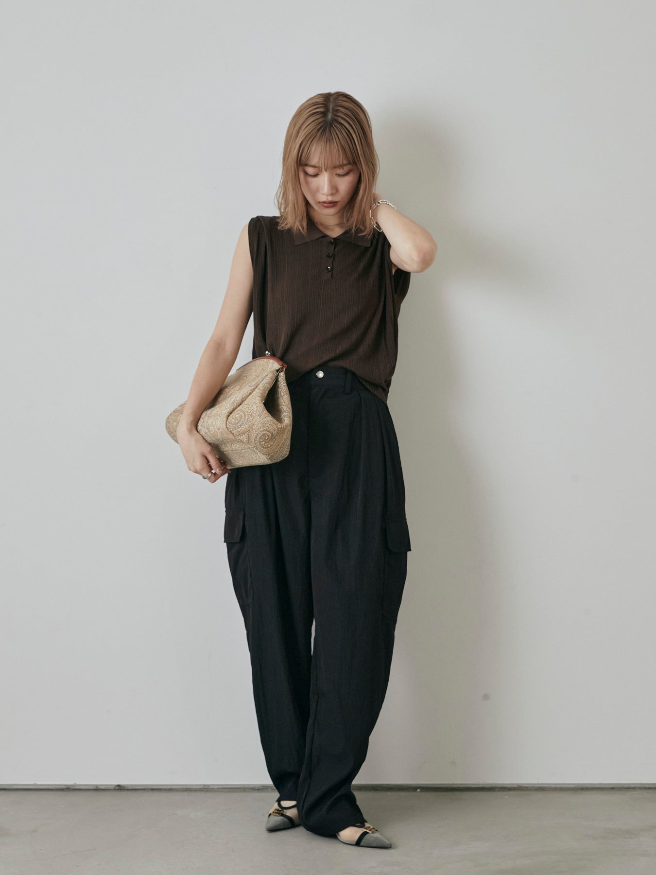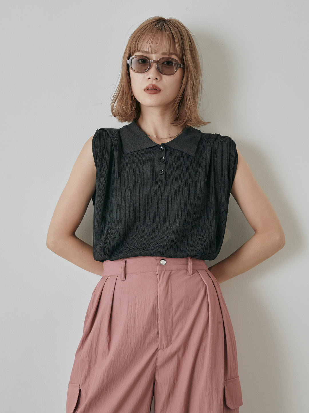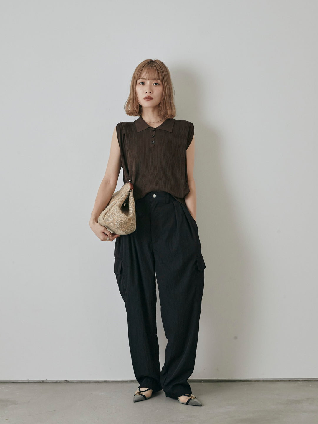 ランダムピッチのリブ編みがさりげなく表情を生み出す、クラシカルな印象のポロニットベスト。 ノースリーブながらも肩にかかるスリーブラインと襟付きデザインで、きちんと感と抜け感を両立した一枚です。 やわらかなニット素材がボディに優しくフィットし、コンパクトすぎない絶妙なシルエットに。 バスト上はほんのり透け感のある編地で、さりげないニュアンスをプラスしています。 パンツにもスカートにも合わせやすく、インでもアウトでも着映えする万能トップス。 ジャケットのインナーとしても活躍し、ロングシーズン使えるベーシックアイテムです。