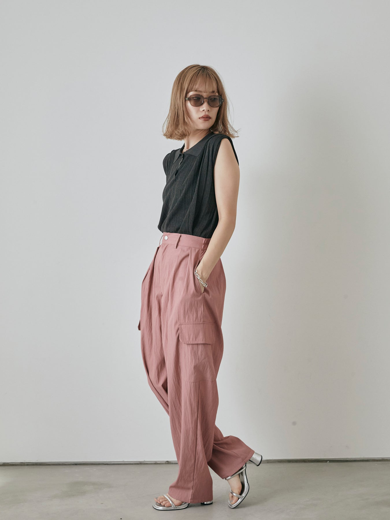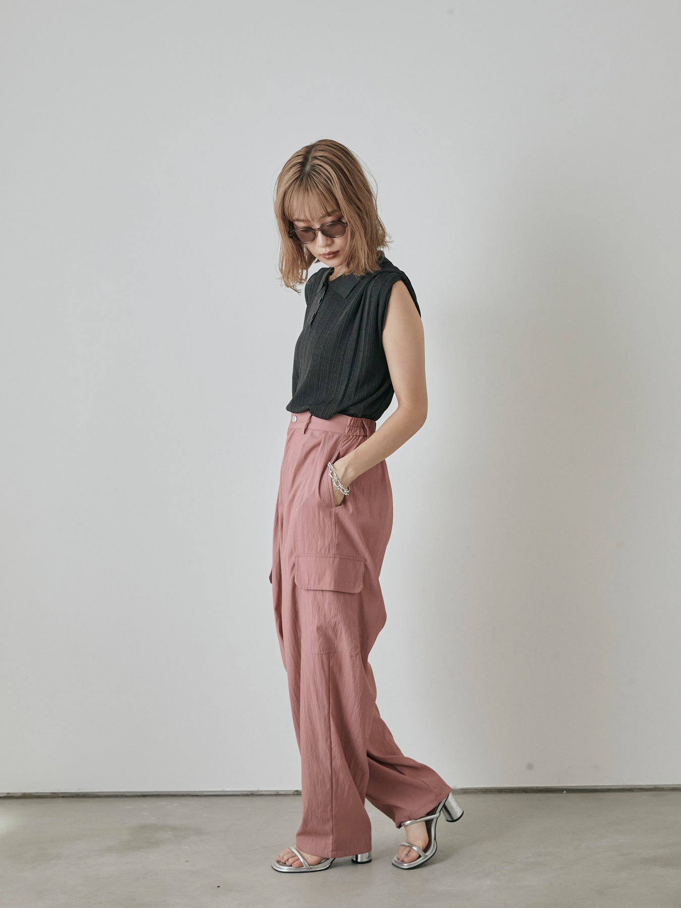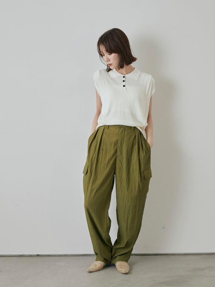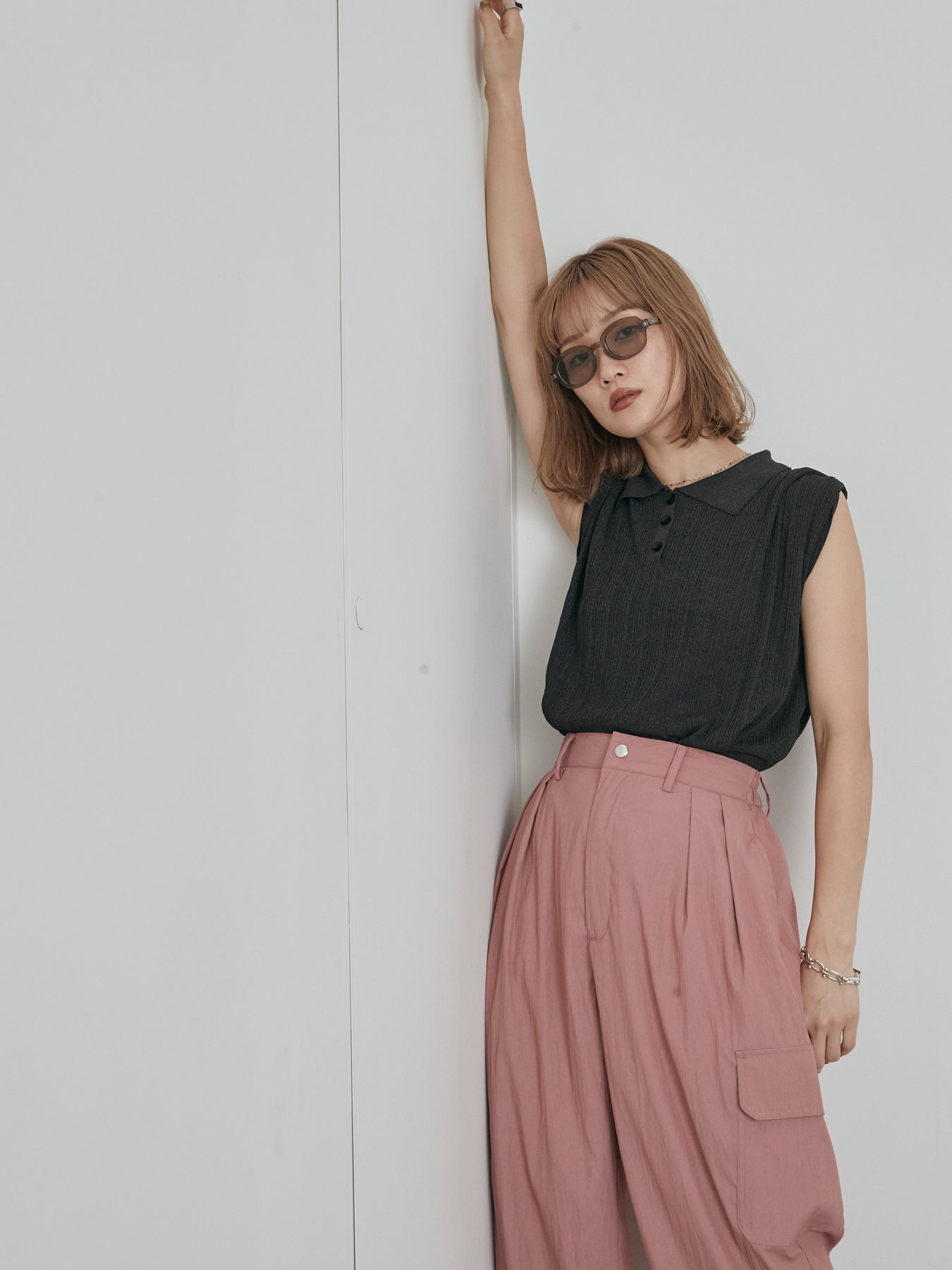 ランダムピッチのリブ編みがさりげなく表情を生み出す、クラシカルな印象のポロニットベスト。 ノースリーブながらも肩にかかるスリーブラインと襟付きデザインで、きちんと感と抜け感を両立した一枚です。 やわらかなニット素材がボディに優しくフィットし、コンパクトすぎない絶妙なシルエットに。 バスト上はほんのり透け感のある編地で、さりげないニュアンスをプラスしています。 パンツにもスカートにも合わせやすく、インでもアウトでも着映えする万能トップス。 ジャケットのインナーとしても活躍し、ロングシーズン使えるベーシックアイテムです。