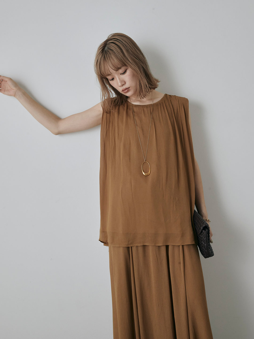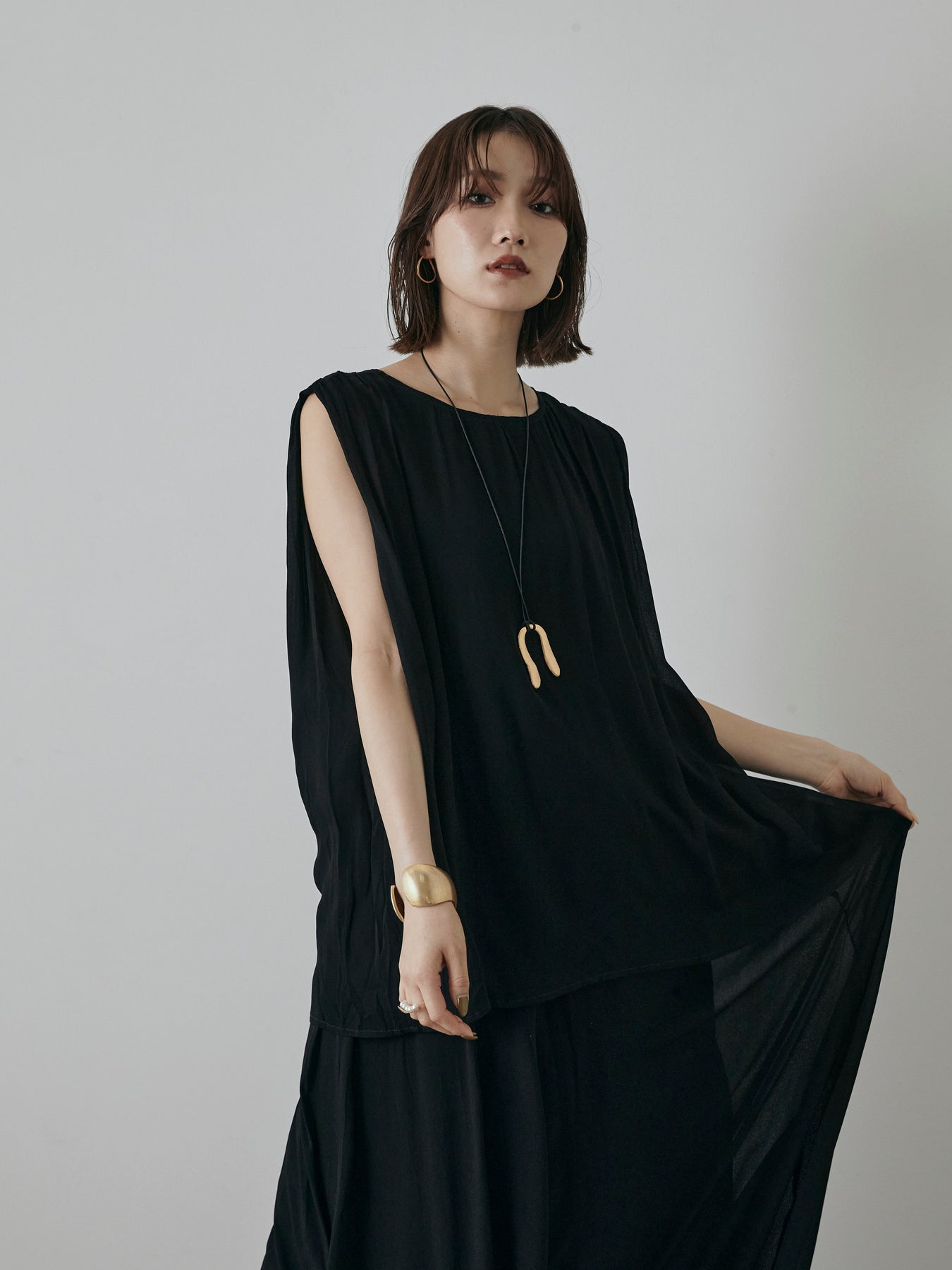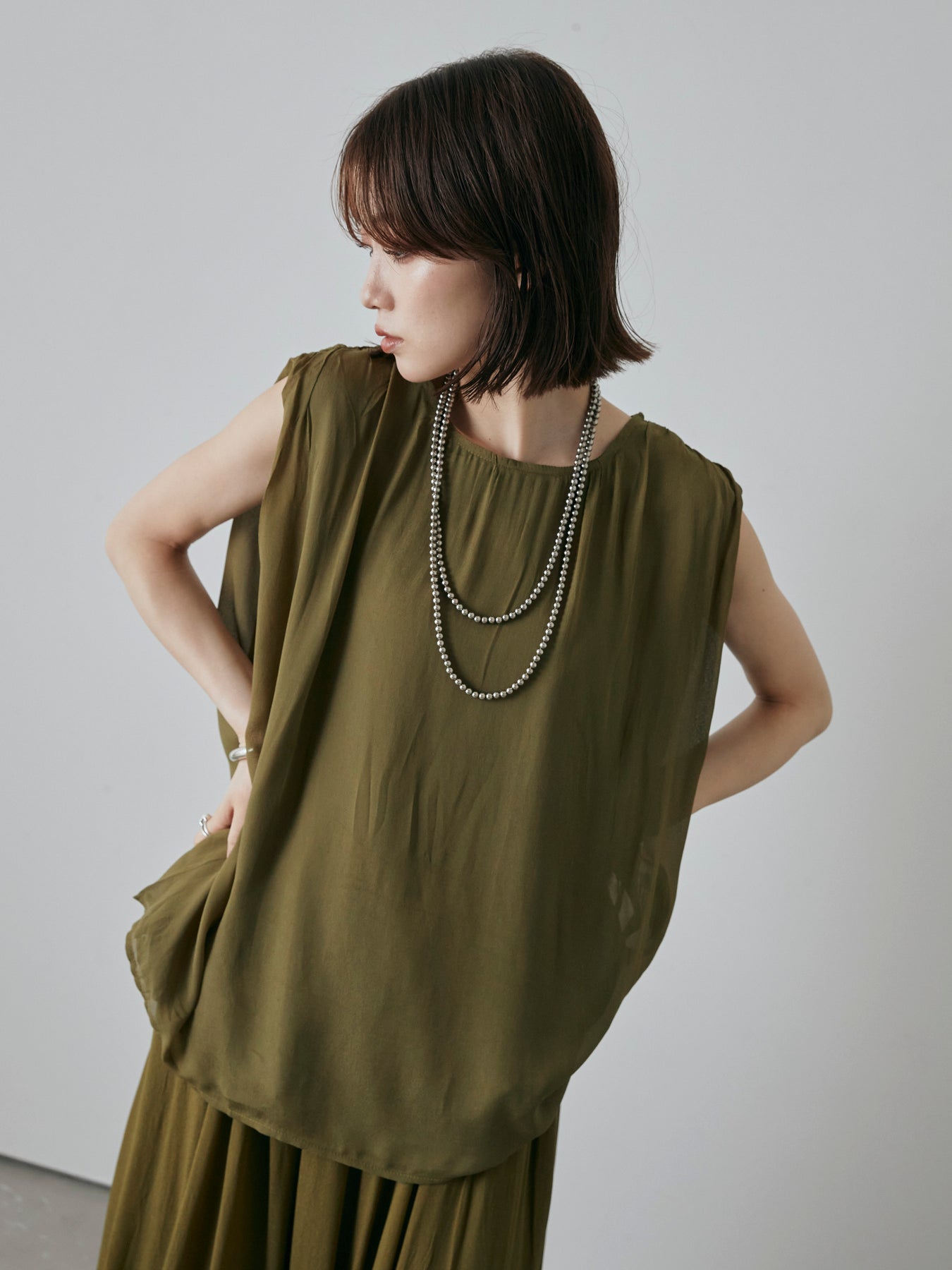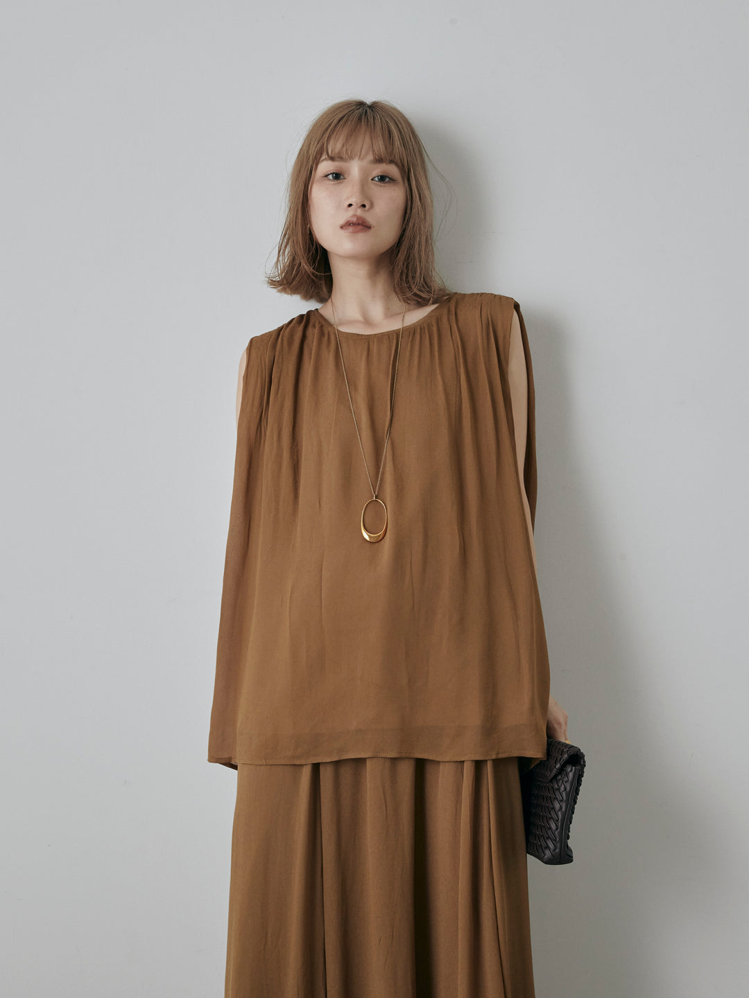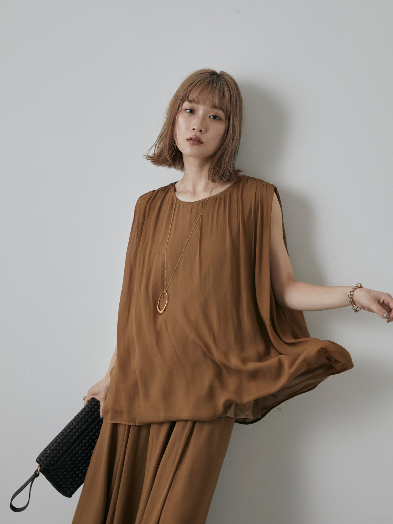 軽やかなシアー素材と肩に施されたタックディテールが魅力の、モード感漂うノースリーブブラウス。 身体のラインをふわりと包むゆとりのあるシルエットで、抜け感のある洗練された印象に仕上がります。 肩のラインに沿うタックが立体感を生み、華奢見えと動きのあるシルエットを演出。 ほんのり透け感のある素材が夏らしい抜け感をプラスし、涼しげで軽やかな印象に。 同素材のボトムとセットアップで着用すれば、旬のワントーンスタイルが完成。 デニムやスラックスと合わせた単品使いでも、コーディネートを格上げしてくれる1枚です。