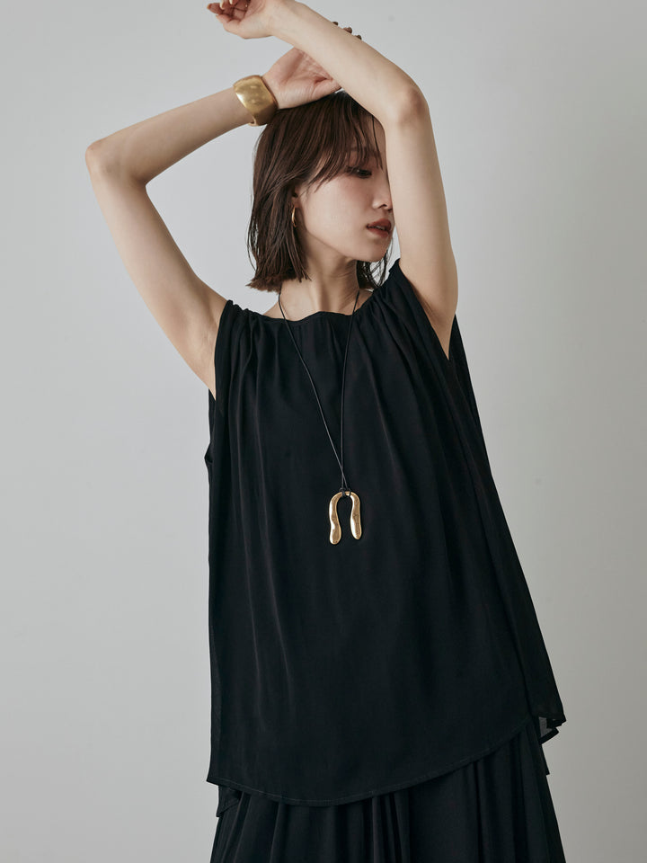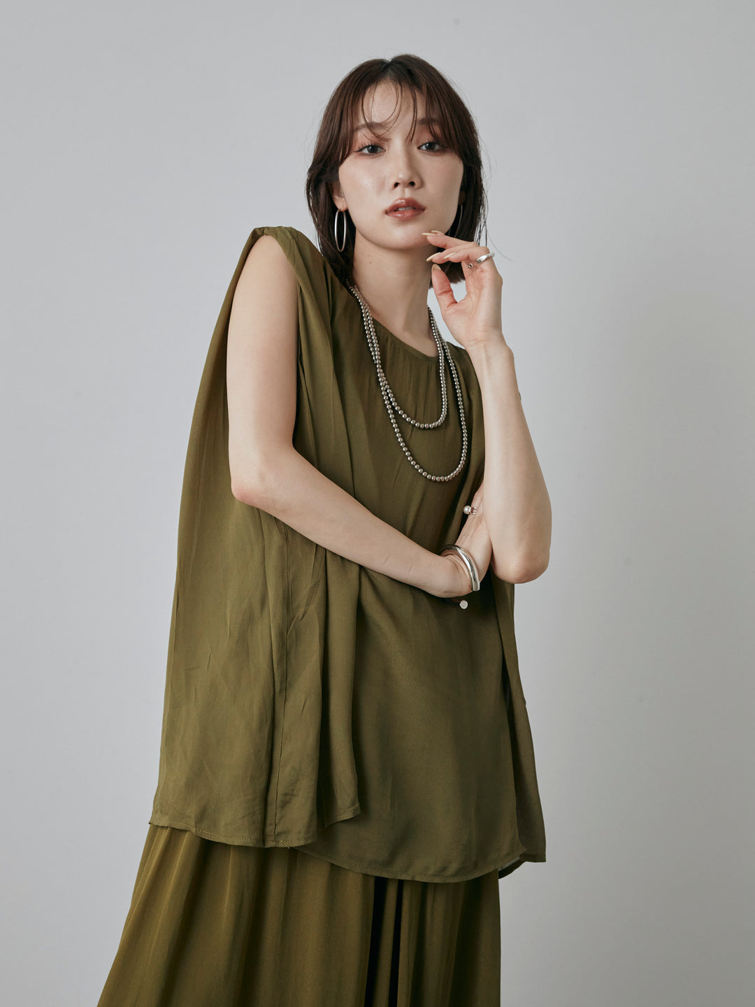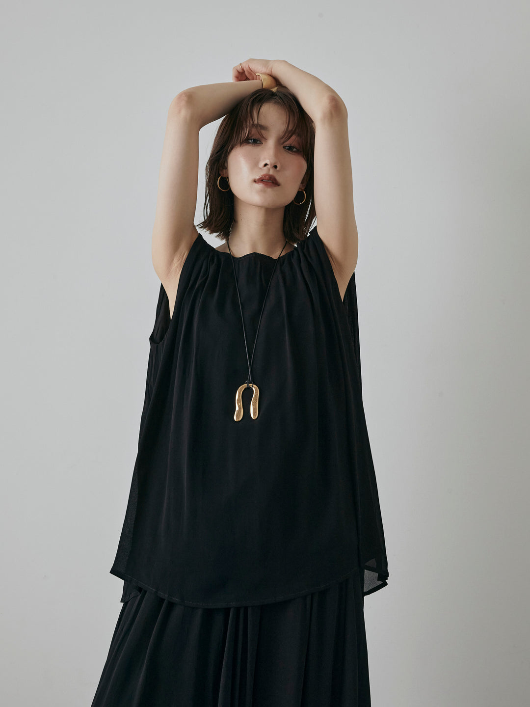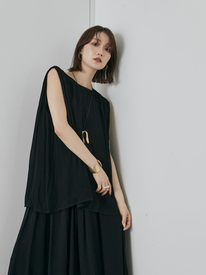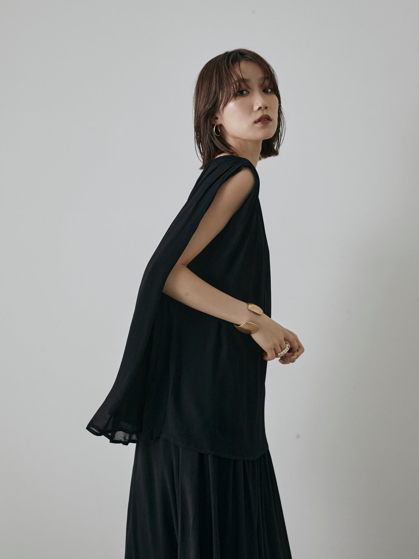 軽やかなシアー素材と肩に施されたタックディテールが魅力の、モード感漂うノースリーブブラウス。 身体のラインをふわりと包むゆとりのあるシルエットで、抜け感のある洗練された印象に仕上がります。 肩のラインに沿うタックが立体感を生み、華奢見えと動きのあるシルエットを演出。 ほんのり透け感のある素材が夏らしい抜け感をプラスし、涼しげで軽やかな印象に。 同素材のボトムとセットアップで着用すれば、旬のワントーンスタイルが完成。 デニムやスラックスと合わせた単品使いでも、コーディネートを格上げしてくれる1枚です。