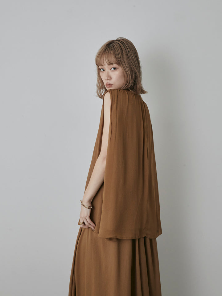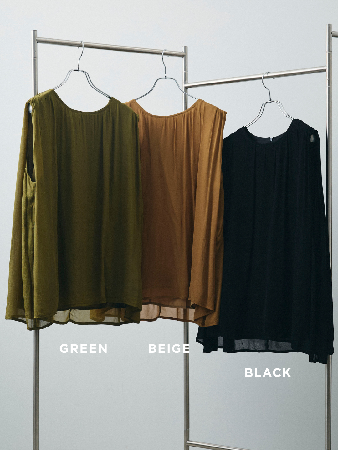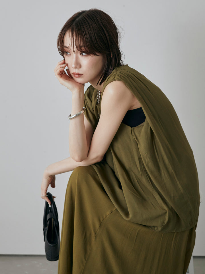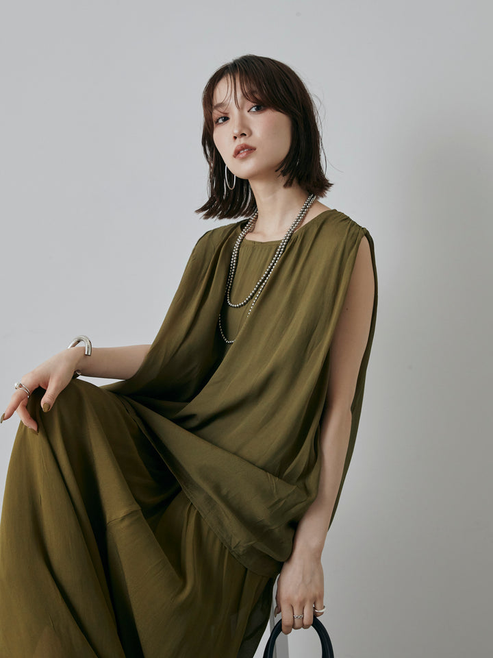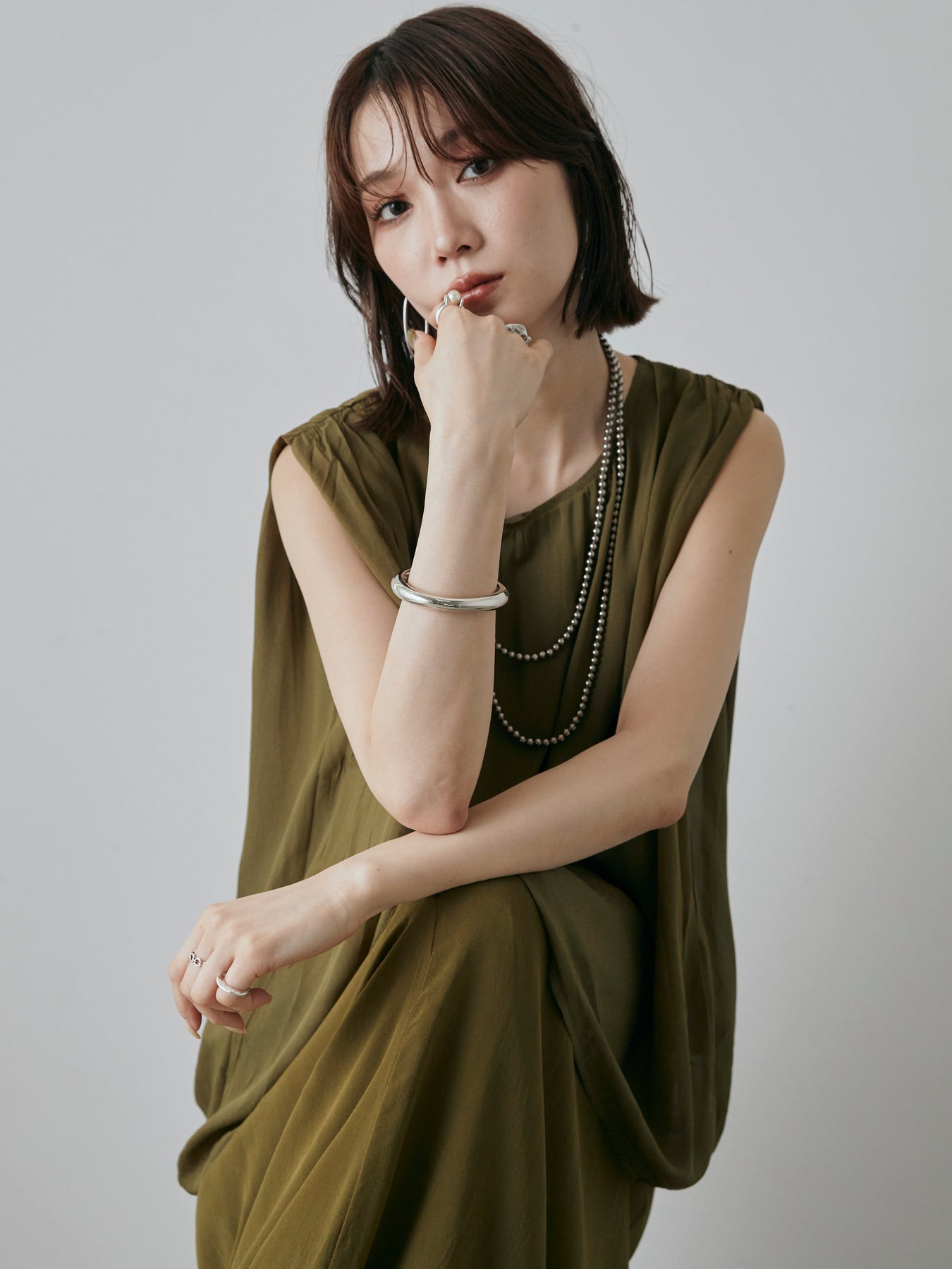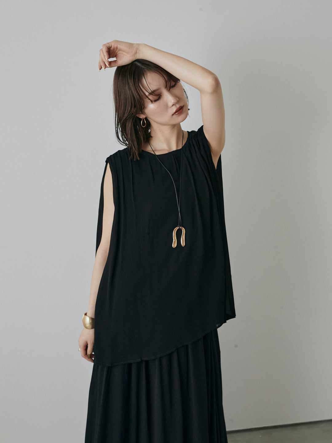 軽やかなシアー素材と肩に施されたタックディテールが魅力の、モード感漂うノースリーブブラウス。 身体のラインをふわりと包むゆとりのあるシルエットで、抜け感のある洗練された印象に仕上がります。 肩のラインに沿うタックが立体感を生み、華奢見えと動きのあるシルエットを演出。 ほんのり透け感のある素材が夏らしい抜け感をプラスし、涼しげで軽やかな印象に。 同素材のボトムとセットアップで着用すれば、旬のワントーンスタイルが完成。 デニムやスラックスと合わせた単品使いでも、コーディネートを格上げしてくれる1枚です。