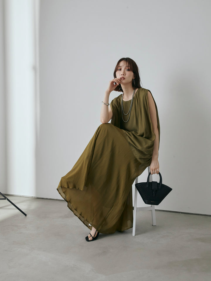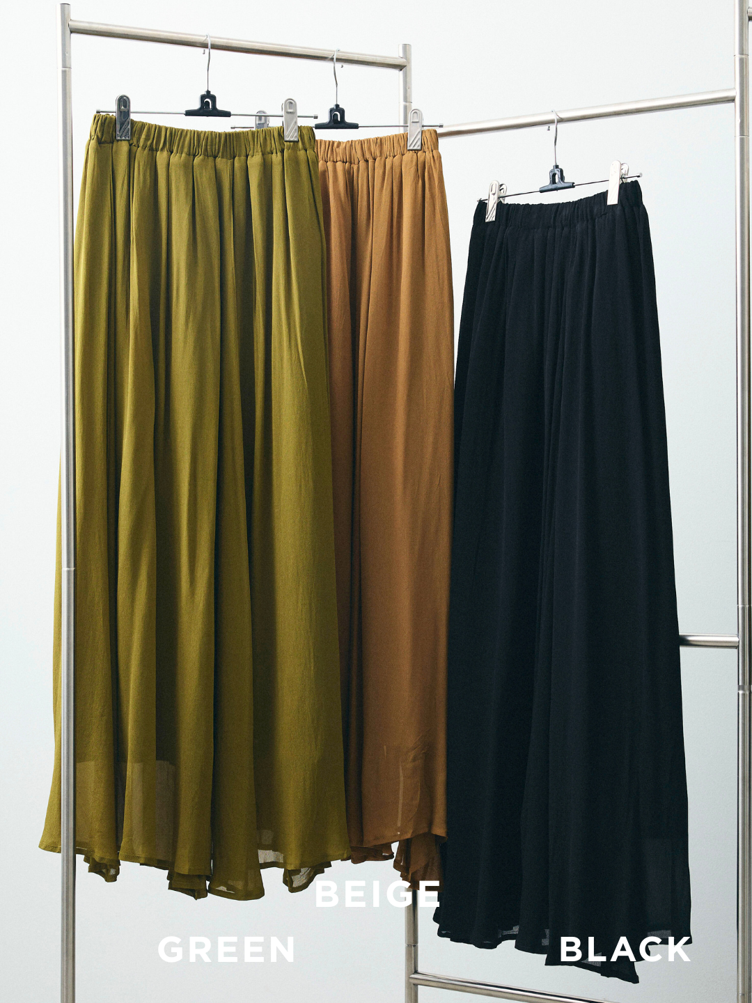 歩くたびにふわりと揺れる、軽やかなシアー素材が魅力のフレアマキシスカート。 ほどよい透け感と落ち感のあるシルエットが、大人の抜け感と上品さを同時に演出してくれる一枚です。 ウエストは総ゴム仕様でリラクシーな履き心地ながら、たっぷりとしたフレアシルエットが縦ラインを強調しスタイルアップも◎。 裏地付きで透けすぎず、安心して着用できるのも嬉しいポイントです。 同素材のブラウスとセットアップで着用すれば、洗練されたワントーンコーデが完成。 Tシャツやタンクトップと合わせてカジュアルに着崩すのもおすすめです。