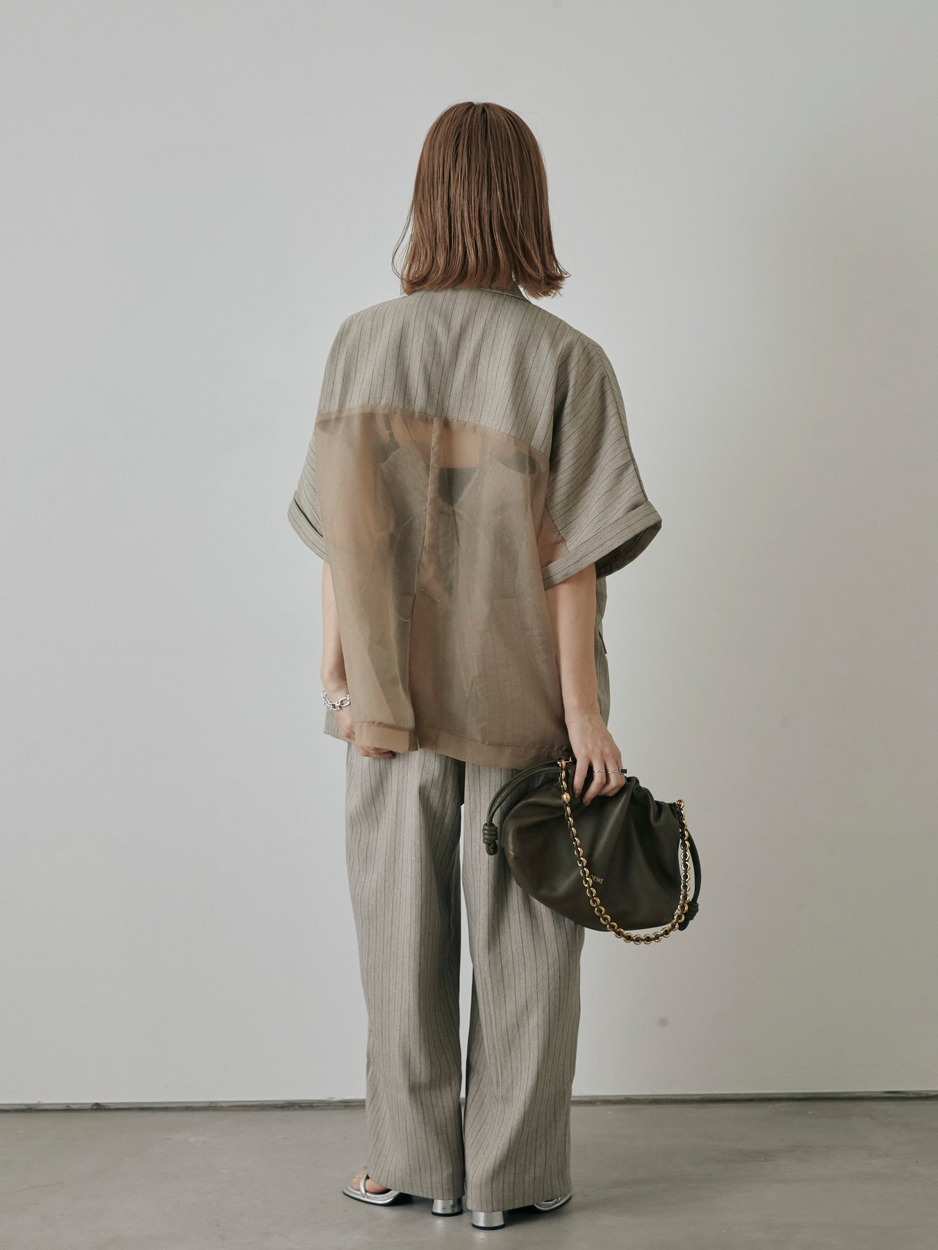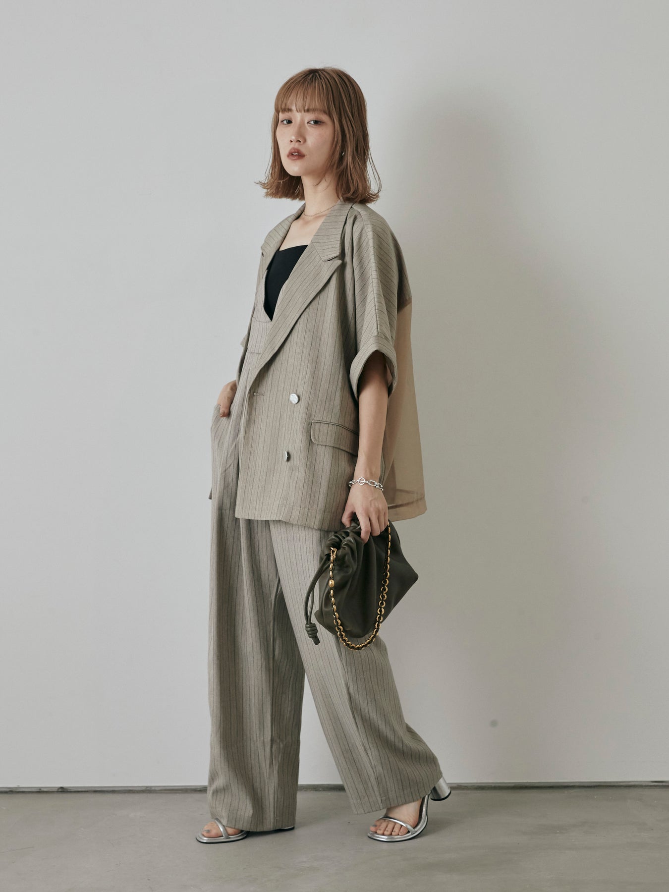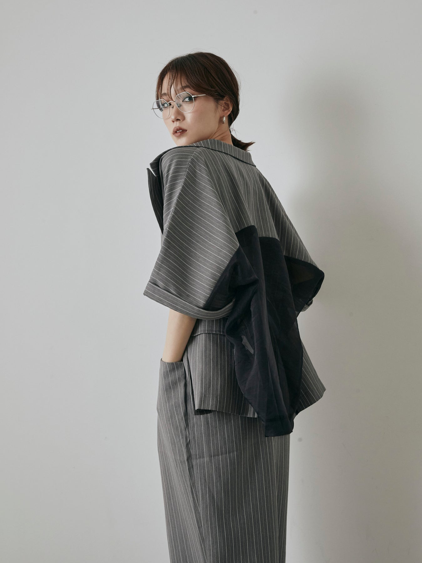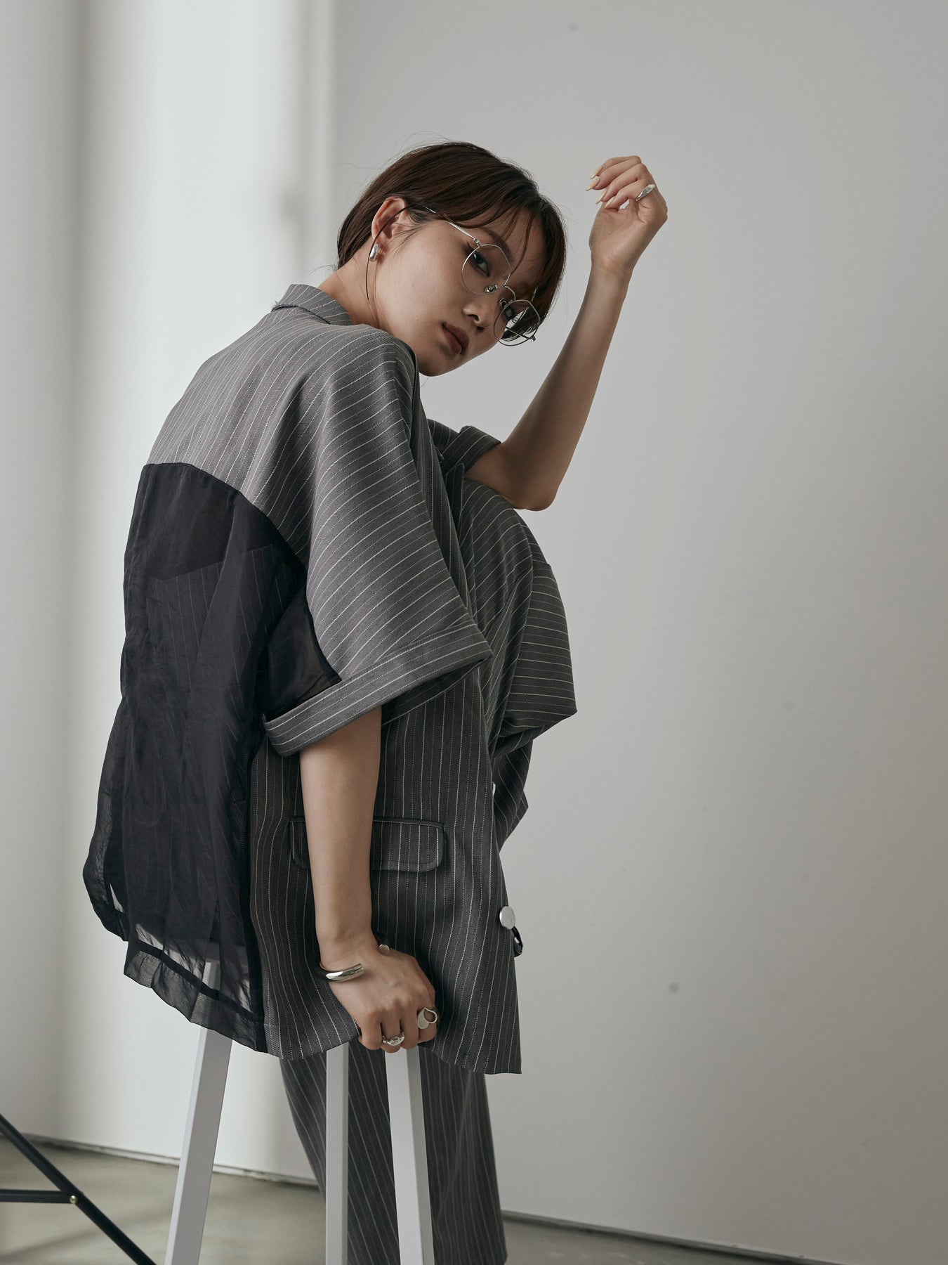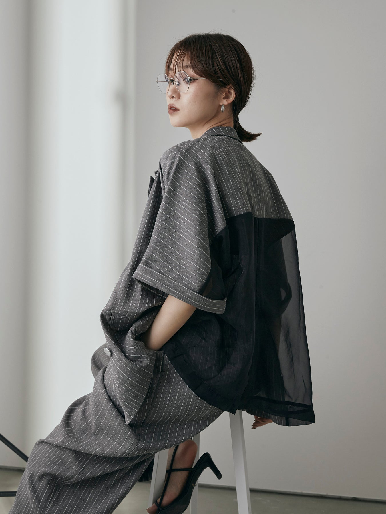 クラシカルなヘリンボーンストライプに、バックスタイルで魅せるオーガンジー切り替えを施した、モード感あふれるハーフジャケット。 マニッシュな印象のテーラードデザインに、透け感のあるディテールをプラスすることで、洗練された抜け感を演出します。 ドロップショルダーとワイドなシルエットがこなれた雰囲気を生み出し、インナーを選ばず羽織るだけでサマになるデザイン。 ややハリ感のある素材とストライプの縦ラインが、自然なスタイルアップを叶えてくれます。 同素材のサロペットやパンツとセットアップでの着用はもちろん、カジュアルなデニムやTシャツと合わせてミックススタイルも楽しめる万能ジャケットです。