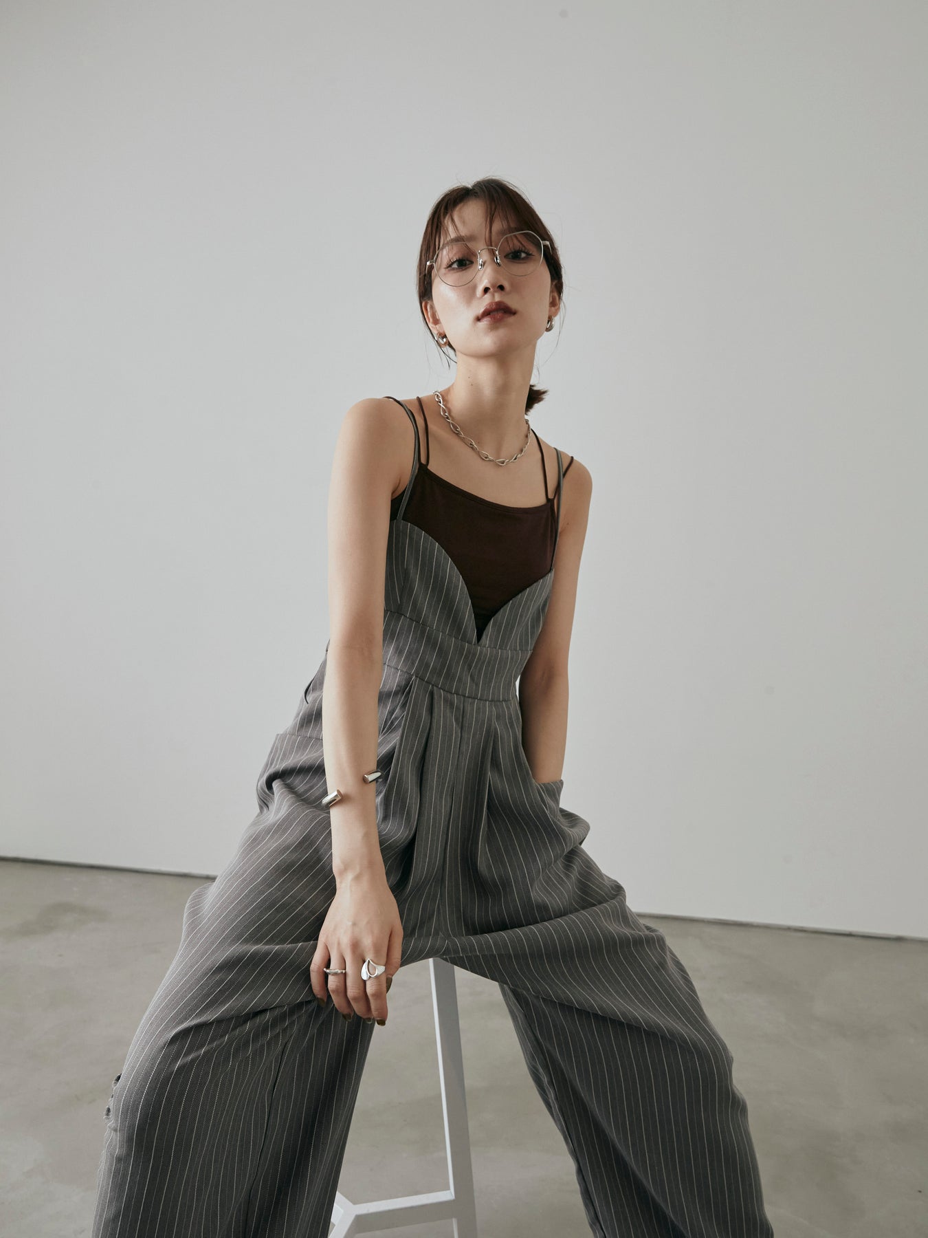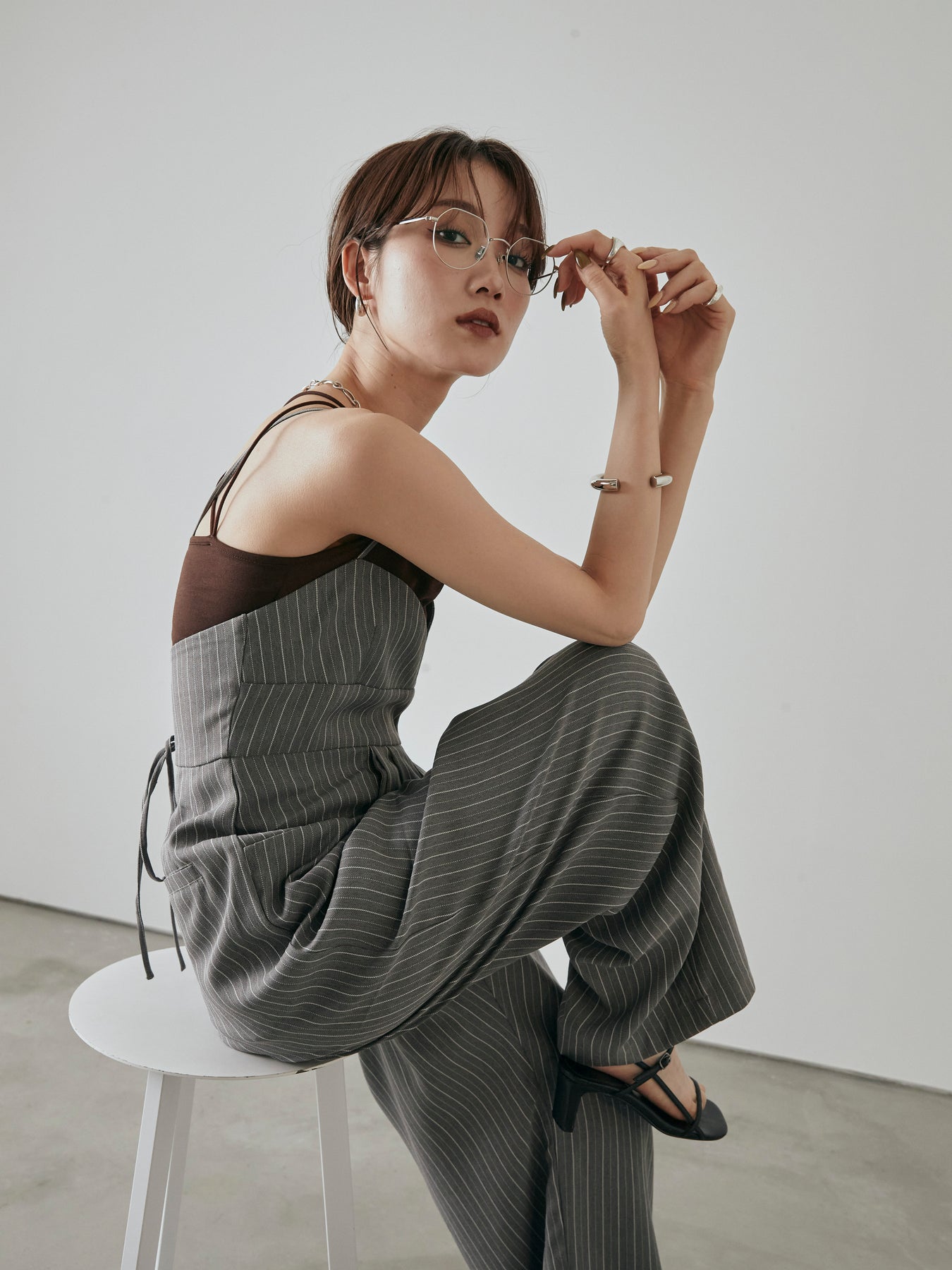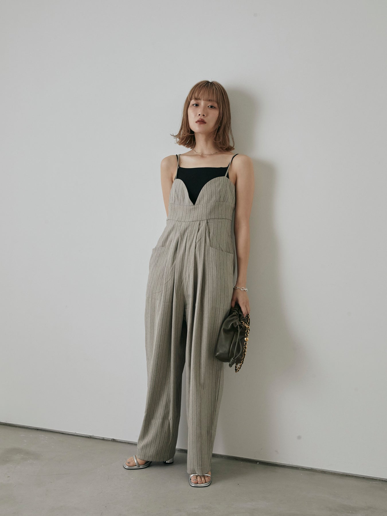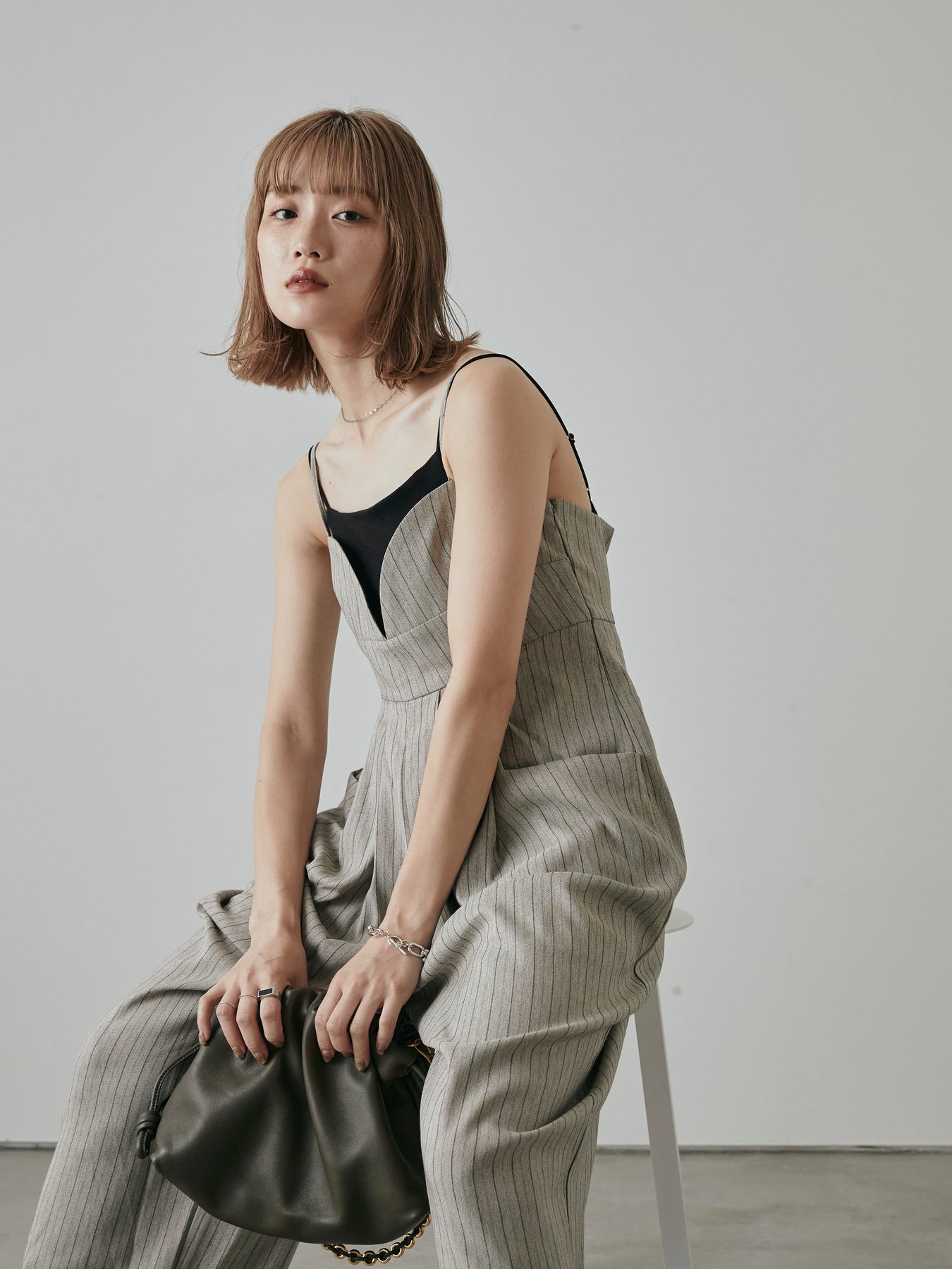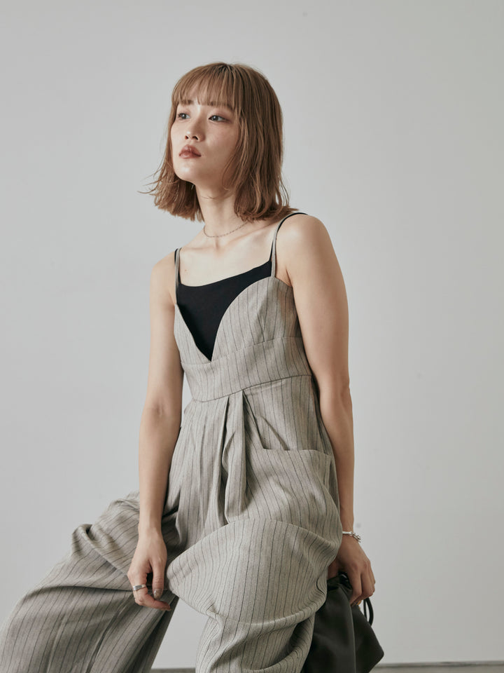 繊細なピンストライプとヘリンボーン織りが上品な印象を与える、大人のためのサロペット。 スクエアネックと深めのVライン切替が、すっきりと洗練されたスタイルを演出します。 ストンと落ちるワイドストレートシルエットで、体のラインを拾わず、リラクシーな着心地をキープ。 バックはゴム仕様でフィット感もあり、ストレスフリーに着用できます。 Tシャツやタンクとのカジュアル合わせはもちろん、シャツやジャケットを羽織ればオケージョンにも対応。 同素材のジャケットとセットアップで着用すれば、ハンサムモードなスタイルが完成します。