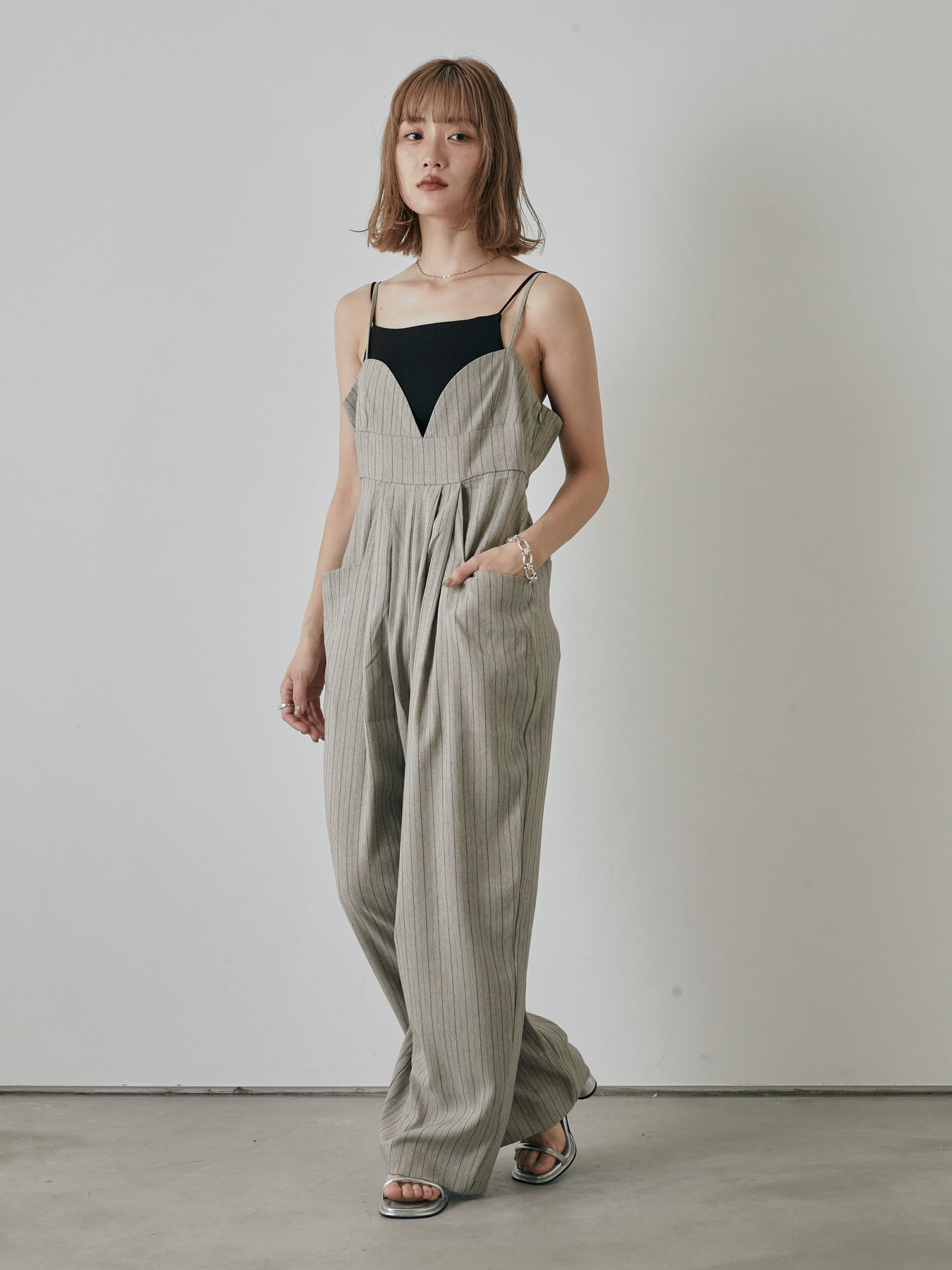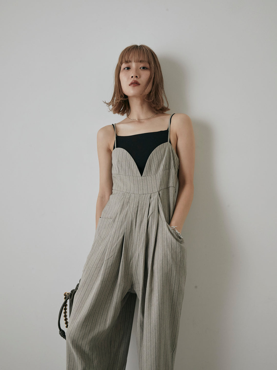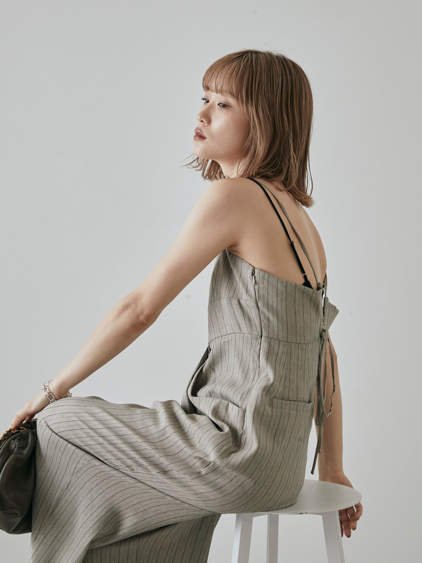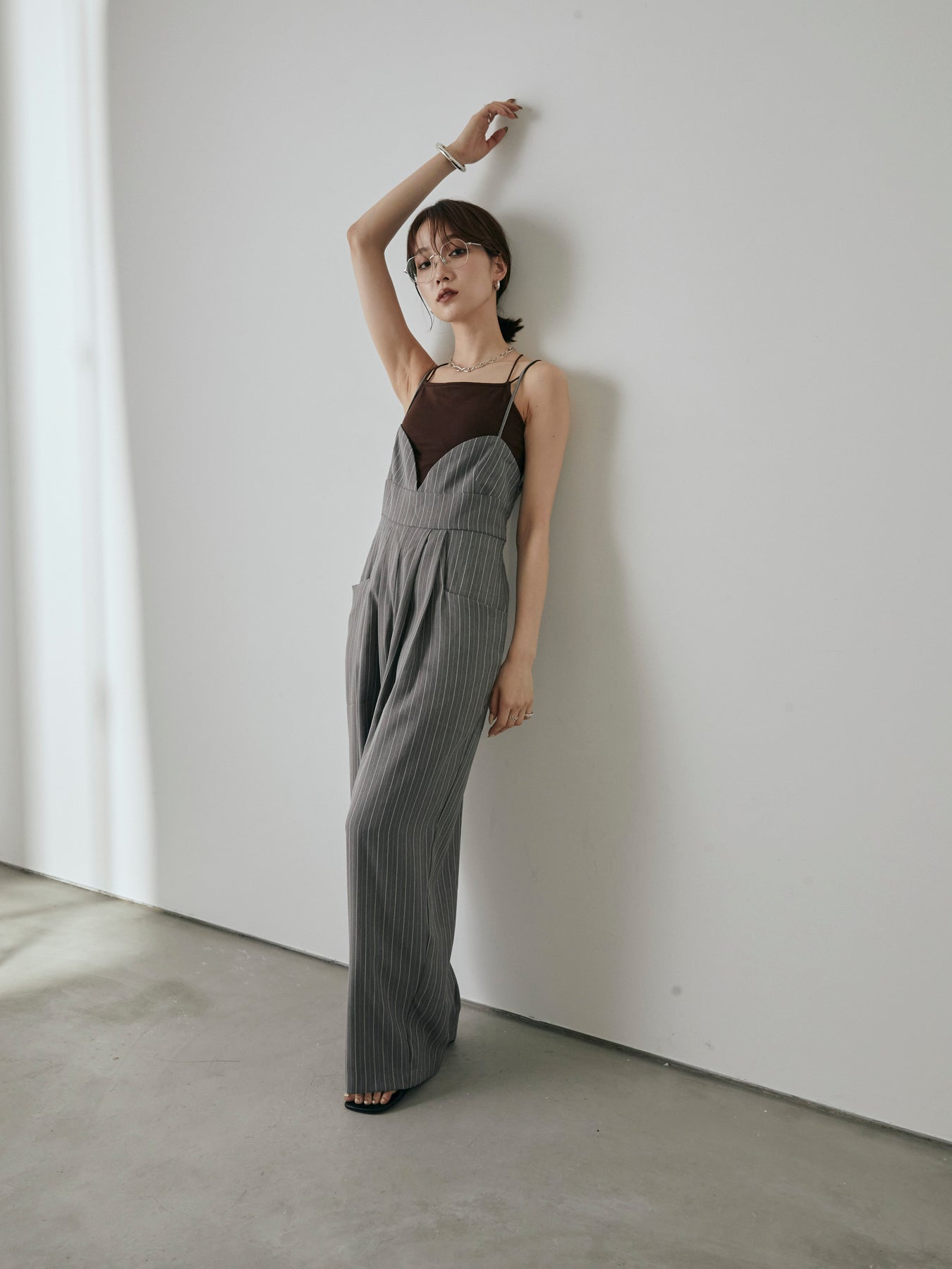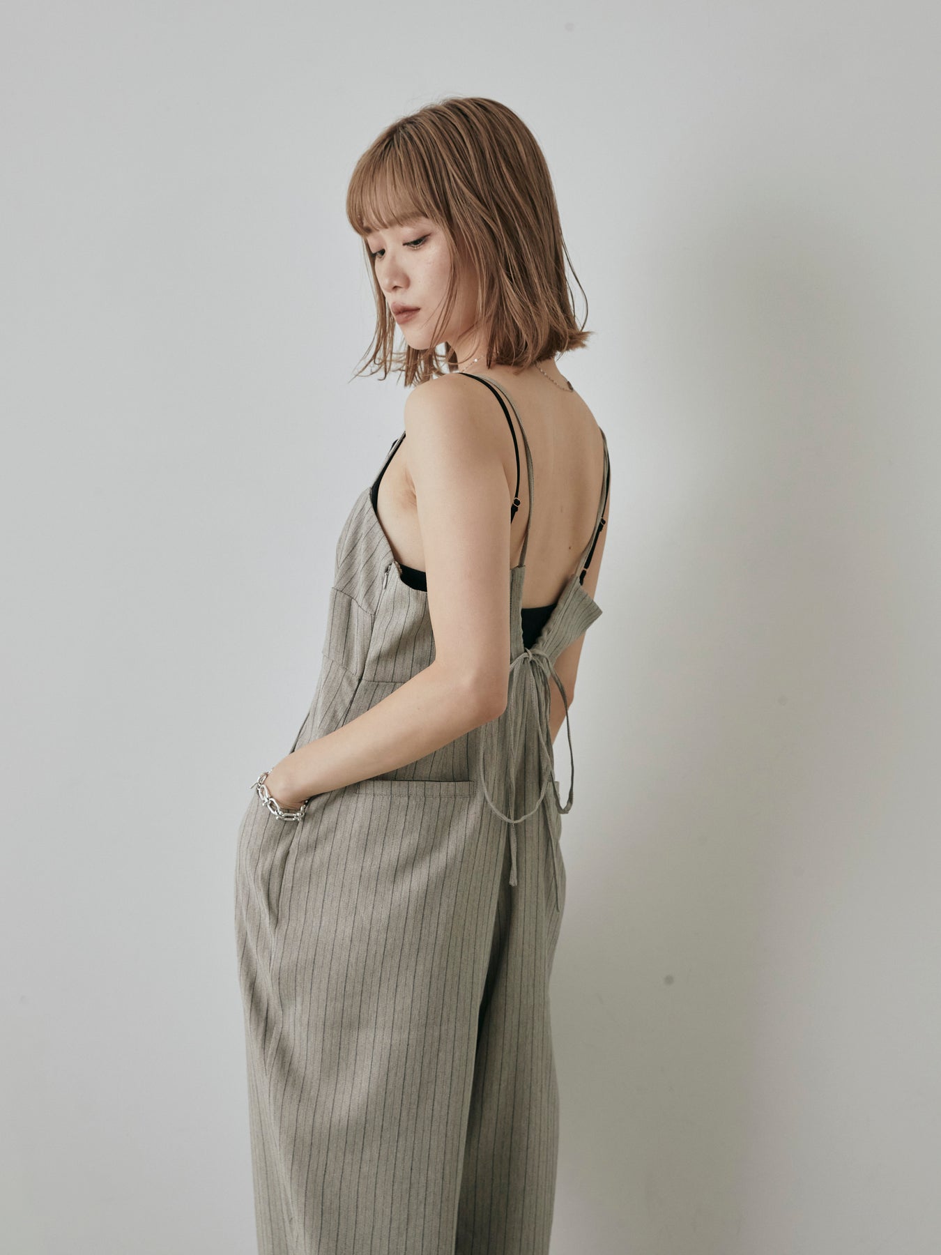 繊細なピンストライプとヘリンボーン織りが上品な印象を与える、大人のためのサロペット。 スクエアネックと深めのVライン切替が、すっきりと洗練されたスタイルを演出します。 ストンと落ちるワイドストレートシルエットで、体のラインを拾わず、リラクシーな着心地をキープ。 バックはゴム仕様でフィット感もあり、ストレスフリーに着用できます。 Tシャツやタンクとのカジュアル合わせはもちろん、シャツやジャケットを羽織ればオケージョンにも対応。 同素材のジャケットとセットアップで着用すれば、ハンサムモードなスタイルが完成します。