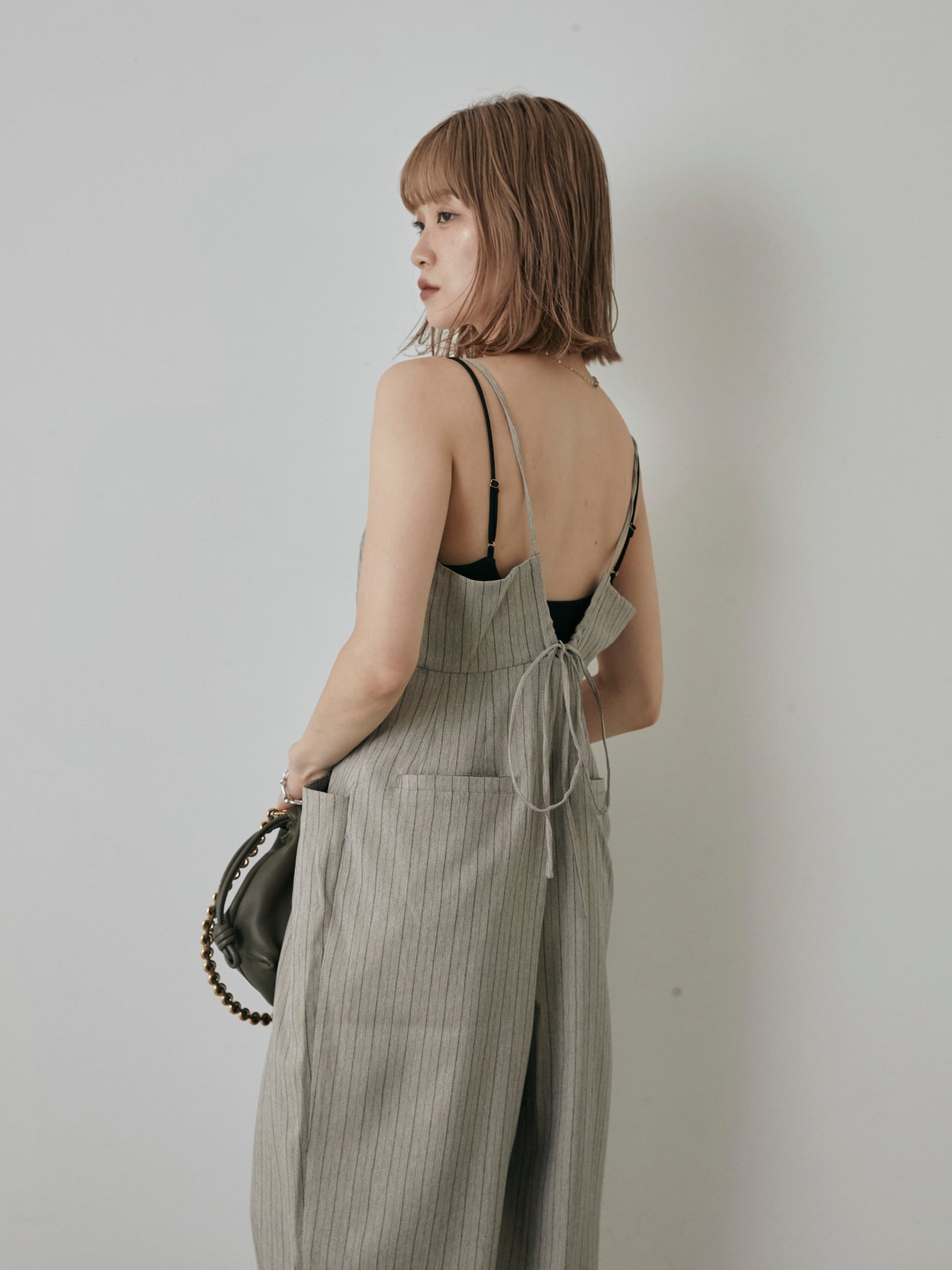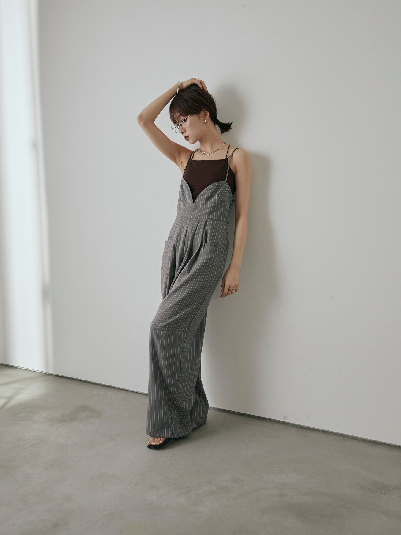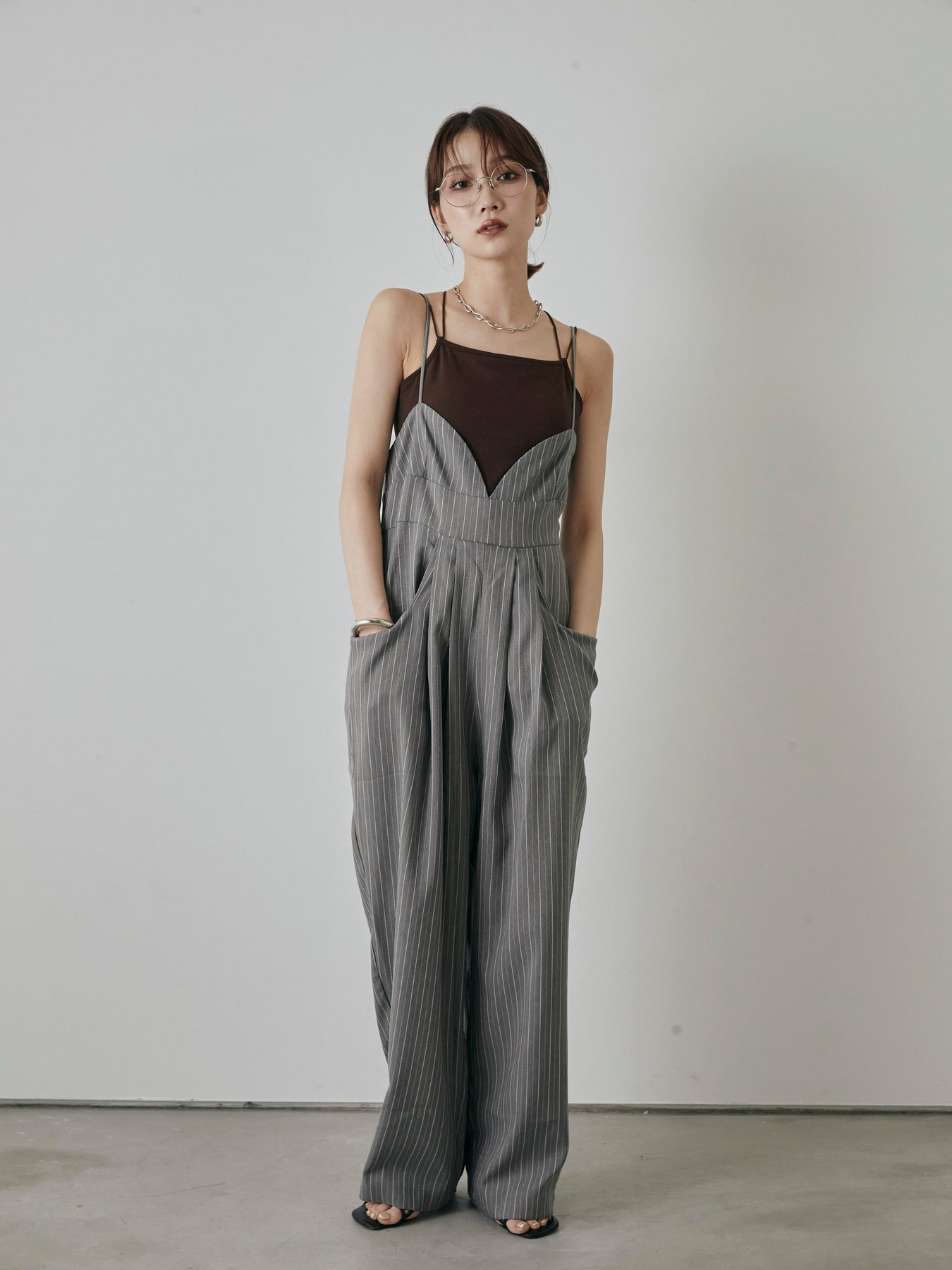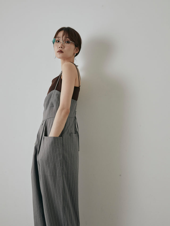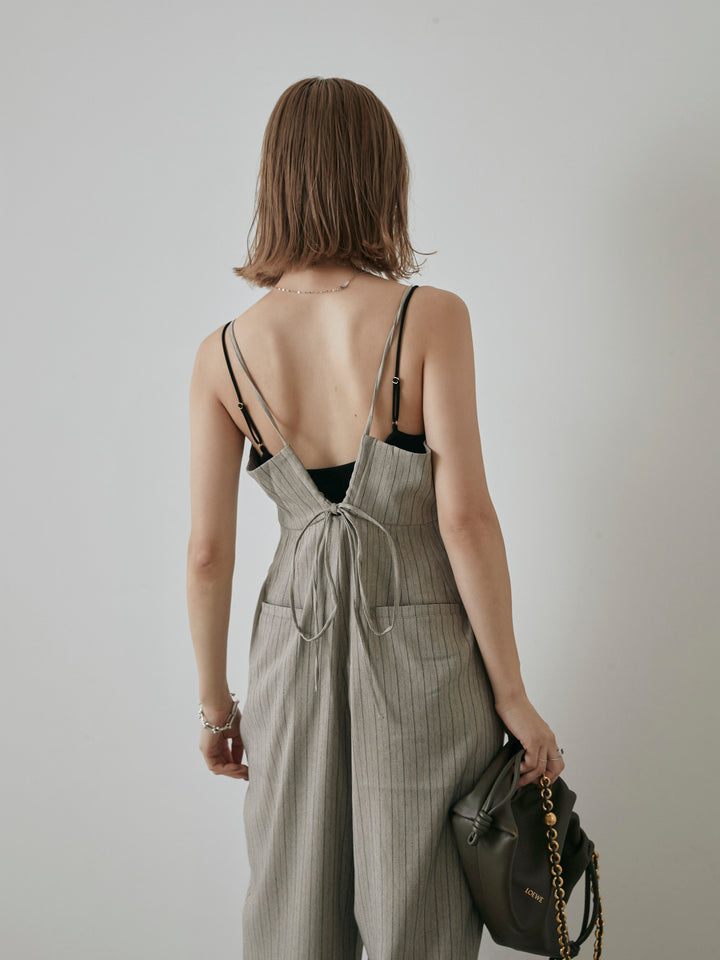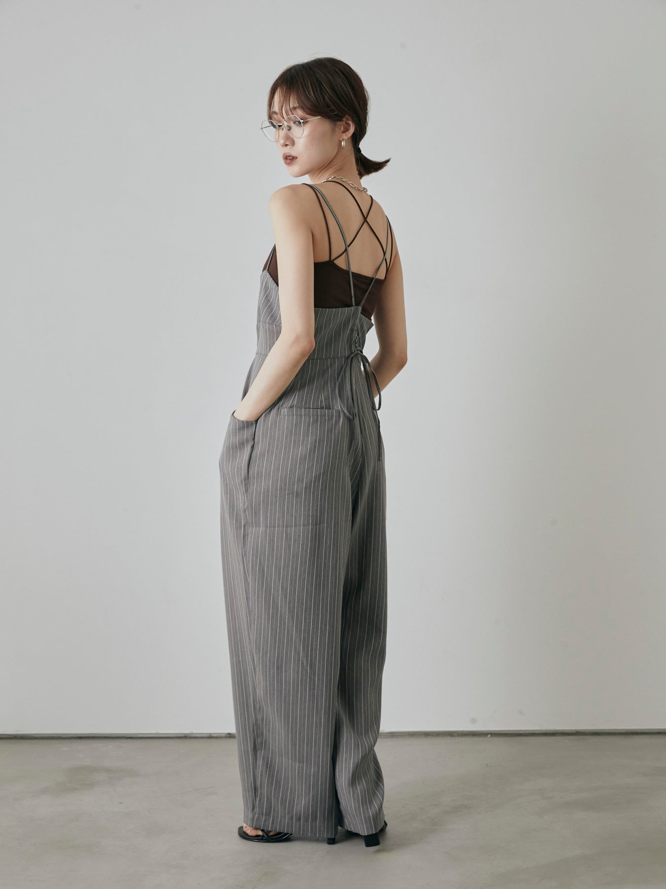 繊細なピンストライプとヘリンボーン織りが上品な印象を与える、大人のためのサロペット。 スクエアネックと深めのVライン切替が、すっきりと洗練されたスタイルを演出します。 ストンと落ちるワイドストレートシルエットで、体のラインを拾わず、リラクシーな着心地をキープ。 バックはゴム仕様でフィット感もあり、ストレスフリーに着用できます。 Tシャツやタンクとのカジュアル合わせはもちろん、シャツやジャケットを羽織ればオケージョンにも対応。 同素材のジャケットとセットアップで着用すれば、ハンサムモードなスタイルが完成します。