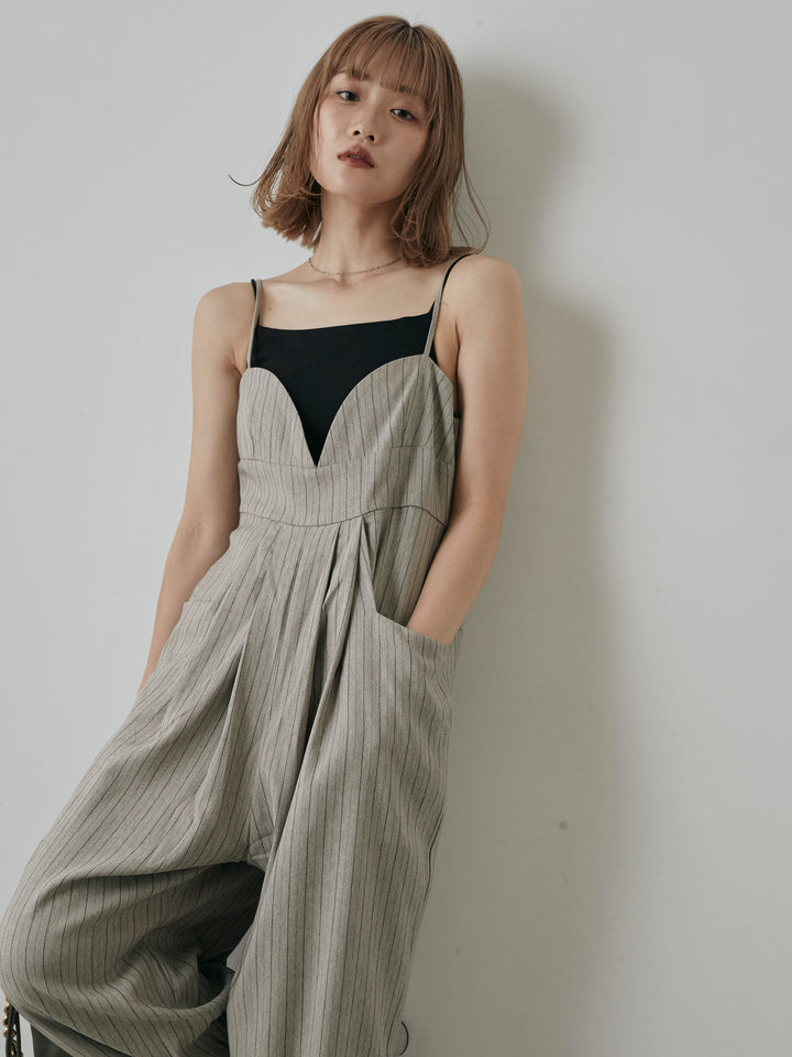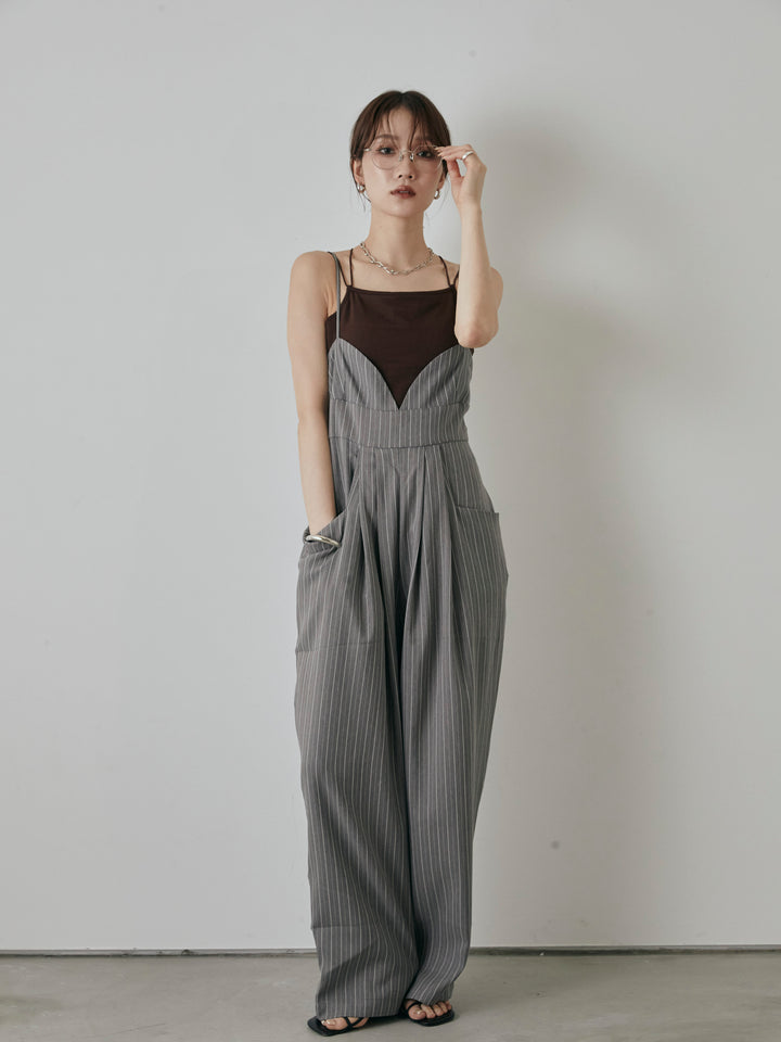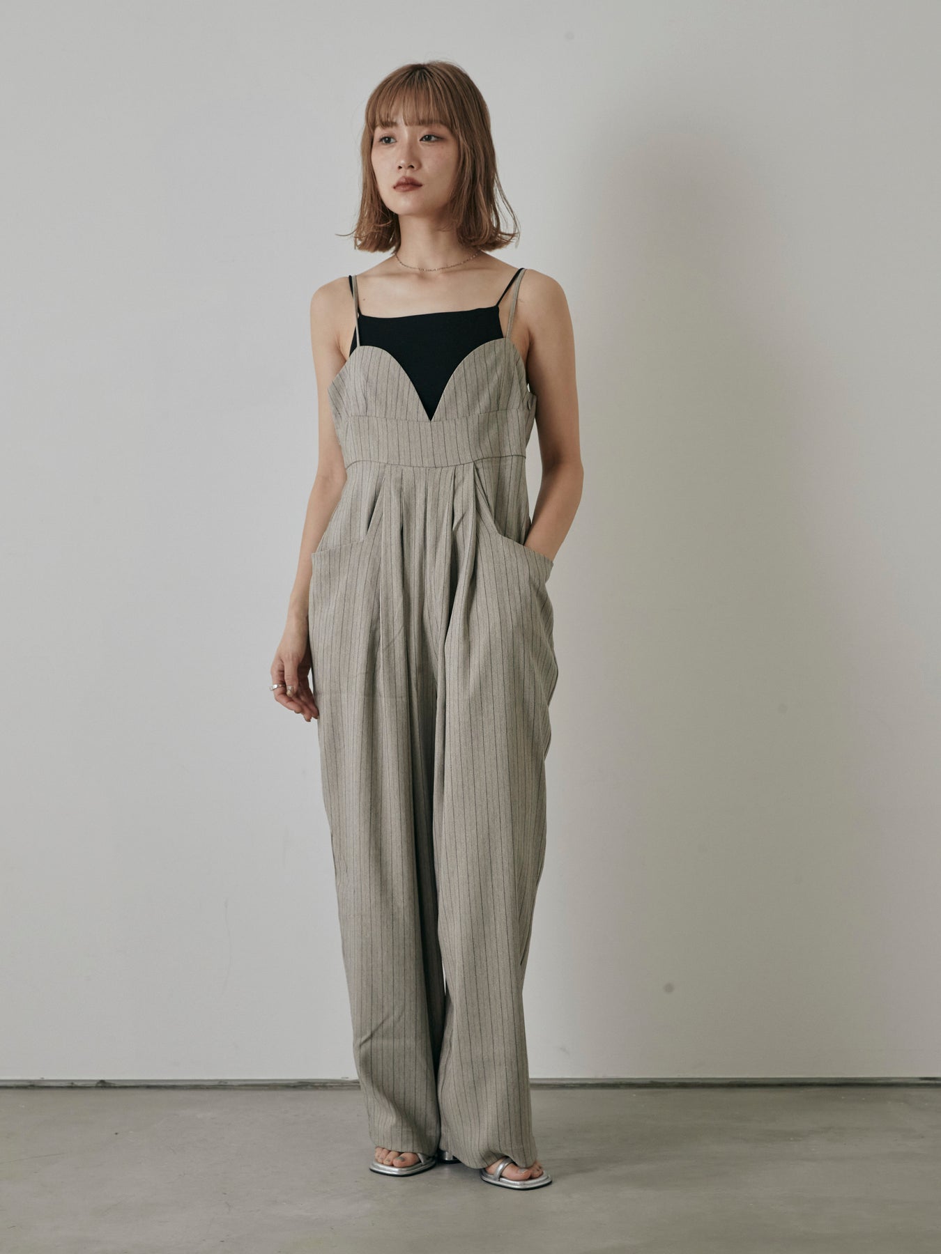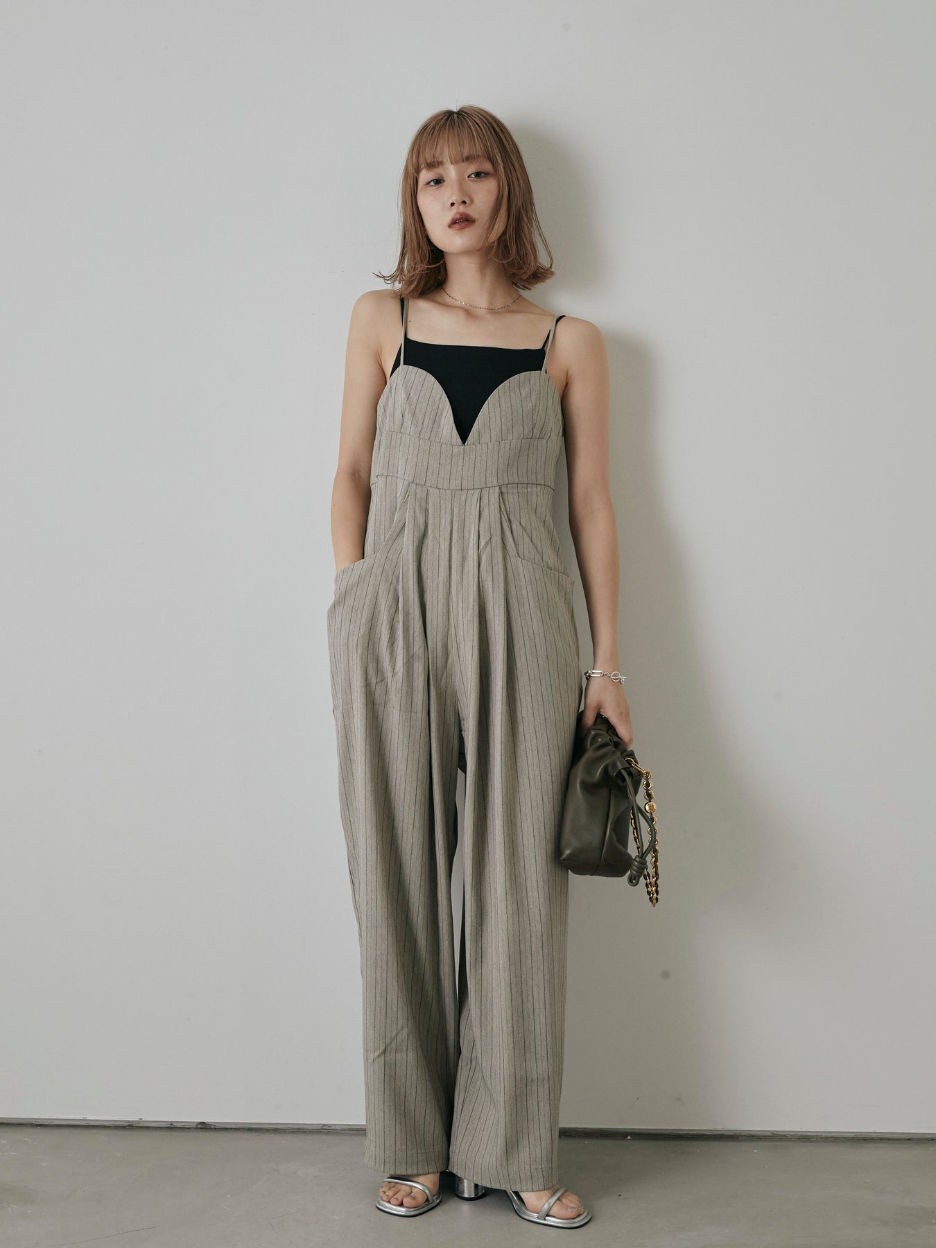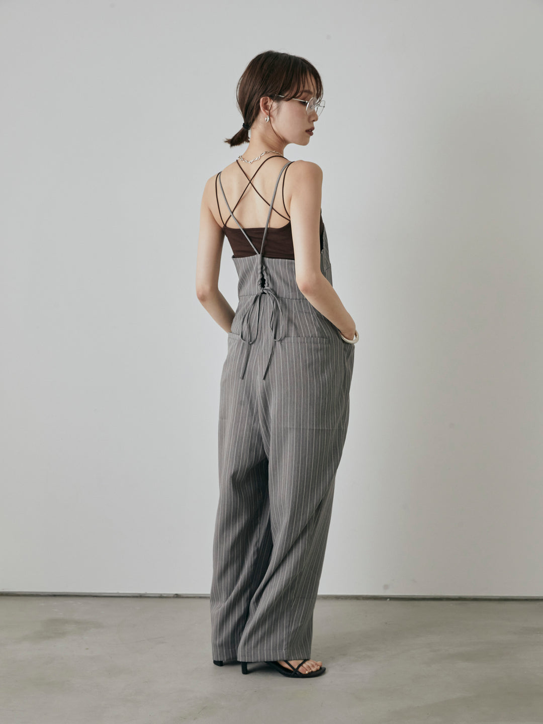 繊細なピンストライプとヘリンボーン織りが上品な印象を与える、大人のためのサロペット。 スクエアネックと深めのVライン切替が、すっきりと洗練されたスタイルを演出します。 ストンと落ちるワイドストレートシルエットで、体のラインを拾わず、リラクシーな着心地をキープ。 バックはゴム仕様でフィット感もあり、ストレスフリーに着用できます。 Tシャツやタンクとのカジュアル合わせはもちろん、シャツやジャケットを羽織ればオケージョンにも対応。 同素材のジャケットとセットアップで着用すれば、ハンサムモードなスタイルが完成します。
