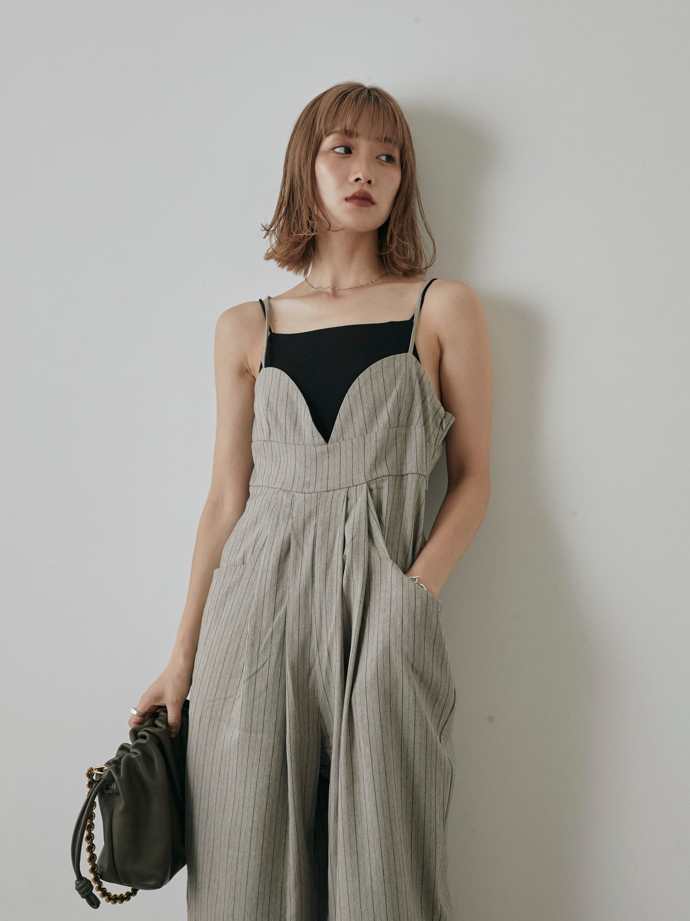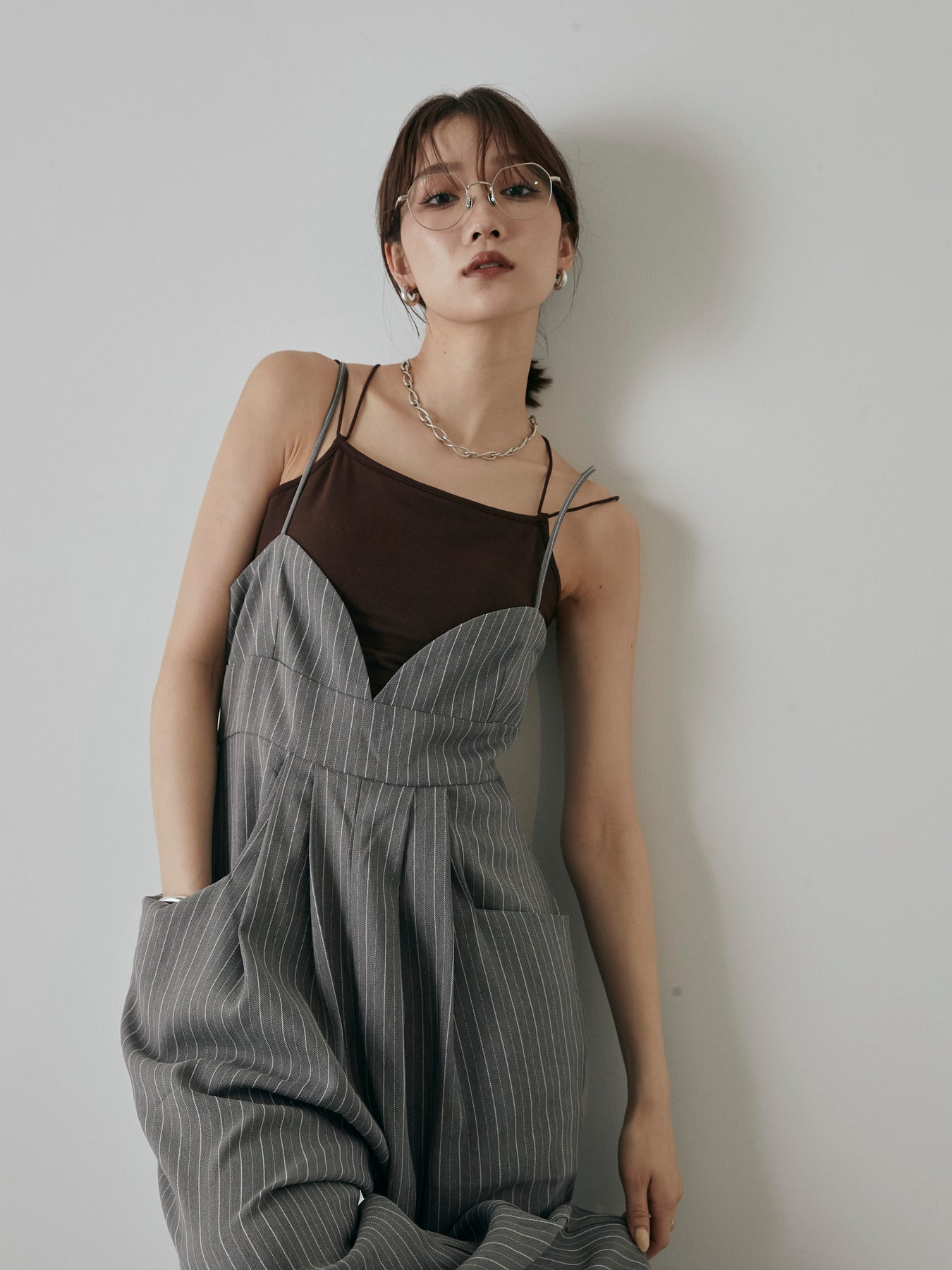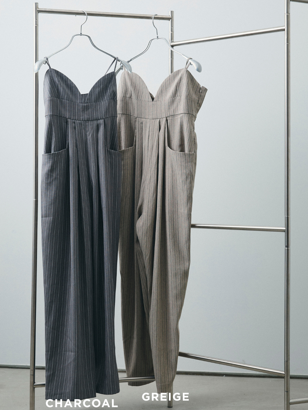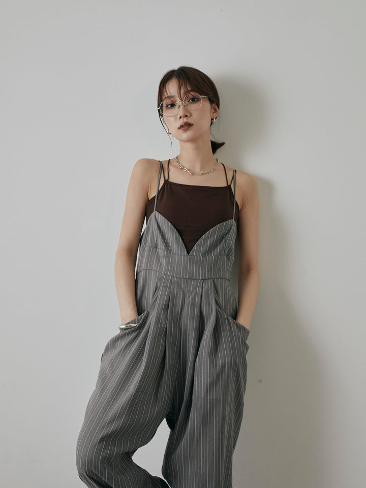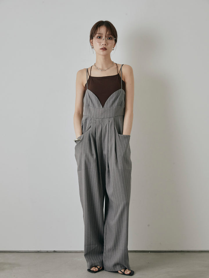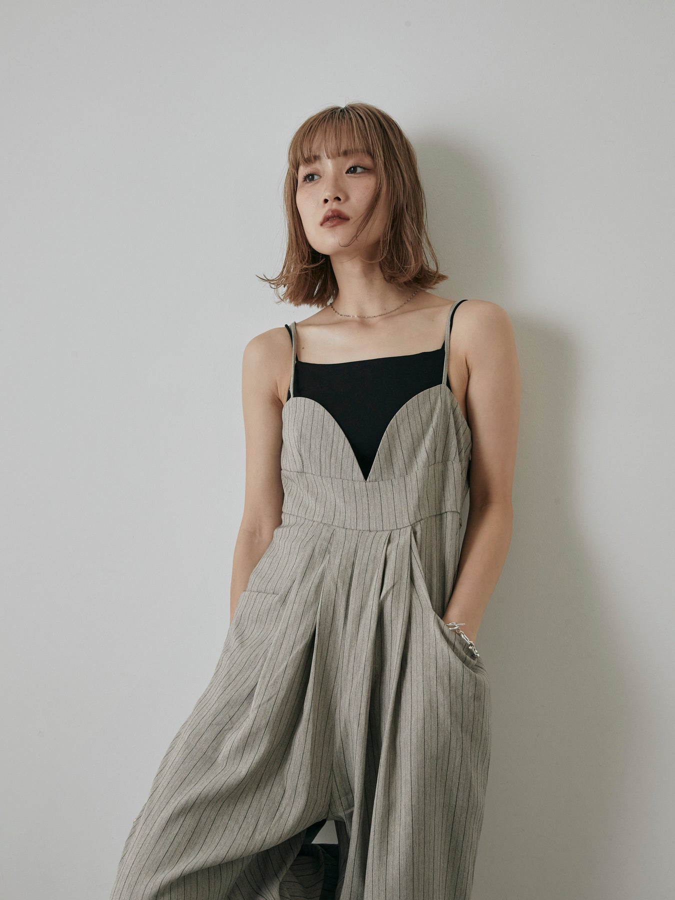 繊細なピンストライプとヘリンボーン織りが上品な印象を与える、大人のためのサロペット。 スクエアネックと深めのVライン切替が、すっきりと洗練されたスタイルを演出します。 ストンと落ちるワイドストレートシルエットで、体のラインを拾わず、リラクシーな着心地をキープ。 バックはゴム仕様でフィット感もあり、ストレスフリーに着用できます。 Tシャツやタンクとのカジュアル合わせはもちろん、シャツやジャケットを羽織ればオケージョンにも対応。 同素材のジャケットとセットアップで着用すれば、ハンサムモードなスタイルが完成します。