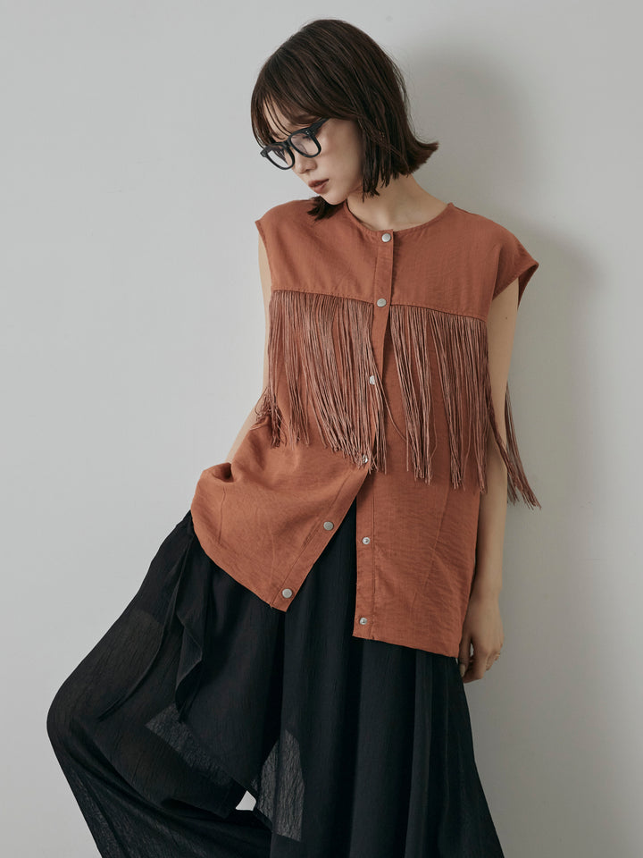フロントにたっぷり施されたフリンジが印象的な、主役級のノースリーブブラウス。 動くたびに揺れるフリンジが目を惹き、シンプルながらもコーデに華やかさと抜け感をプラスしてくれる一枚です。 ボディにはさらっとした肌触りのコットン混素材を使用し、軽やかで快適な着心地を実現。 肩まわりを程よくカバーするスリーブデザインで、ノースリーブ初心者にも取り入れやすいバランス感です。 パンツにもスカートにも合わせやすく、羽織りのインナーとしても存在感を放つ万能アイテム。 フロントはボタン開きで、前を開けてベスト風にも着こなせる2WAY仕様です。