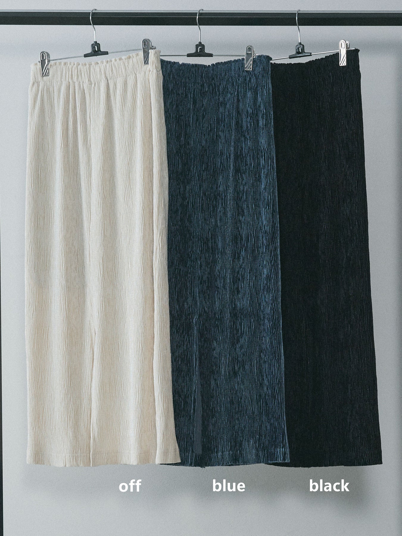 微光沢のあるベロア素材にプリーツを施したタイトシルエットのスカート。ヒップラインから裾にかけて緩やかに広がるシルエットで女性らしさを演出しつつ、ウエストは総ゴム仕様で着脱も快適。ニットやシャツ、アウターとの相性も良く、秋冬のスタイリングに品のあるアクセントをプラスします。