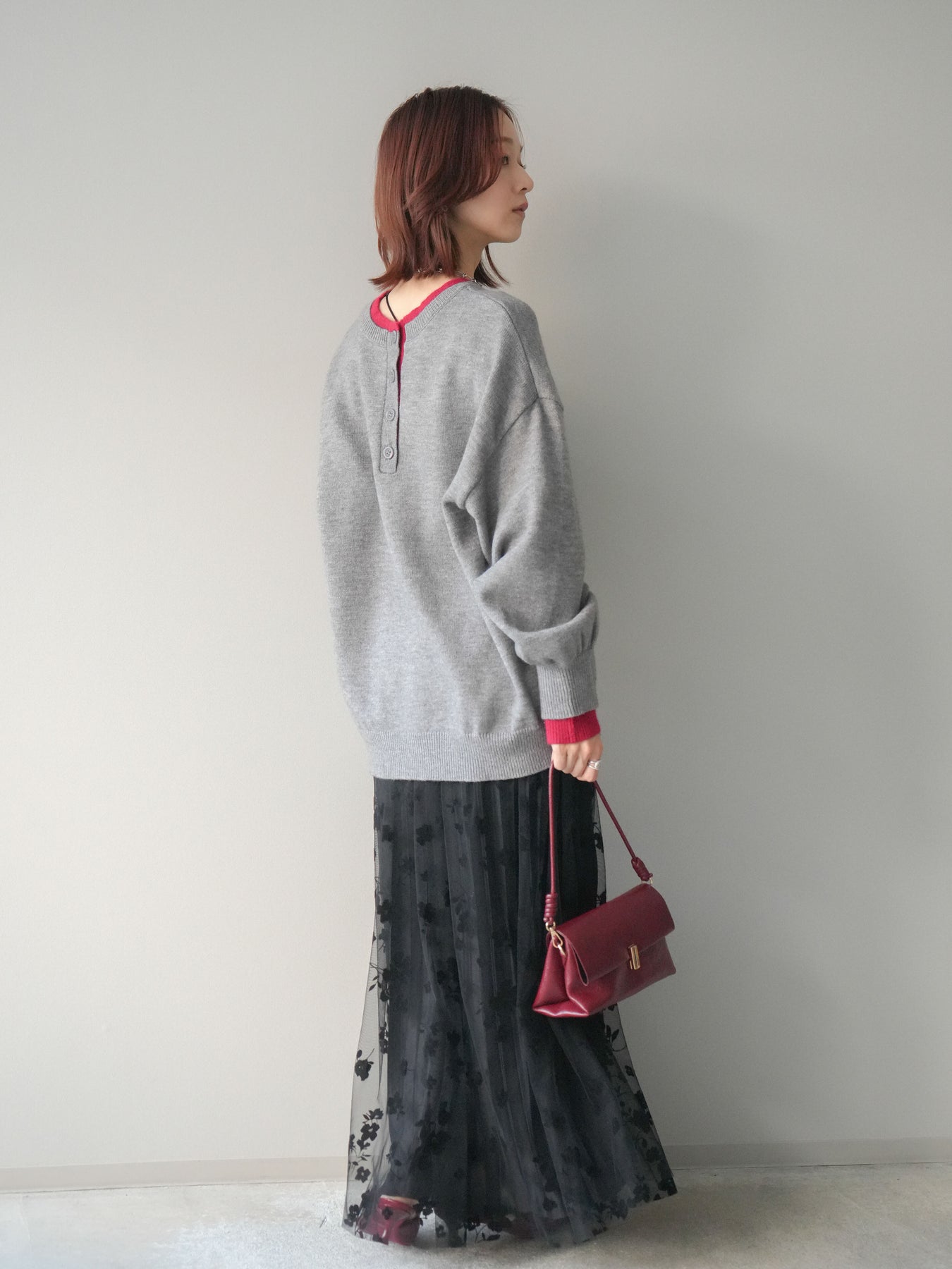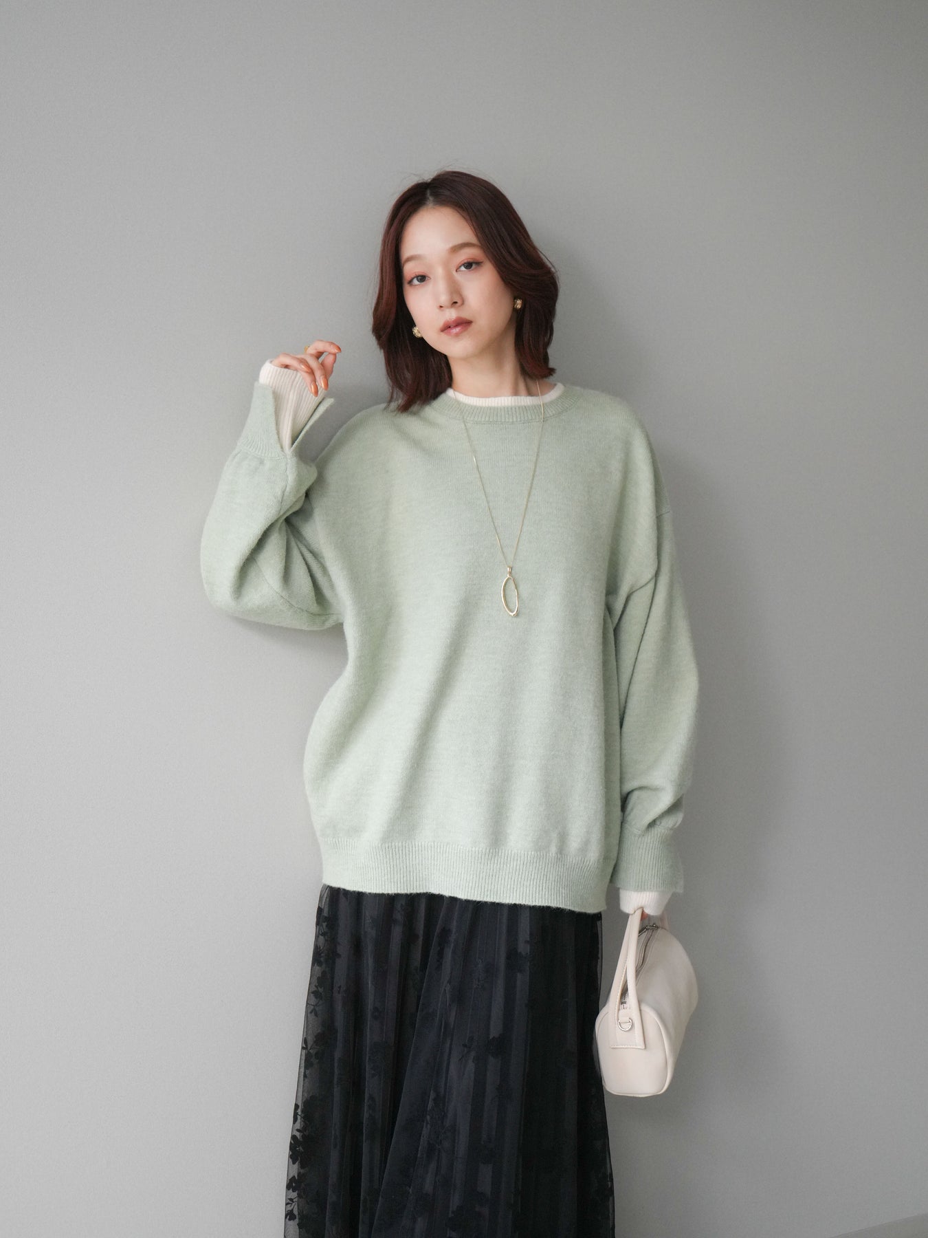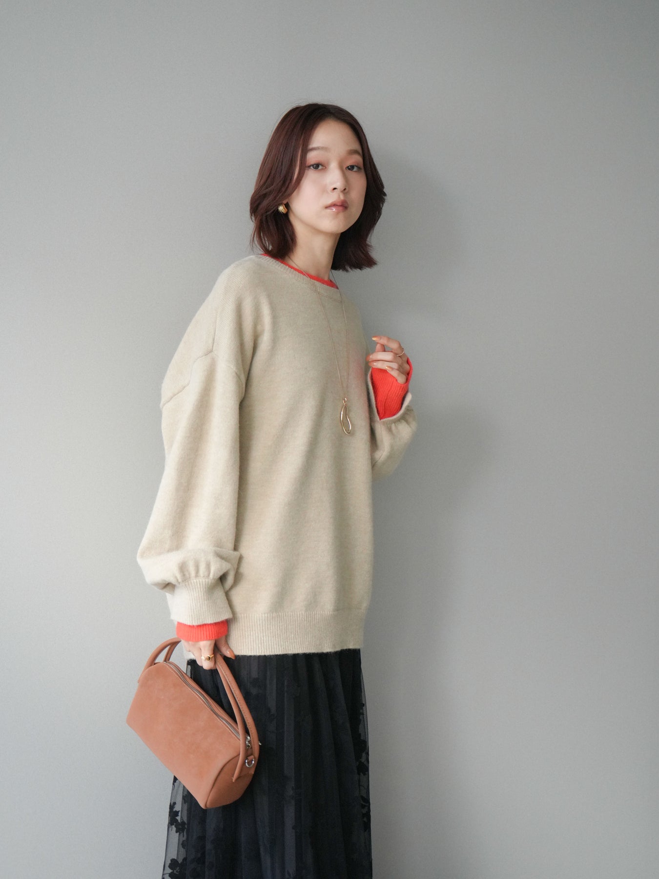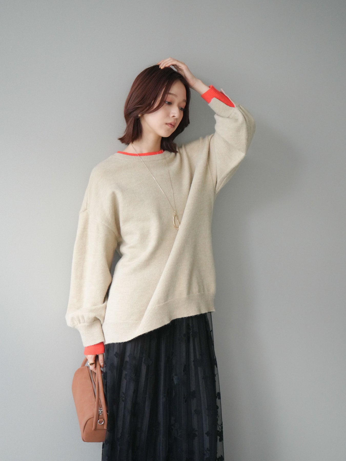 ヘンリーネックデザインのインナーを重ね着したように見える、配色レイヤード風のニットプルオーバー。首元と袖口からのぞく差し色がコーデ全体にリズムを与え、シンプルながらも抜け感のある着こなしを叶えます。ニットは柔らかな肌触りでゆったりとしたシルエットに仕上げ、デイリーに取り入れやすいリラクシーな着心地が魅力。パンツにもスカートにも合わせやすく、1枚でバランスよくスタイリングが決まる万能アイテムです。 ※ボトムス、キャミソール(インナー)以外の商品は一律でインナーは付属していません。